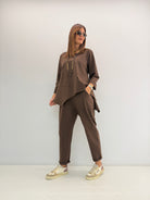 Pantalone con fascia elasticizzata in vita, senza chiusure ,tasche laterali a lunetta, pinces davanti. Vestibilità comoda
