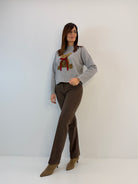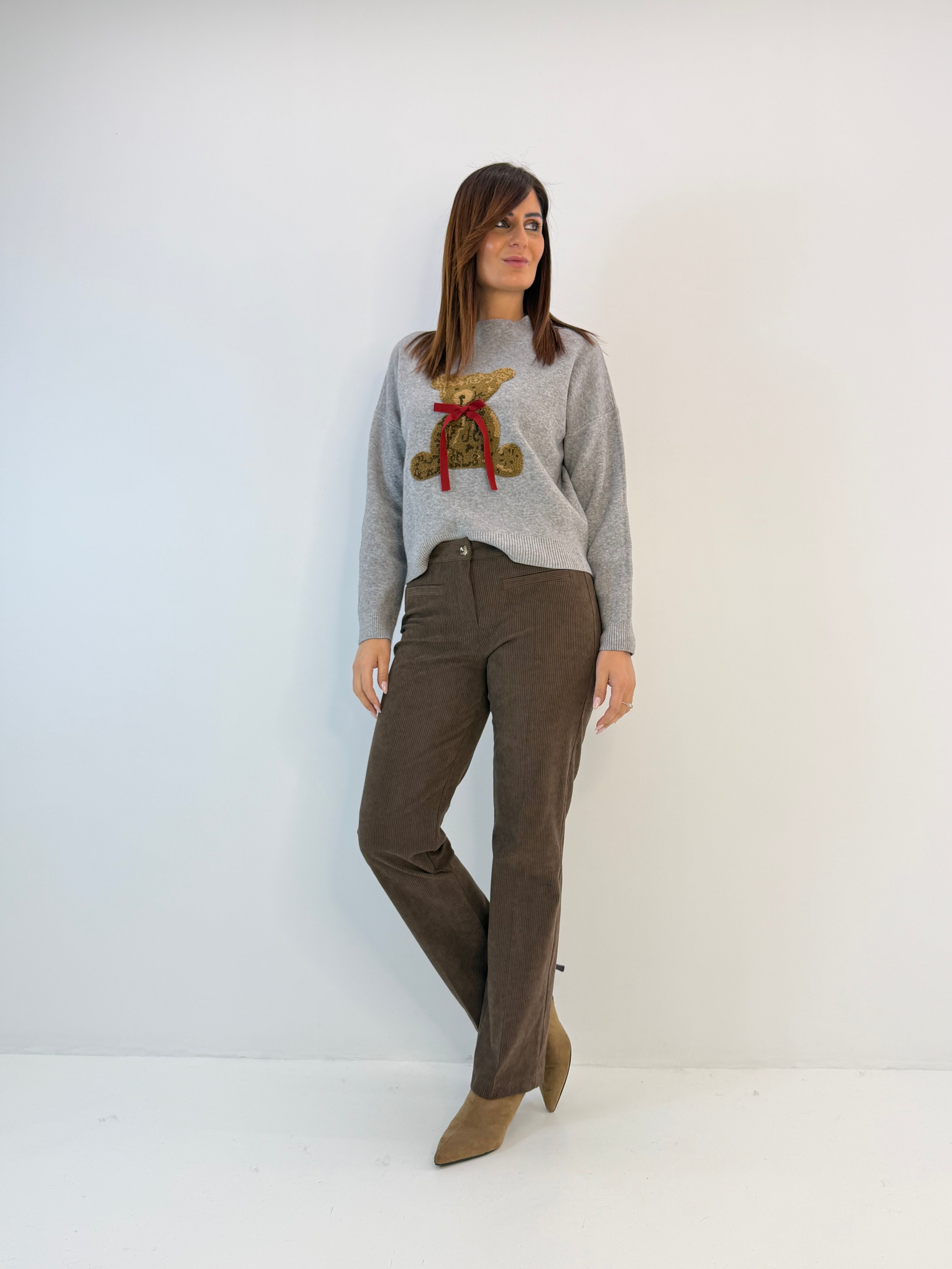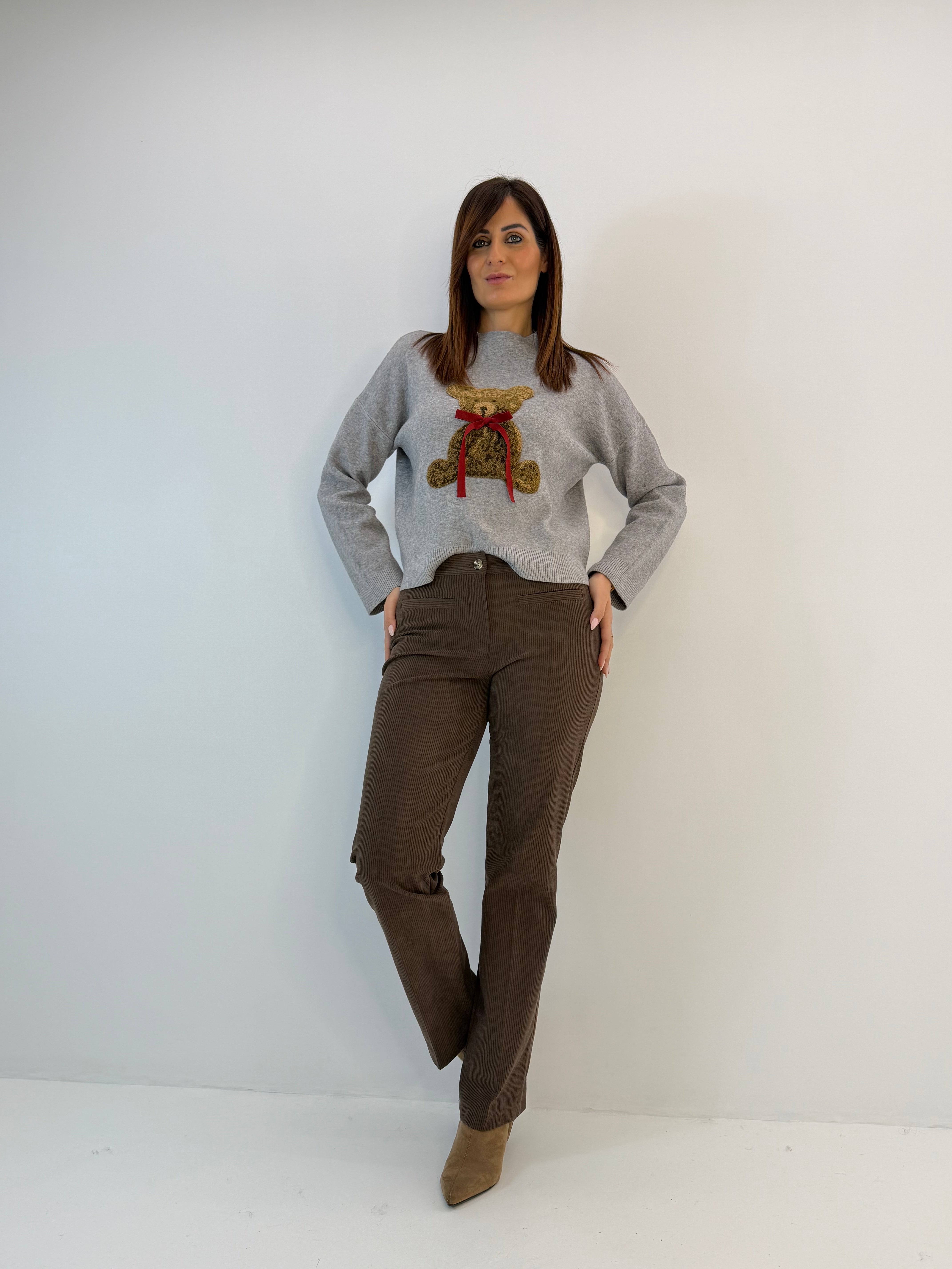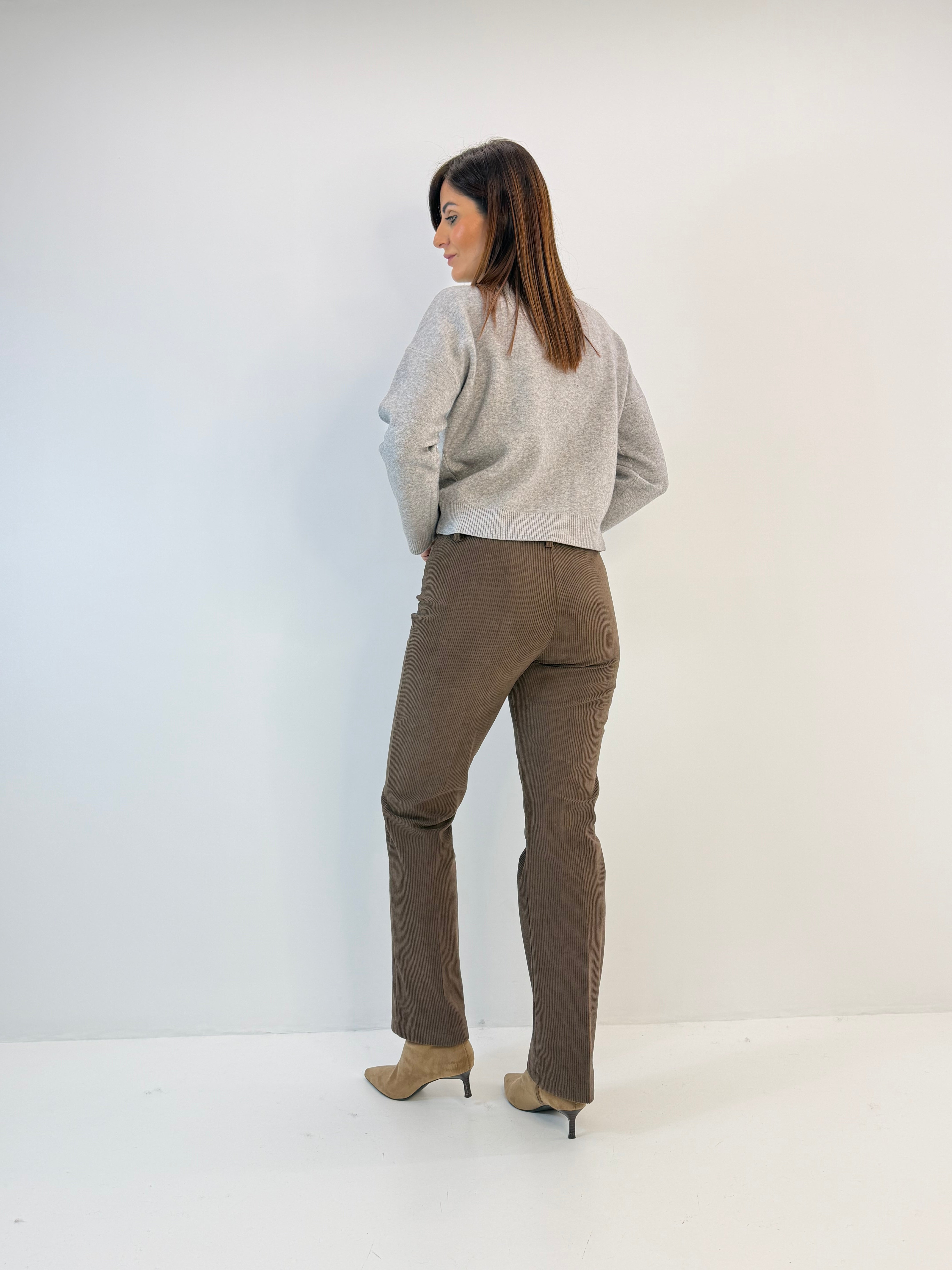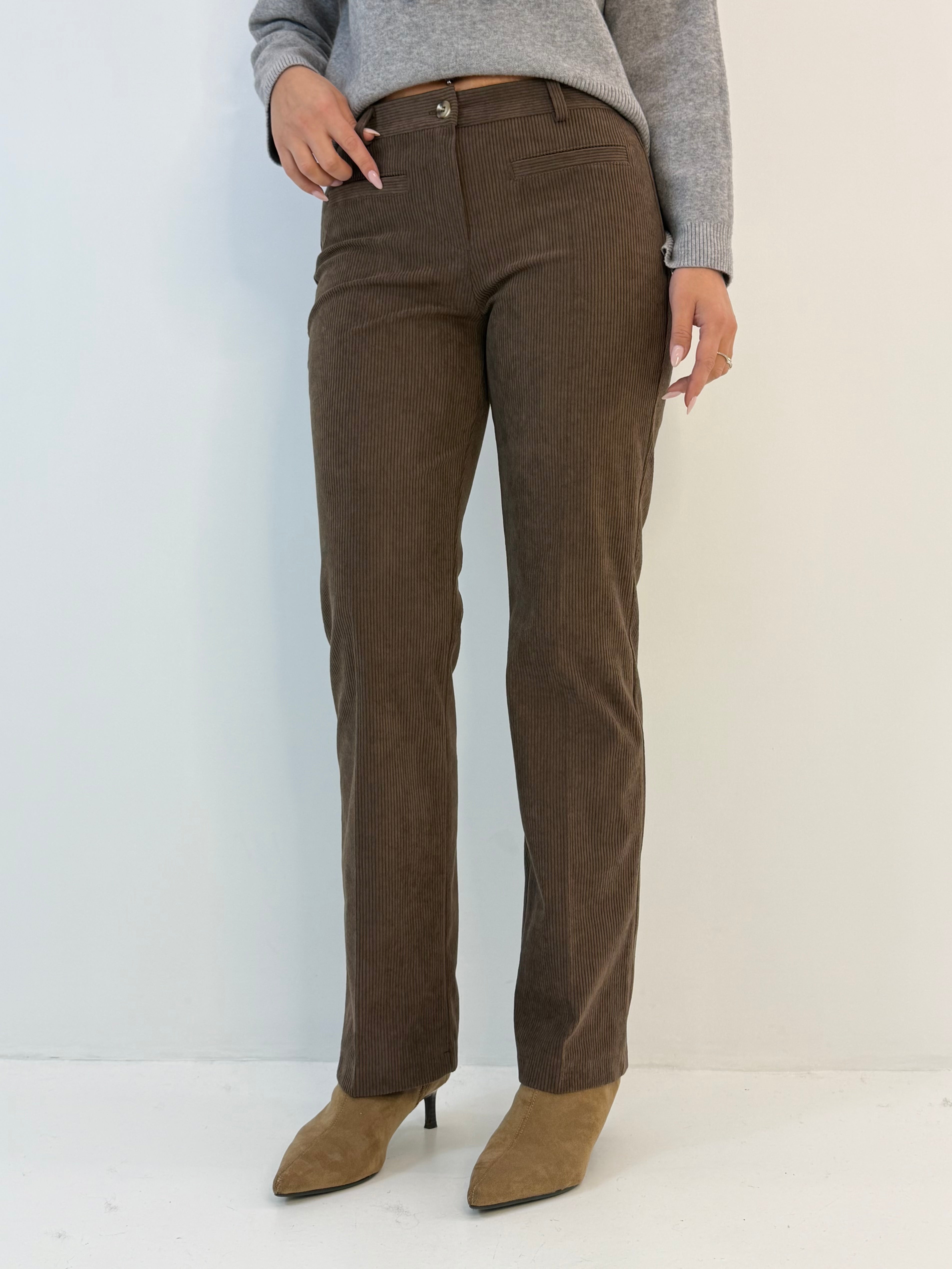 Pantaloni in velluto a costine con gamba dritta, elastico in vita dietro, chiusura con zip e bottone, passanti per cintura e finte tasche a filetto davanti.