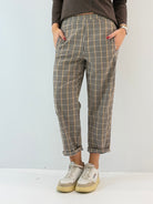 Pantaloni in tessuto misto cotone a quadretti in tonalità autunnale. Vita alta con fascia elasticizzata, tasche laterali a scomparsa e cavallo regolare. Taglio morbido. Senza chiusure. Tasca applicata sul retro. Vestibilità comoda.