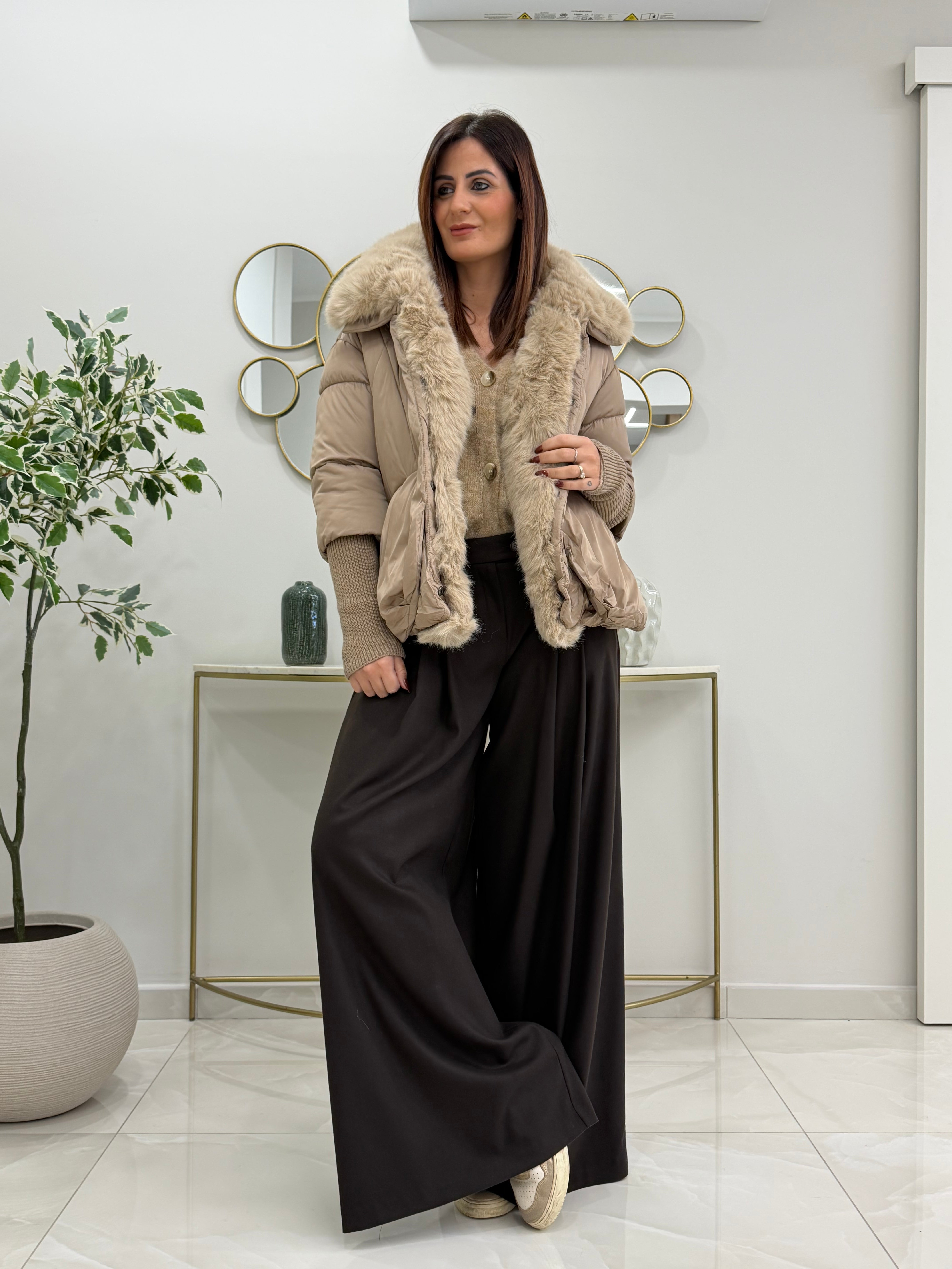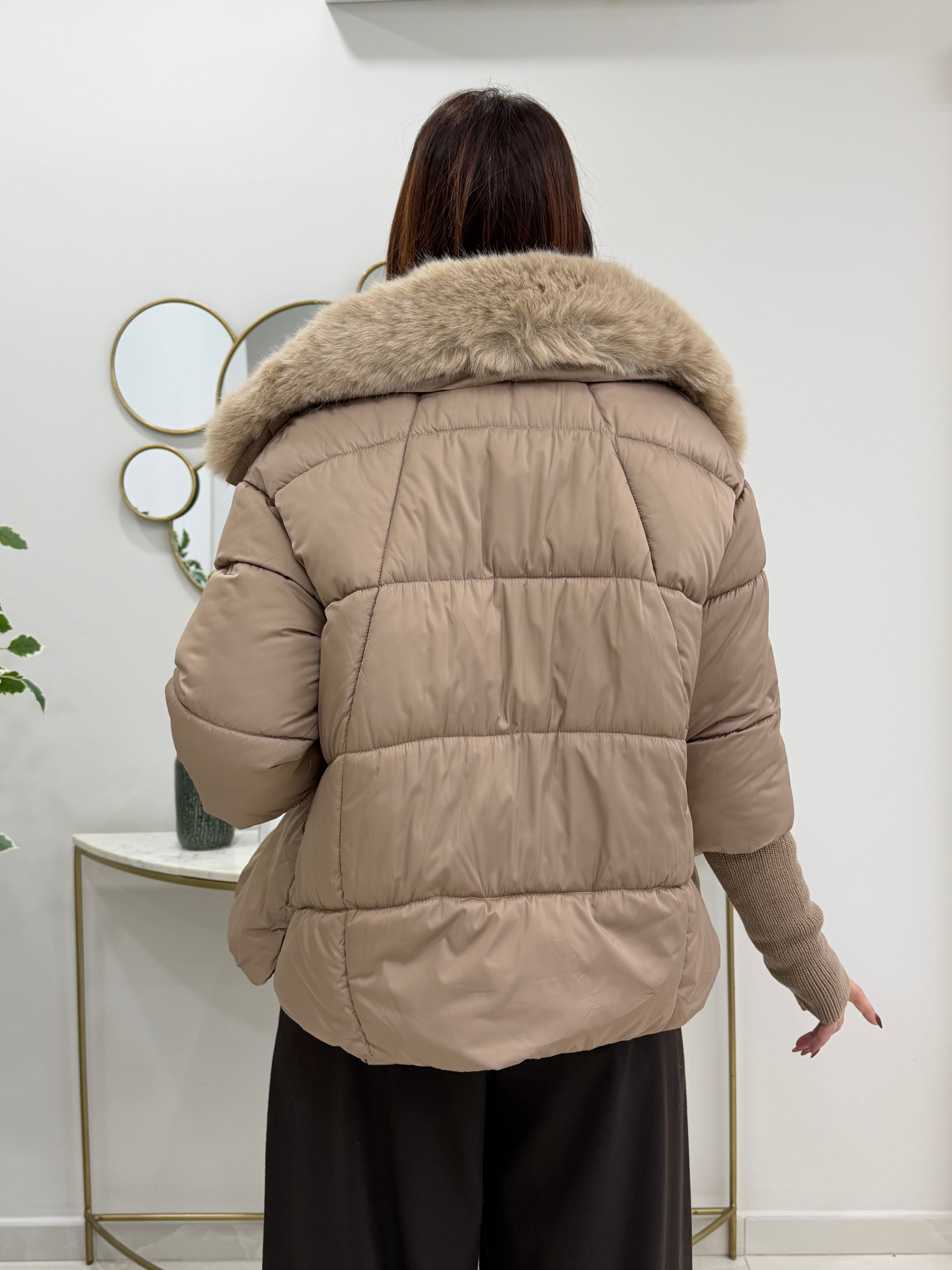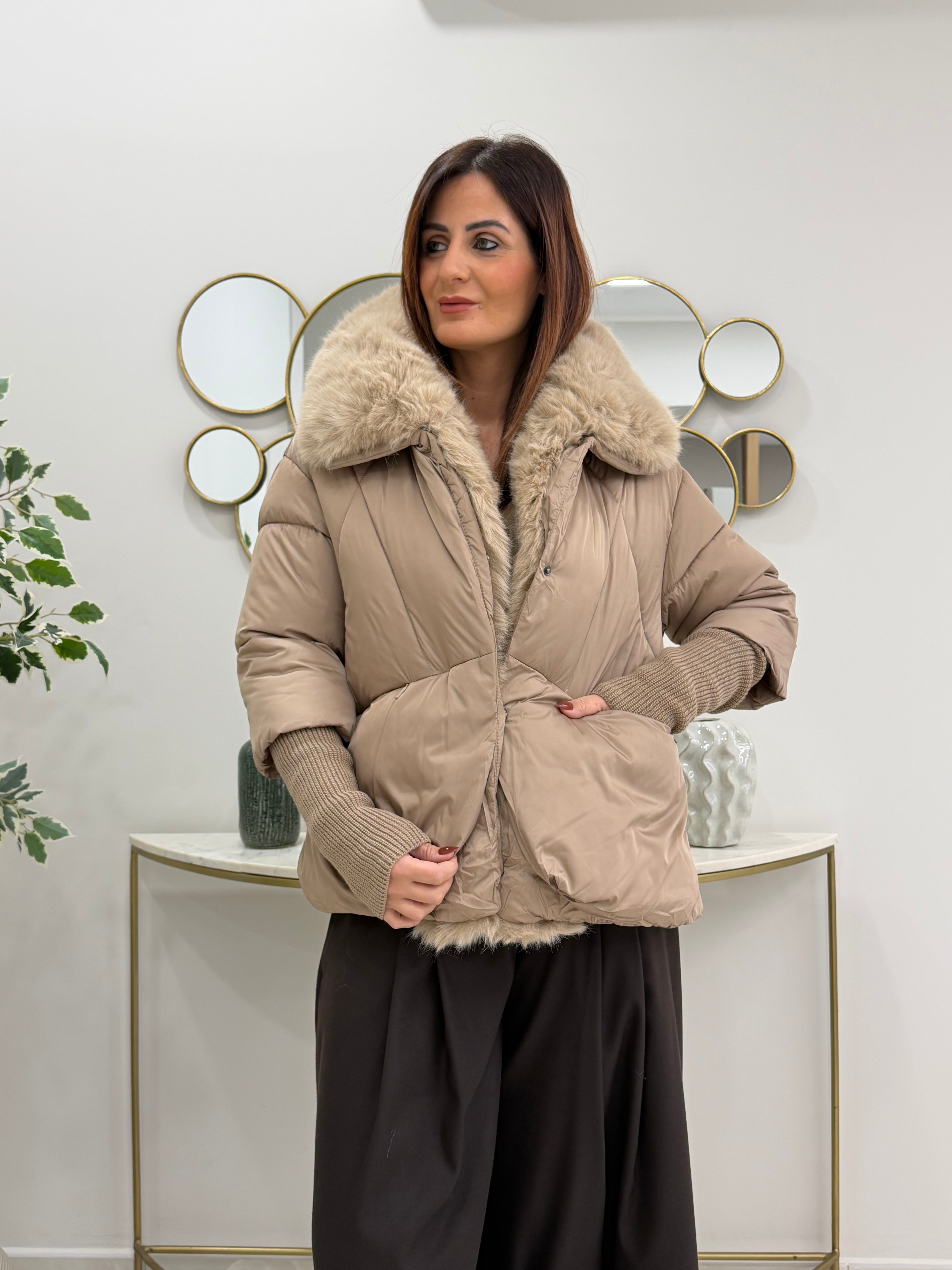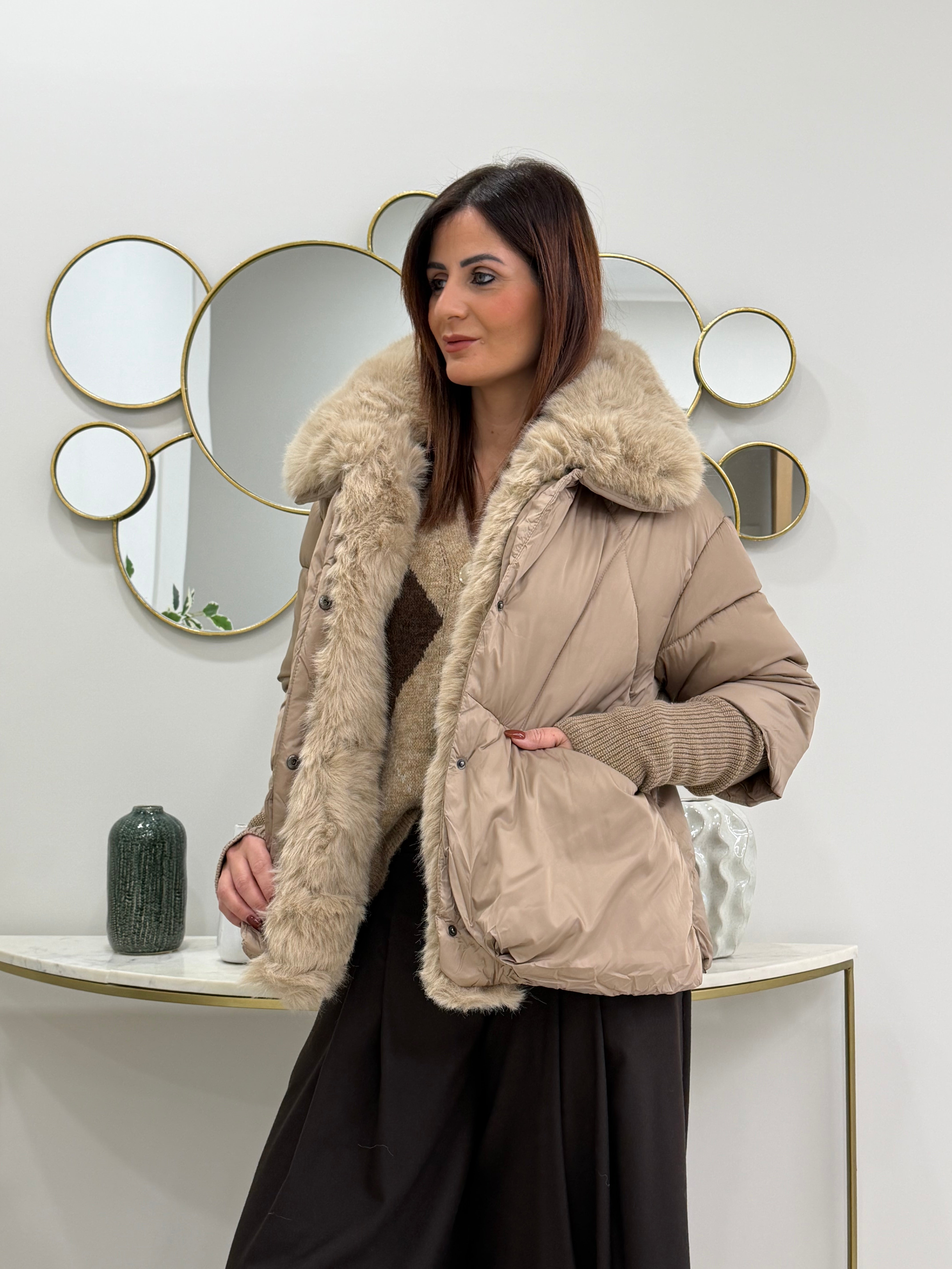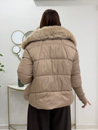 Piumino imbottito, rifinito con morbida pelliccia ecologica removibile sul collo e lungo l'interno, taglio leggermente svasato e polsini in maglia, un capo ideale per chic cerca calore stile e qualità