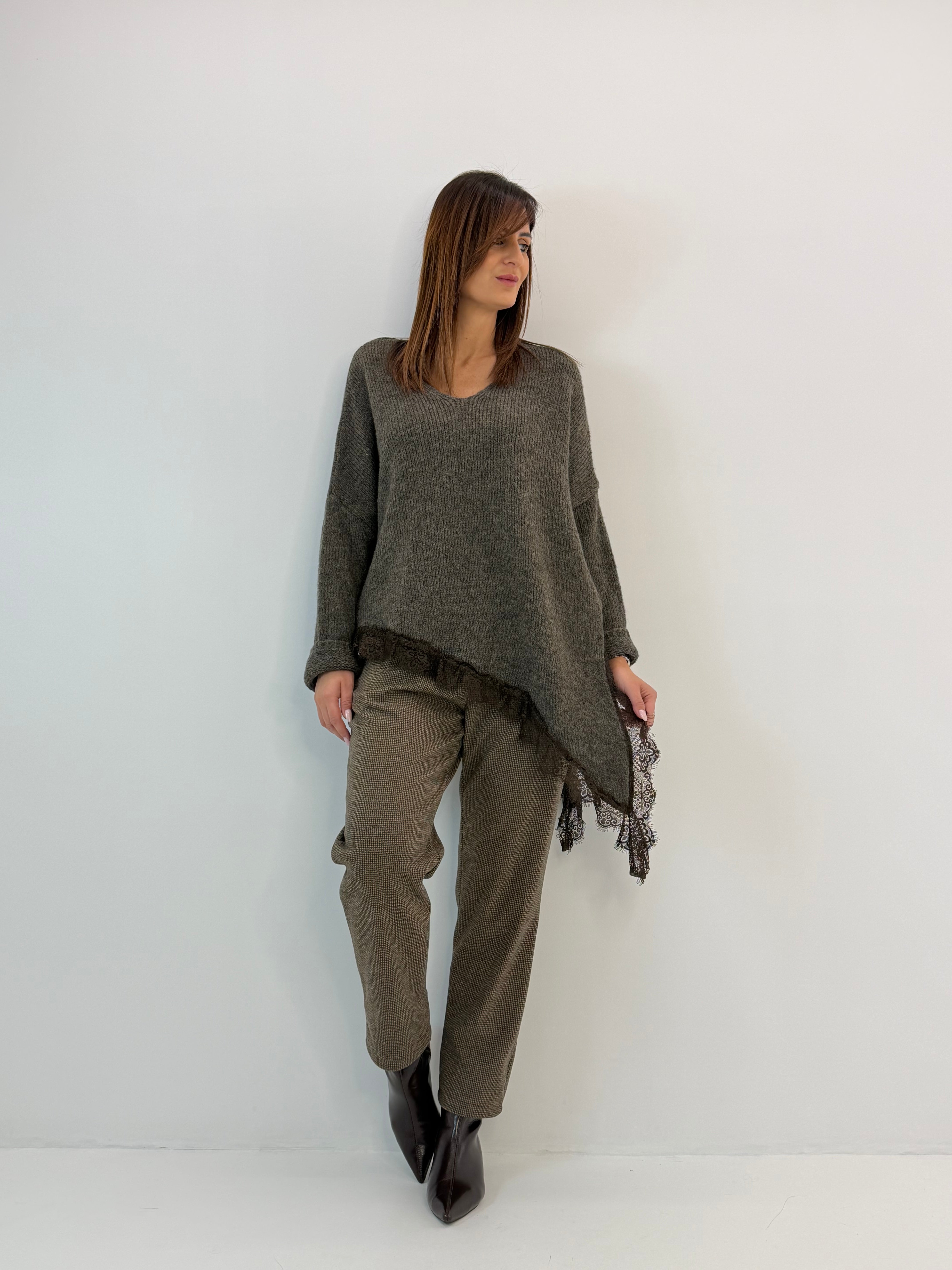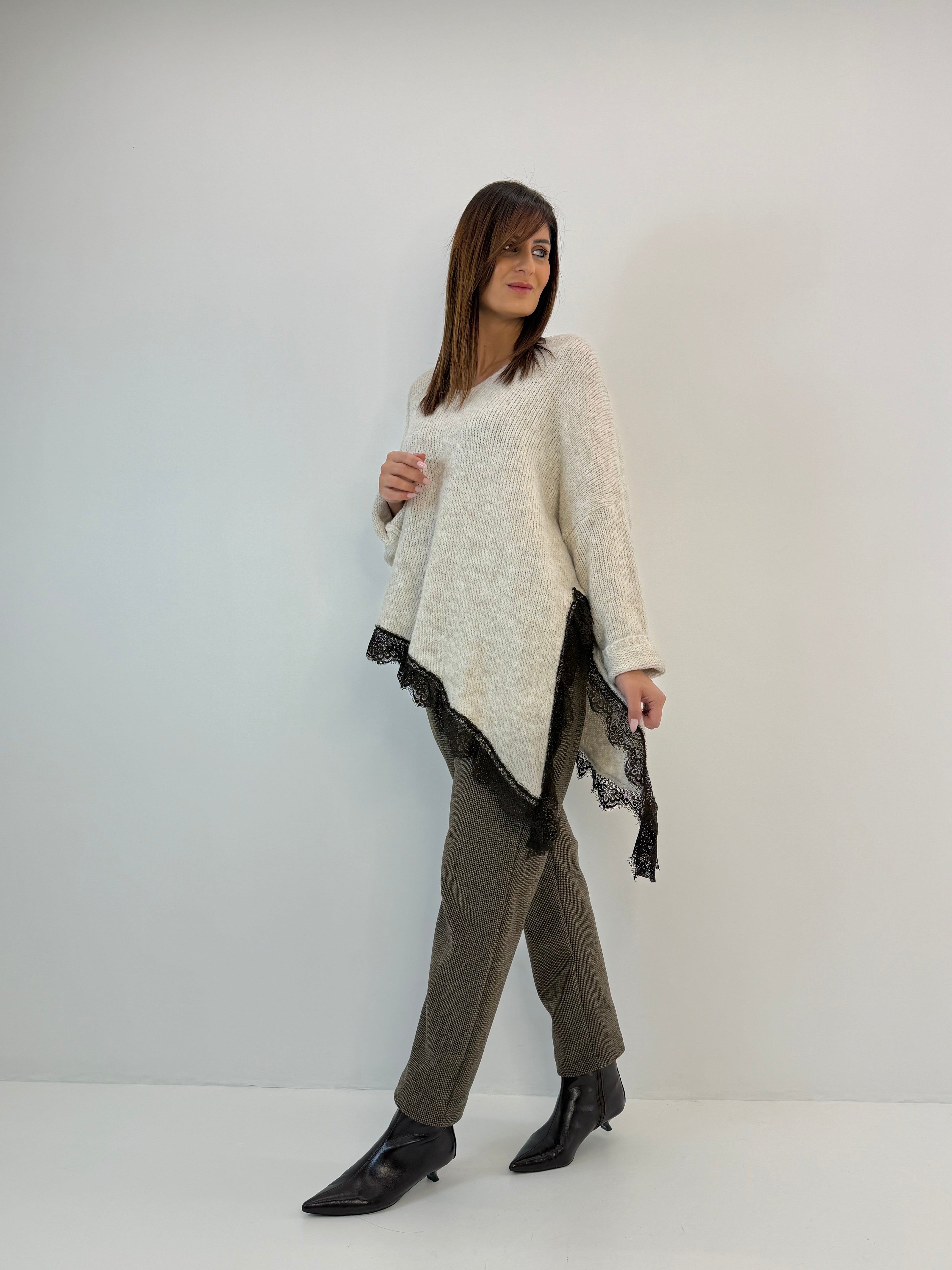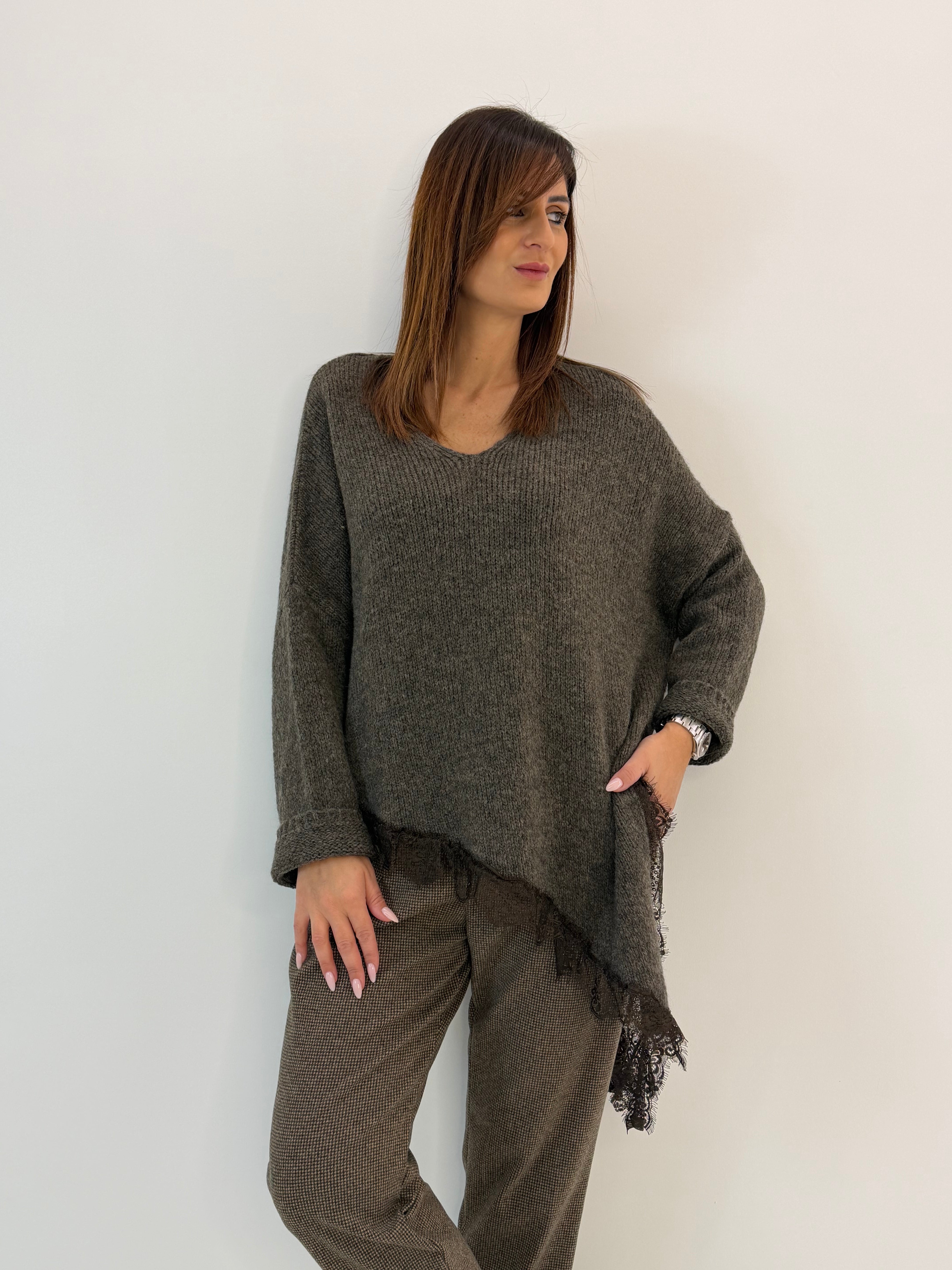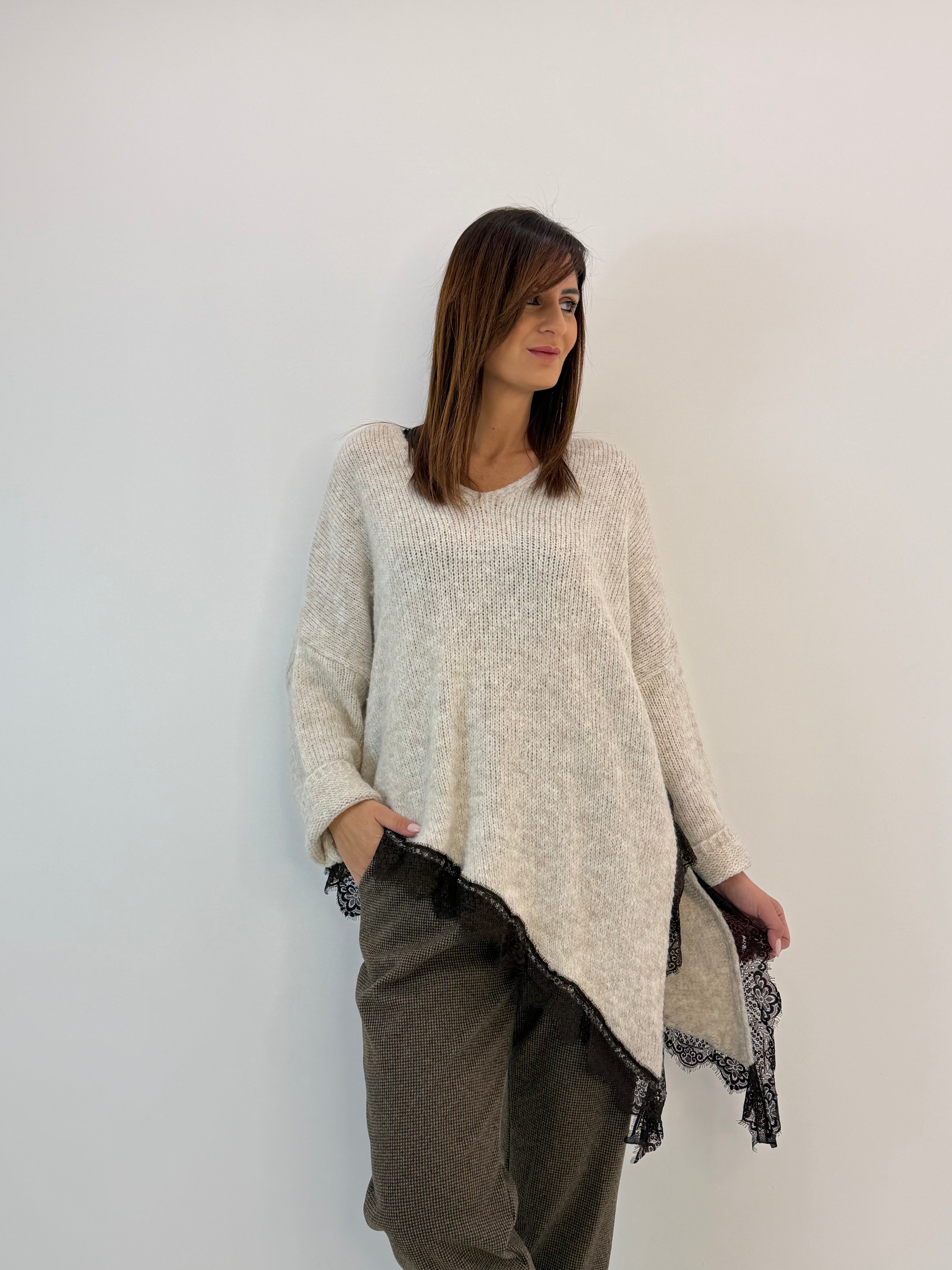 Pull con scollo a V e spalla morbida. Maniche lunghe. Taglio morbido e asimmetrico, punta laterale e spacchetto laterale, orlo con inserto in pizzo. Senza chiusure. Comoda vestibilità.
