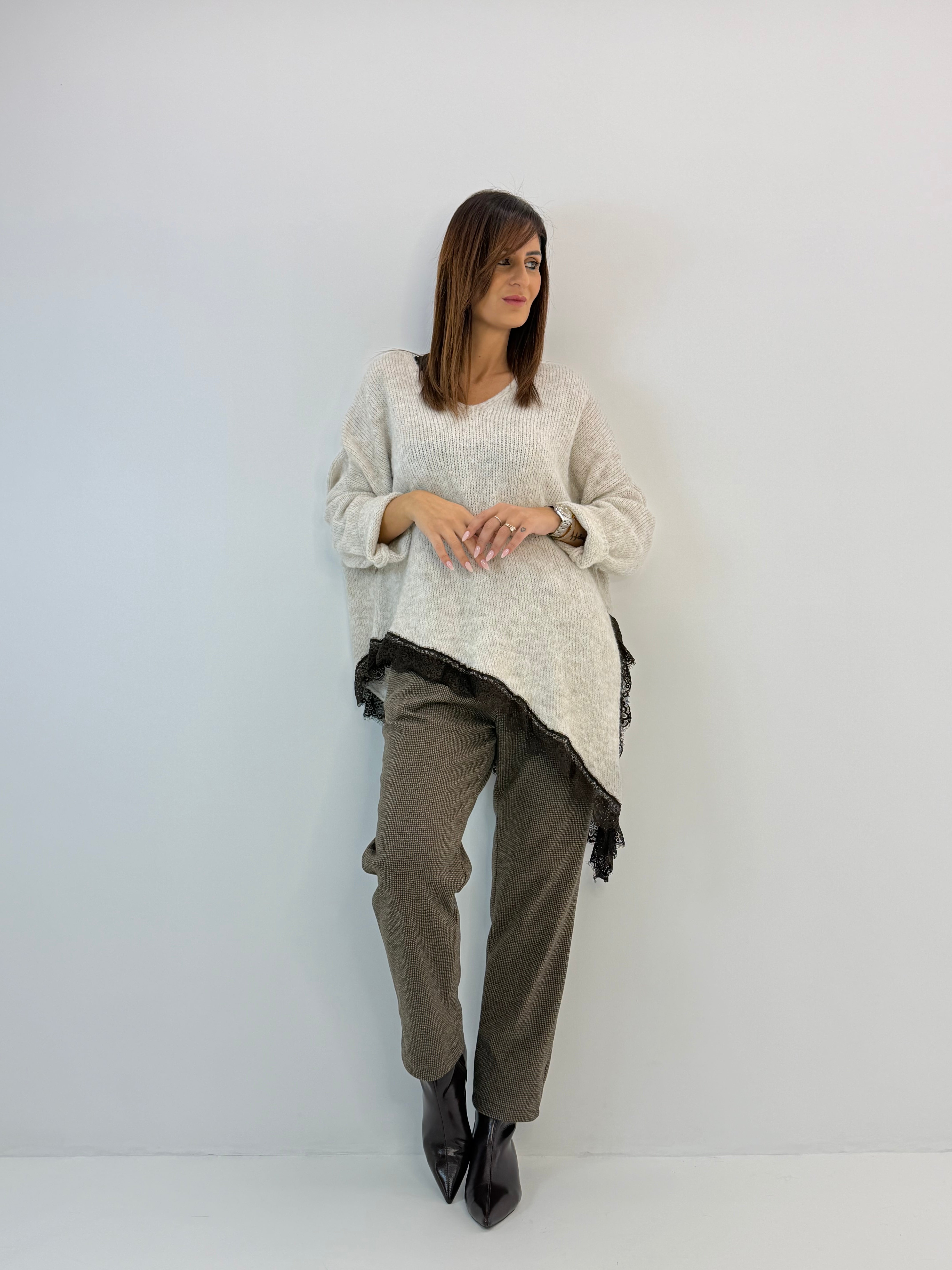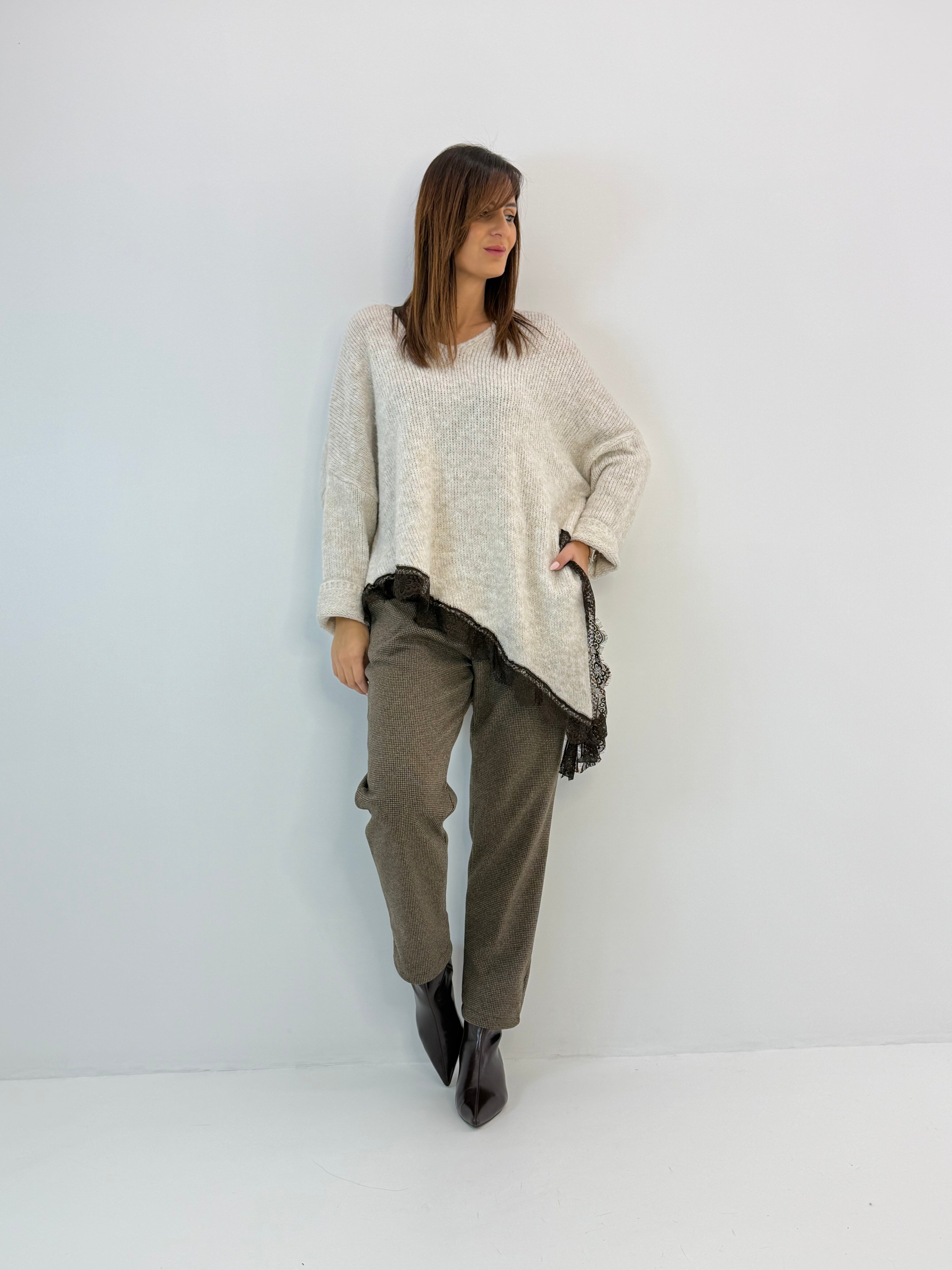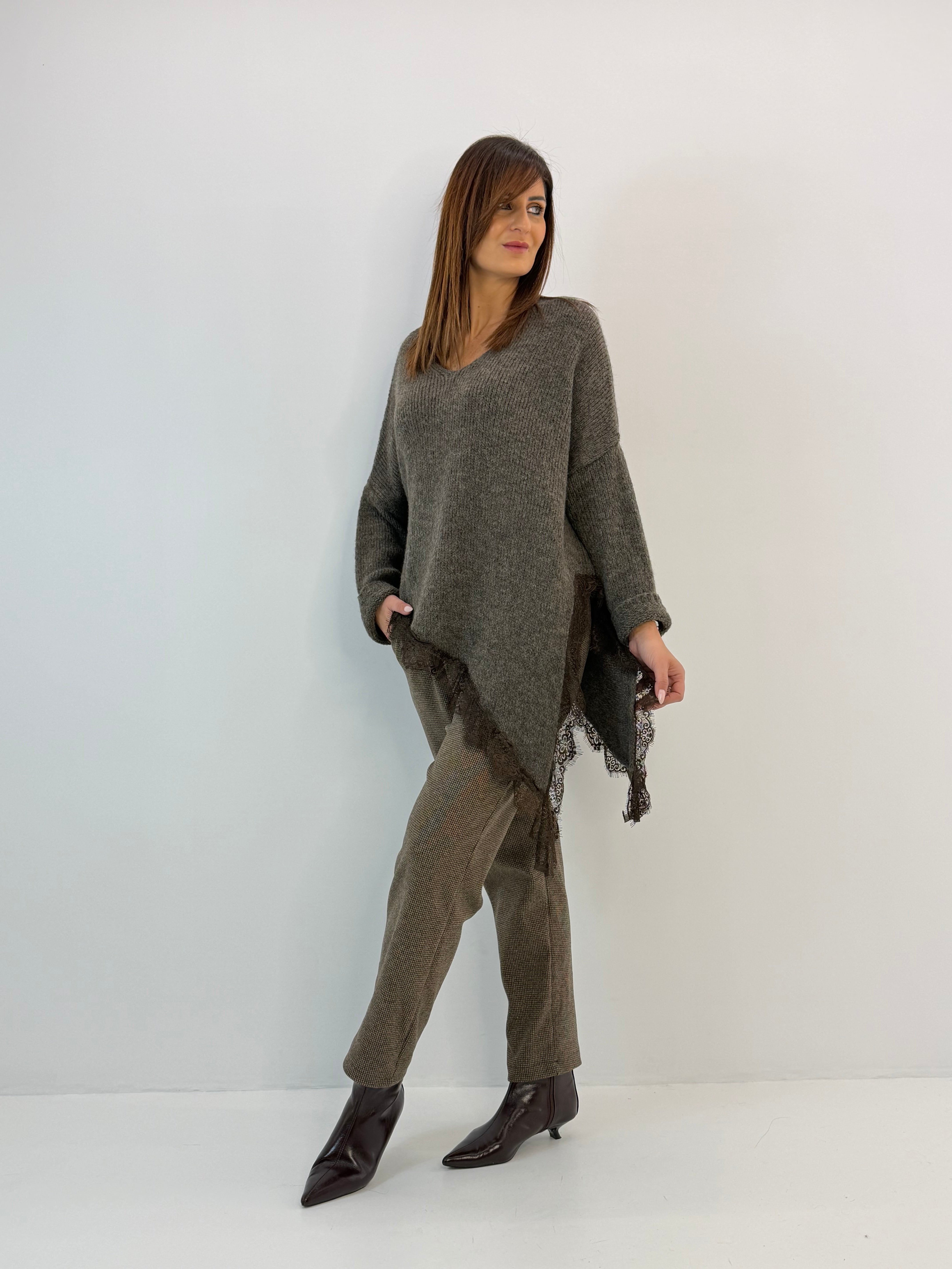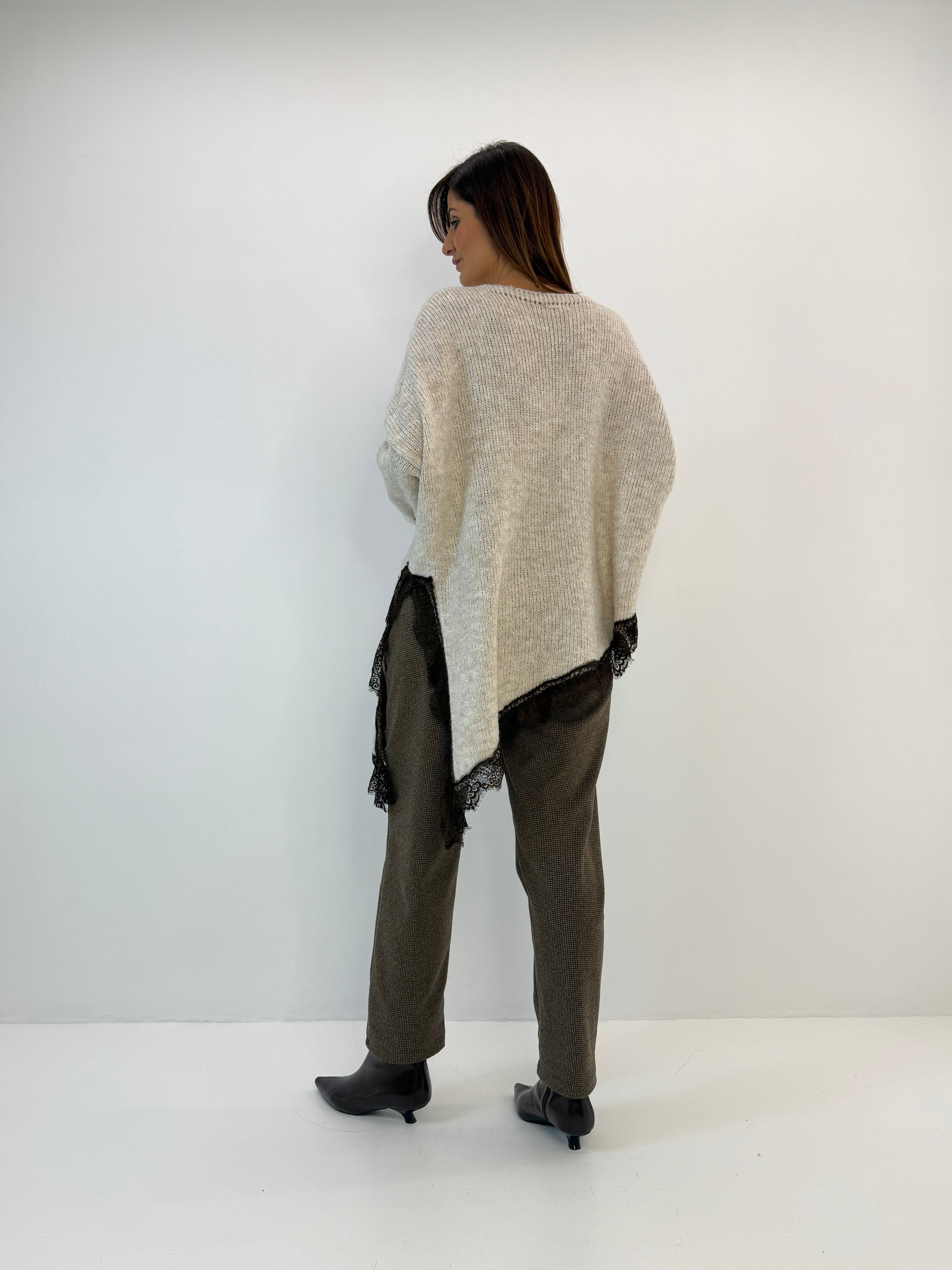 Pull con scollo a V e spalla morbida. Maniche lunghe. Taglio morbido e asimmetrico, punta laterale e spacchetto laterale, orlo con inserto in pizzo. Senza chiusure. Comoda vestibilità.