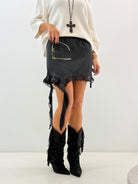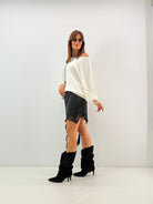 Stivale effetto scamosciato, frange laterali e arricciato sia sul davanti che sul dietro, con tacchetto. Sarà il protagonista di questa stagione. Moderno, versatile e comodo