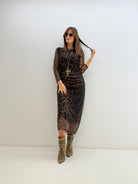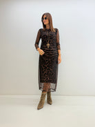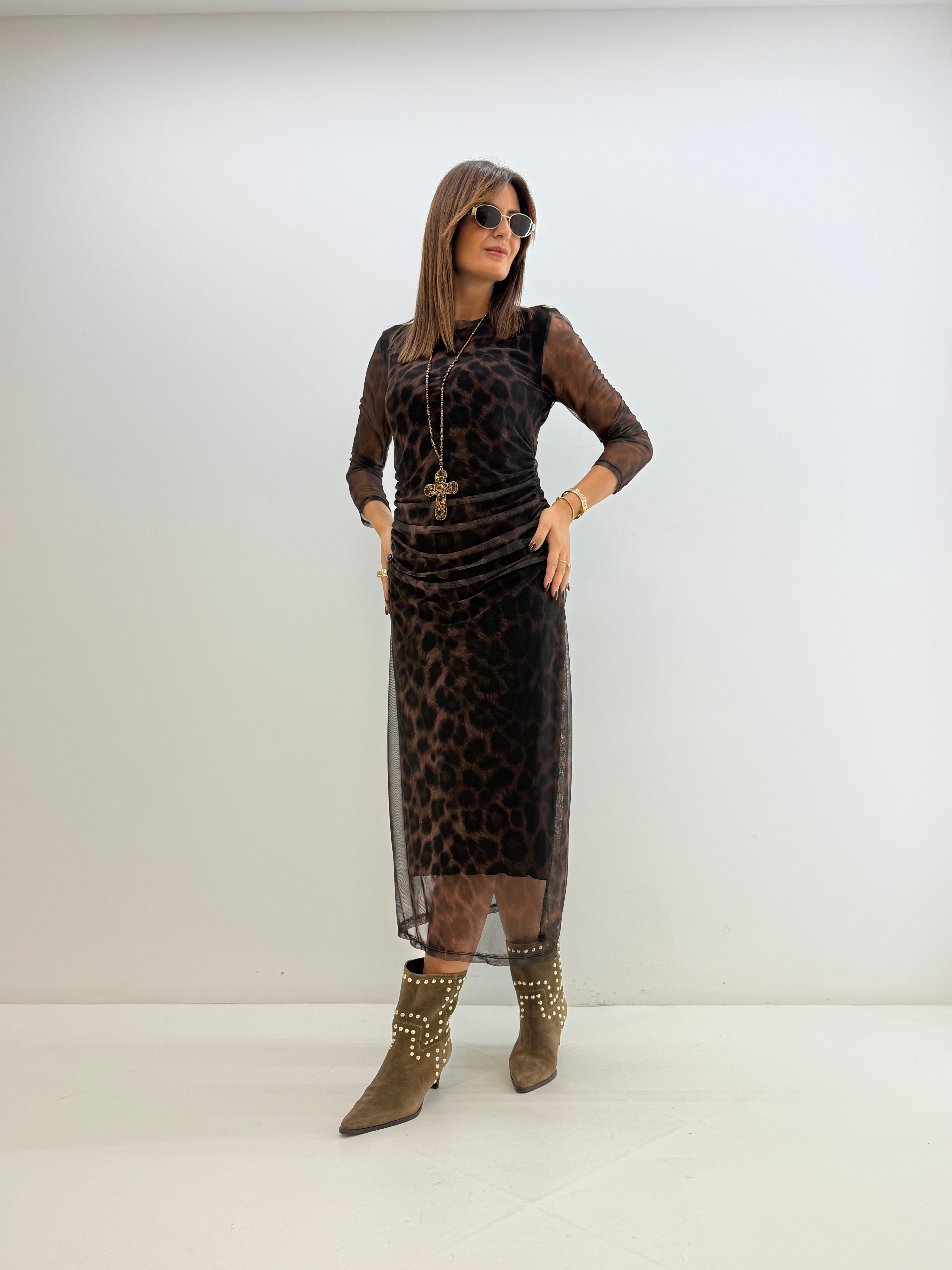 Abito in tulle, elasticizzato, in fantasia, scollo rotondo, arricciature laterali in vita. Senza chiusure, sottoveste interna.