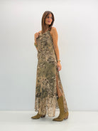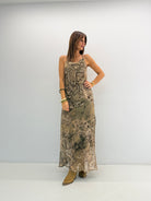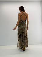 Abito, senza chiusure, spalline regolabili e con incrocio sul retro. Scollato sul retro. Spacco laterale.