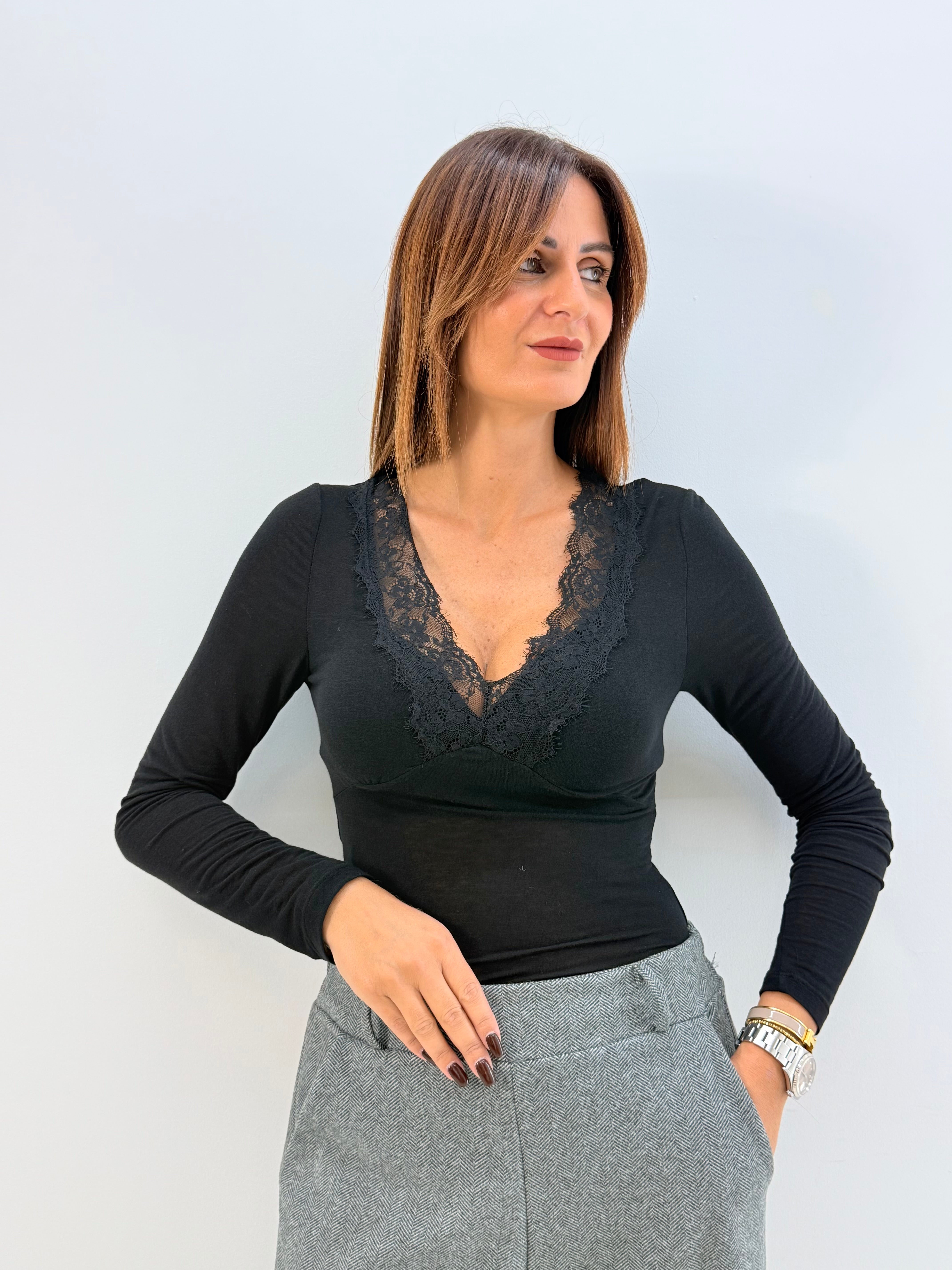 Body con scollo a V, applicazione di pizzo sullo scollo, chiusura con bottoncini nella parte finale.