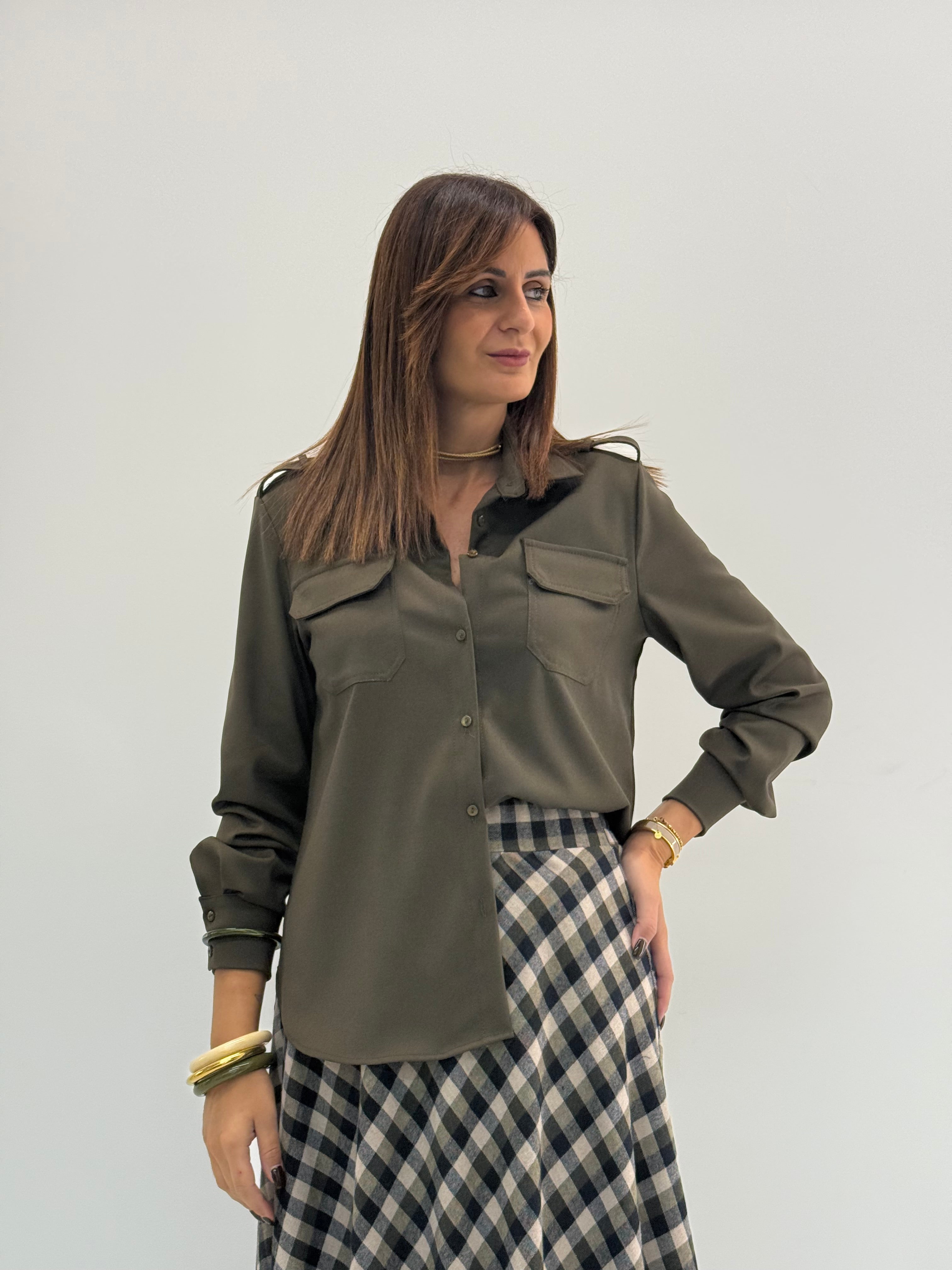 Camicia over, chiusura con bottoncini, tasche con patta sul davanti.