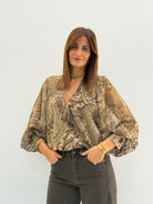 Camicia in fantasia con scollo a V, orlo con elastico.