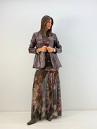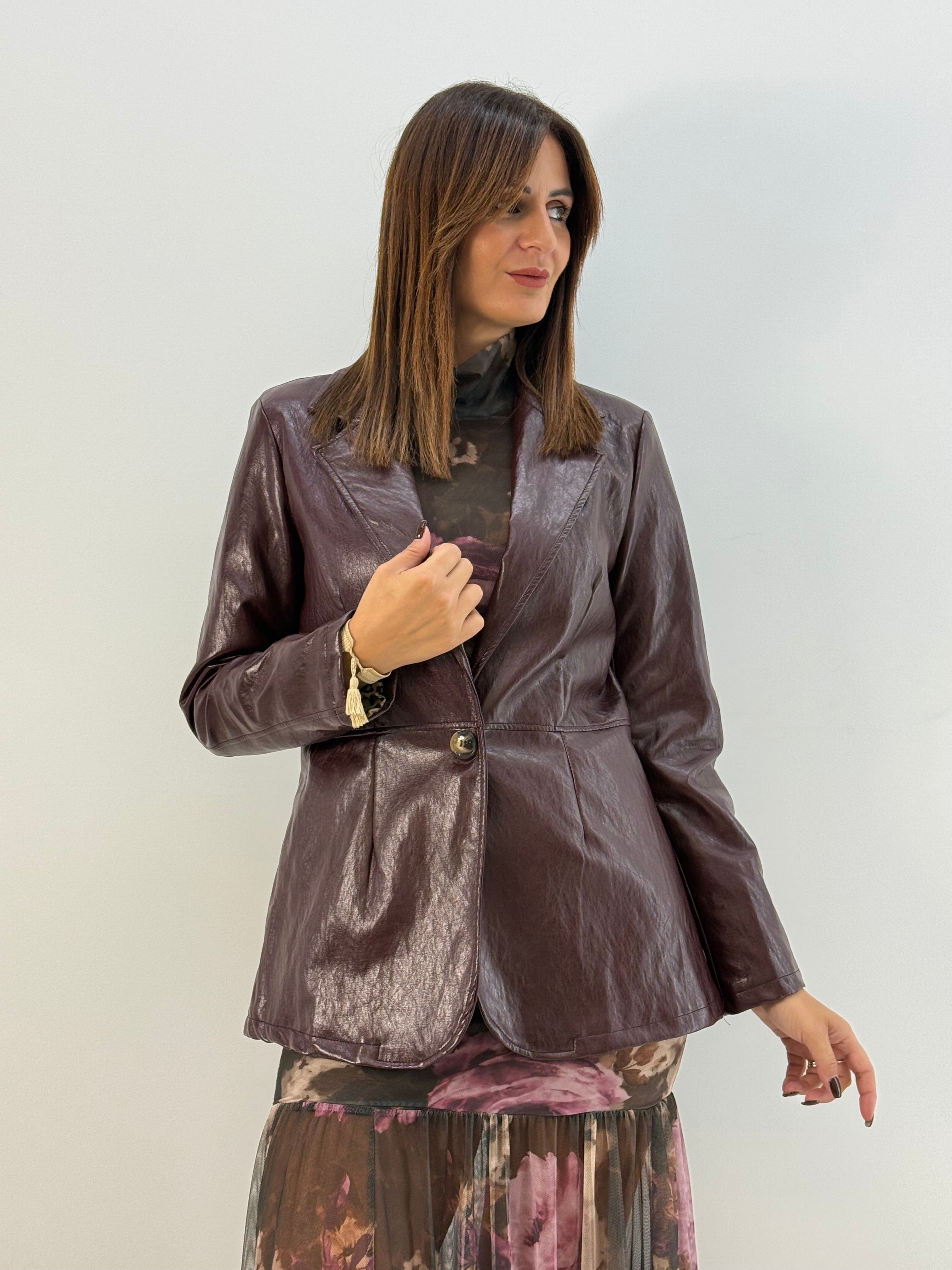 Giacca in ecopelle, fodera interna, colletto rever e chiusura frontale con bottone.