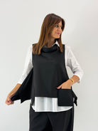 Gilet smanicato. Scollo rotondo con collo alto. Tasche applicate frontali con orlo lasciato libero. Linea leggermente svasata. Vestibilità comoda.