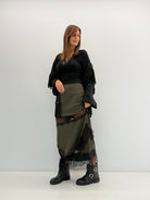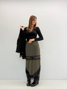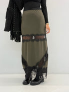 Gonna effetto satin, con elastico in vita, inserti in pizzo.