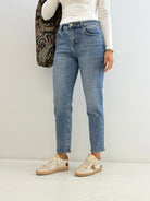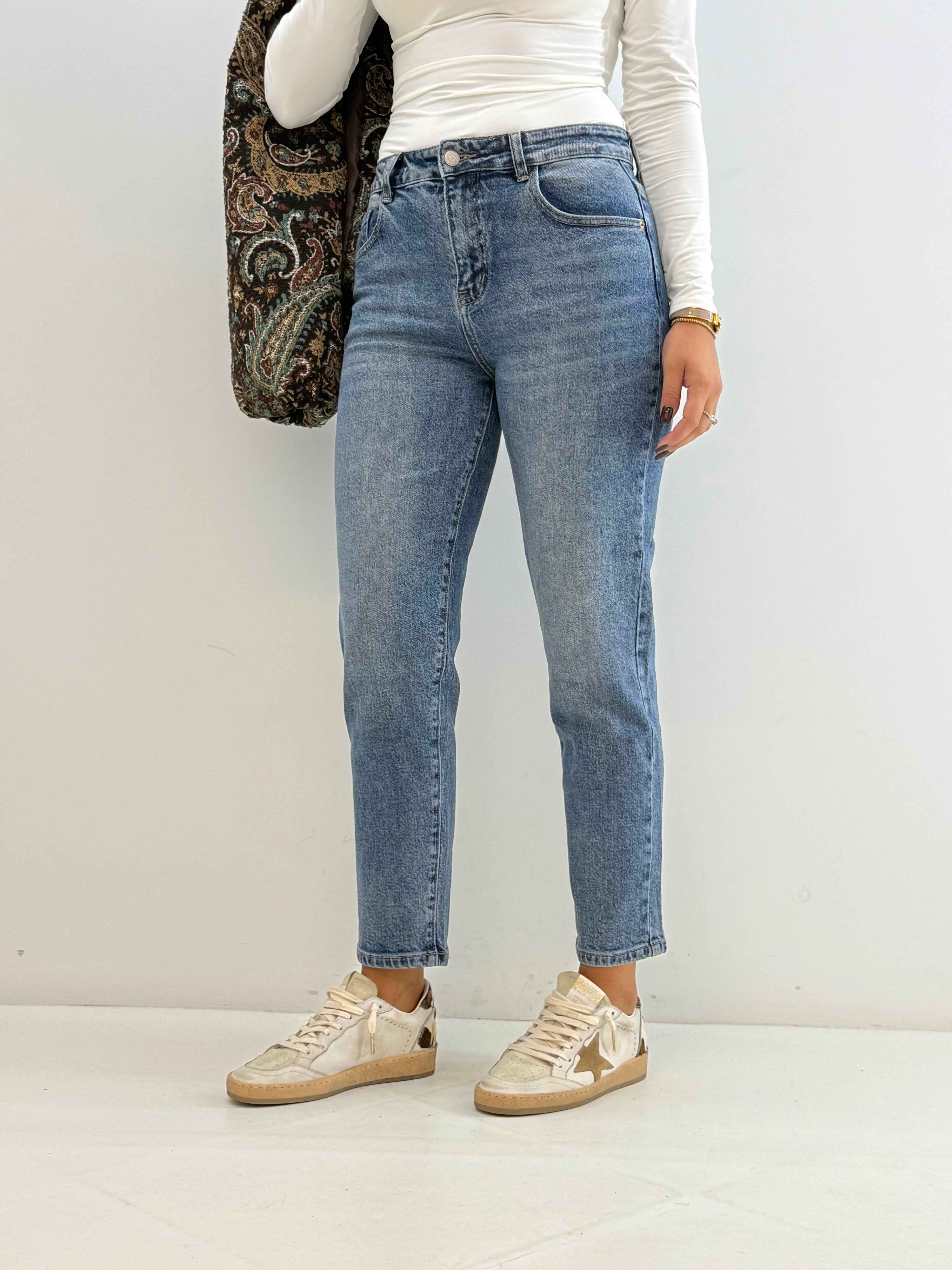 Jeans a vita alta, in cotone. Chiusura frontale con cerniera e bottone, tasche davanti e dietro. Vestibilità a taglie
