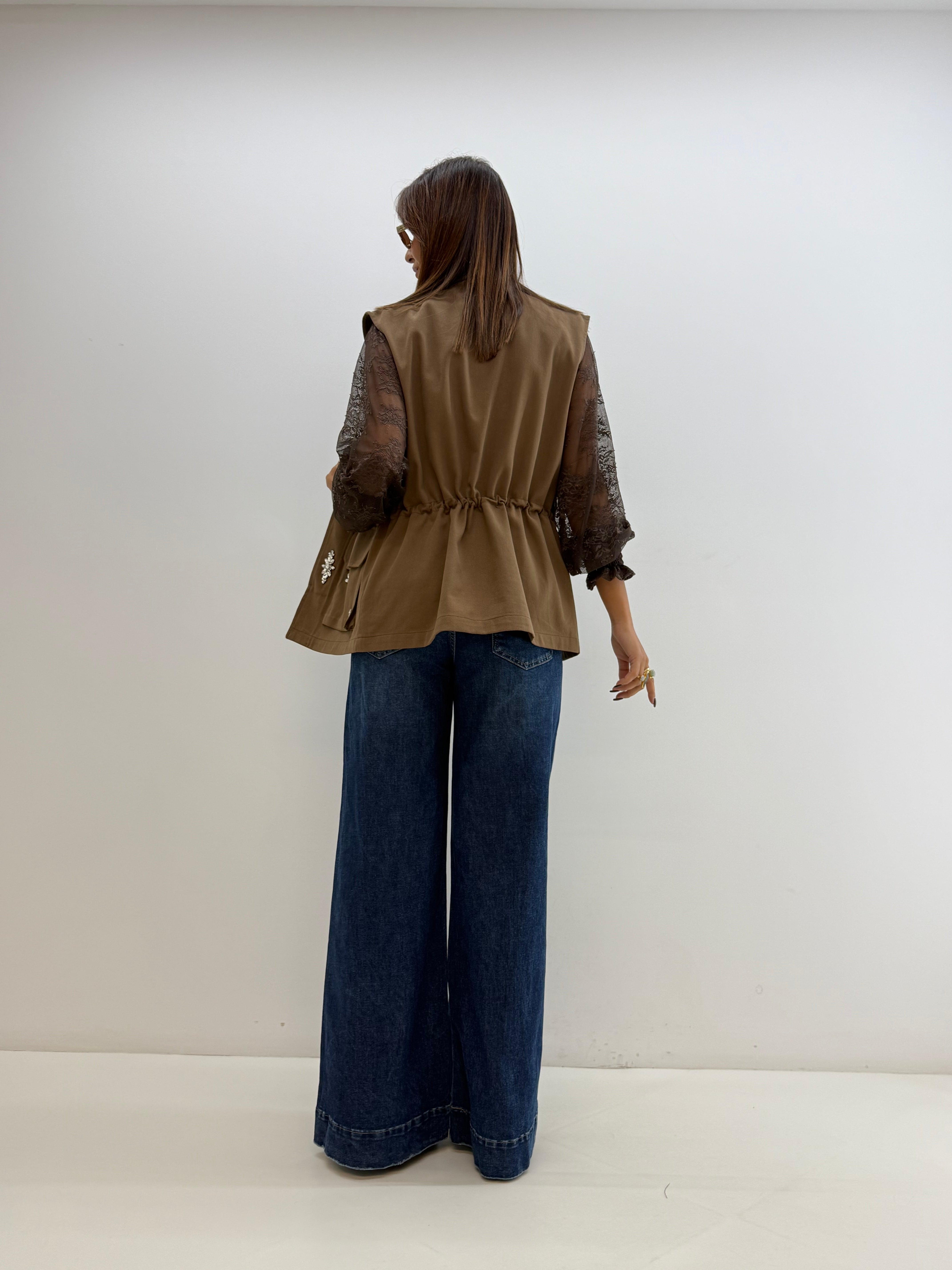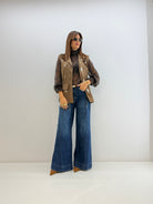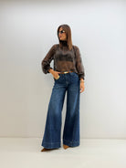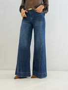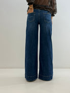 Jeans a vita alta, in cotone, modello a palazzo. Chiusura frontale con cerniera e bottone, modello 5 tasche, passanti per cintura. Vestibilità a taglie