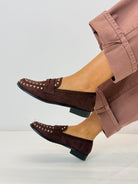 Mocassino in tessuto scamosciato, borchiette davanti, altezza tacchetto 2 cm,
