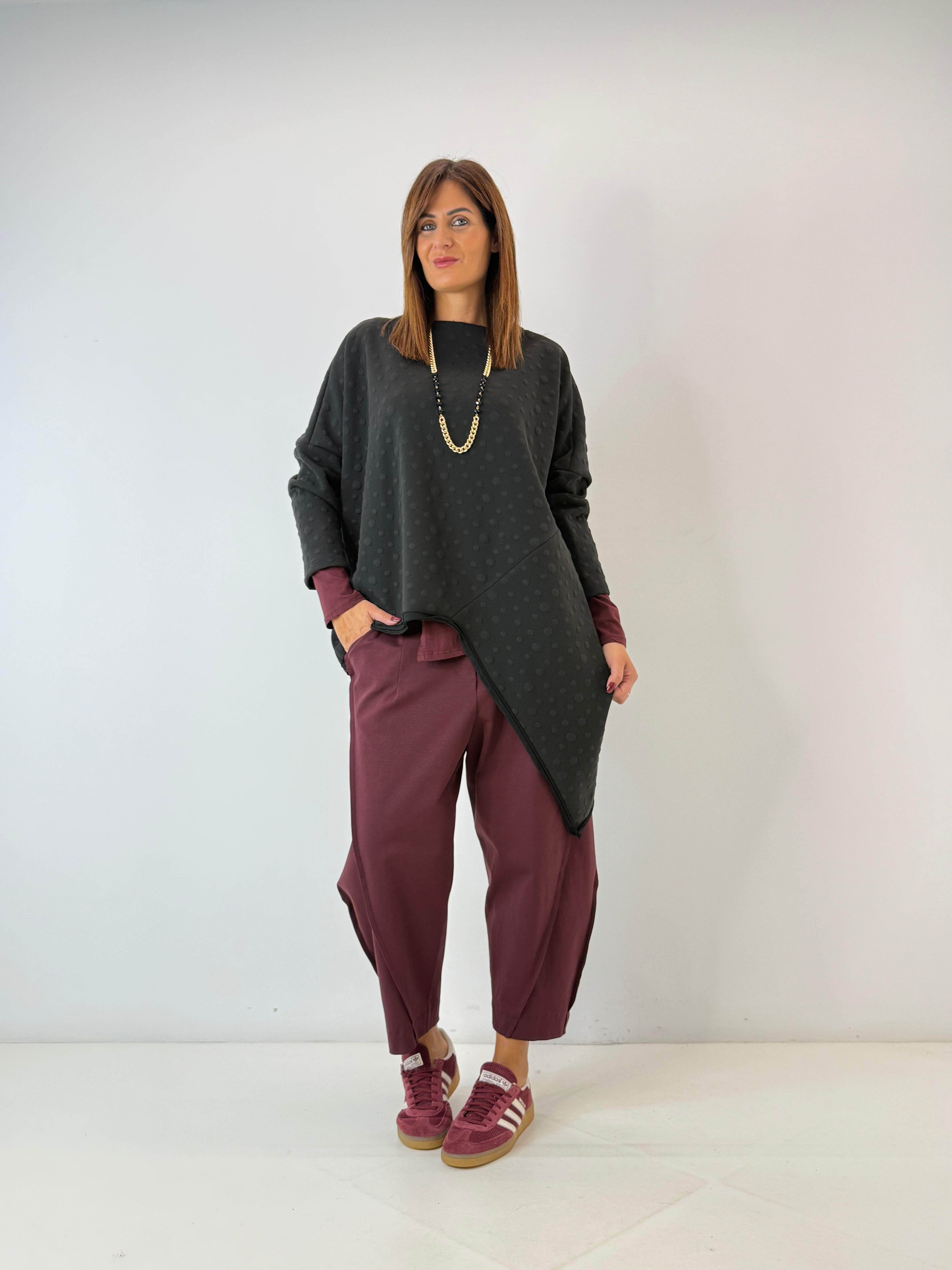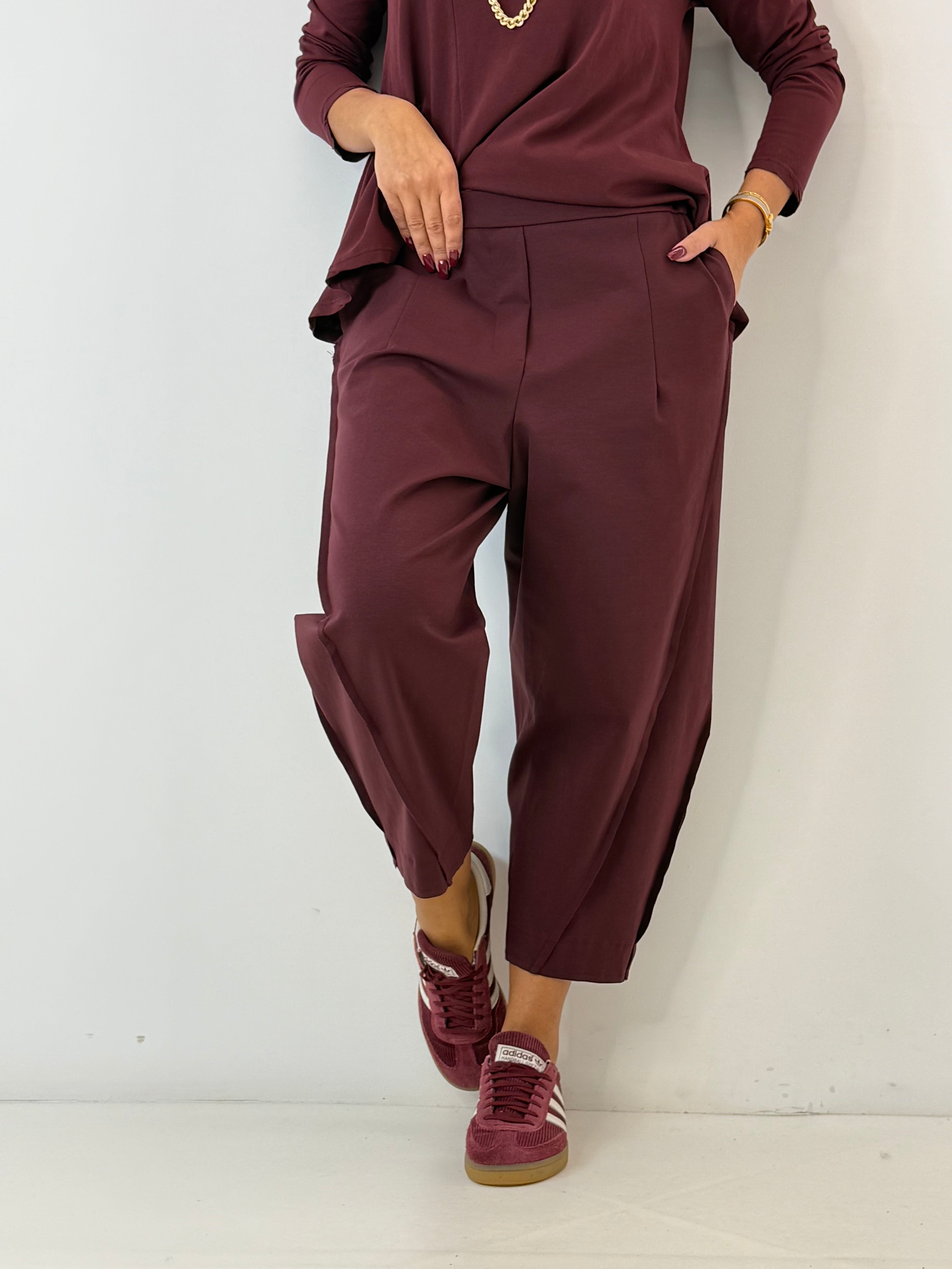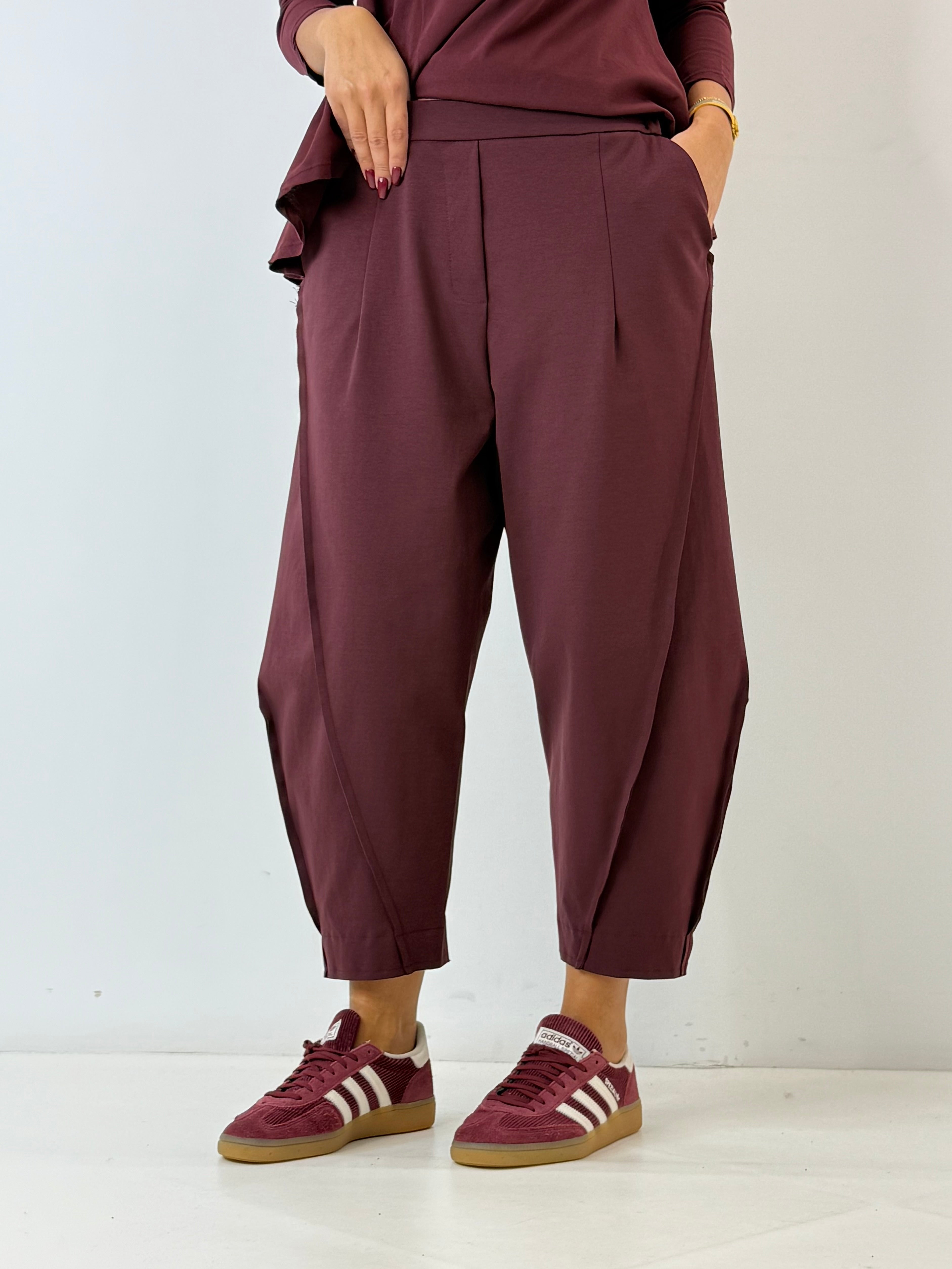 Pantalone modello ovetto in tessuto Punto Milano. Fascia elasticizzata in vita. Tasche laterali a scomparsa. Dettagli cuciture esterne e orli a taglio vivo. Leggermente ristretto alla caviglia. Vestibilità ampia e comoda.