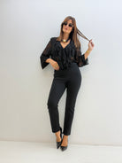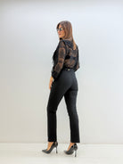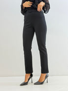 Pantalone a sigaretta, chiusura con zip laterale, passanti per cintura e cinturino. Vestibilità a taglie.
