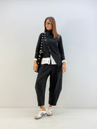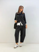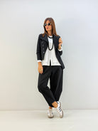 Pantalone con fascia elasticizzata in vita, senza chiusure ,tasche laterali a lunetta. Vestibilità comoda