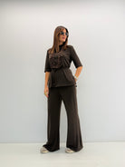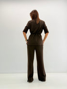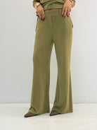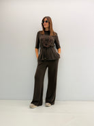 Pantalone, modello a gamba larga, passanti per cintura, elastico in vita dietro, tasche laterali a scomparsa.