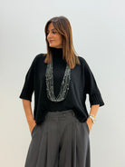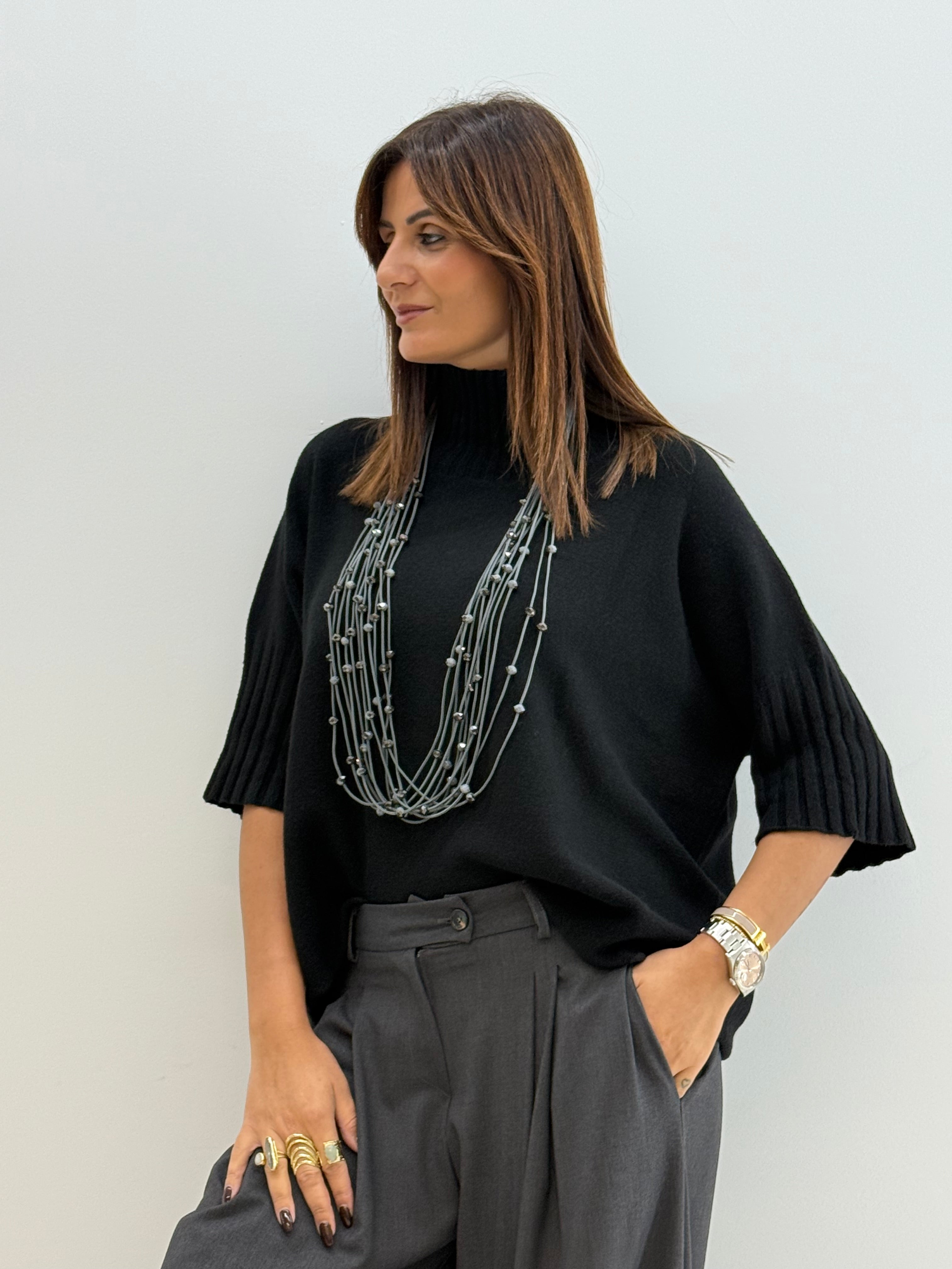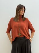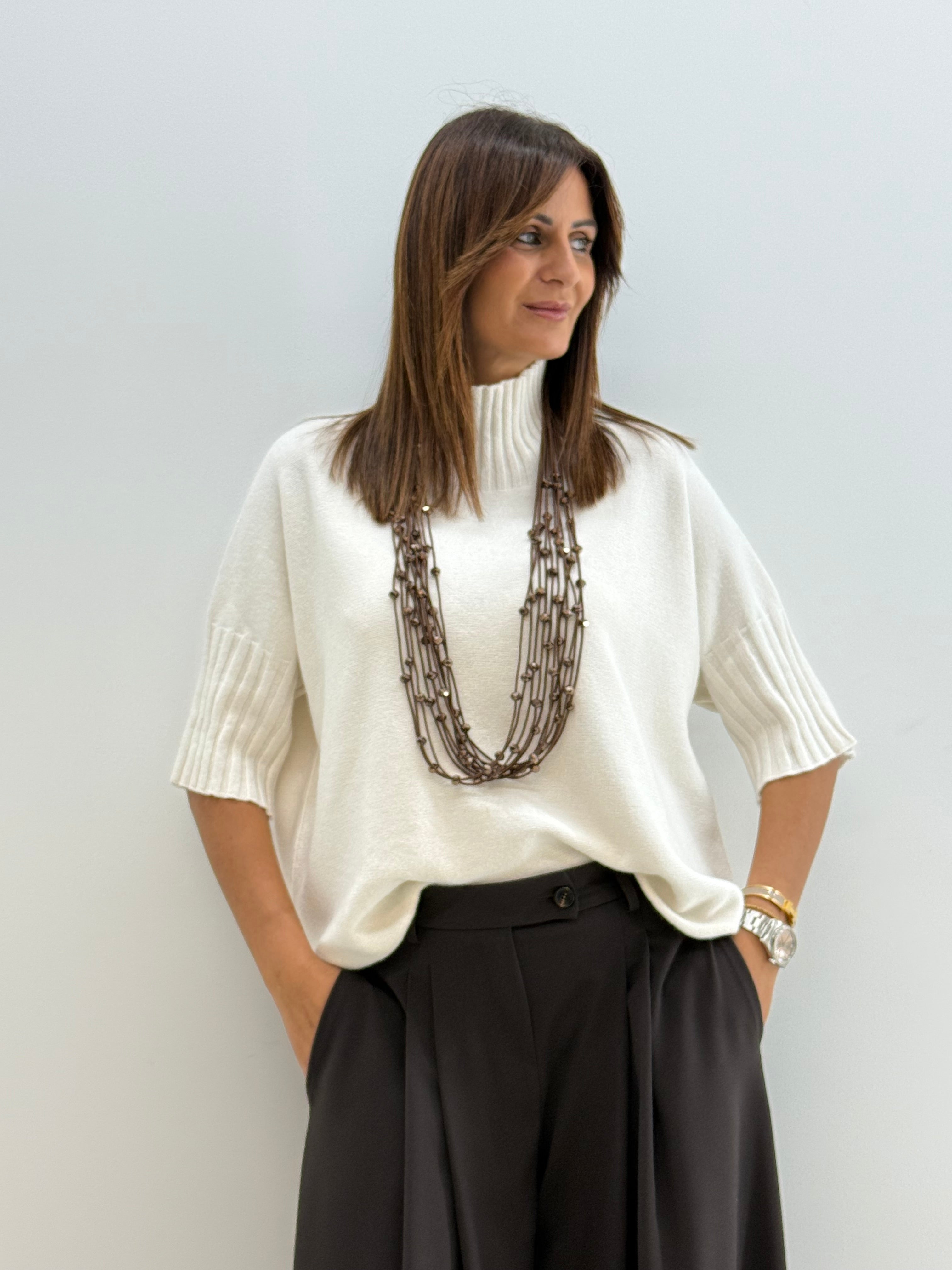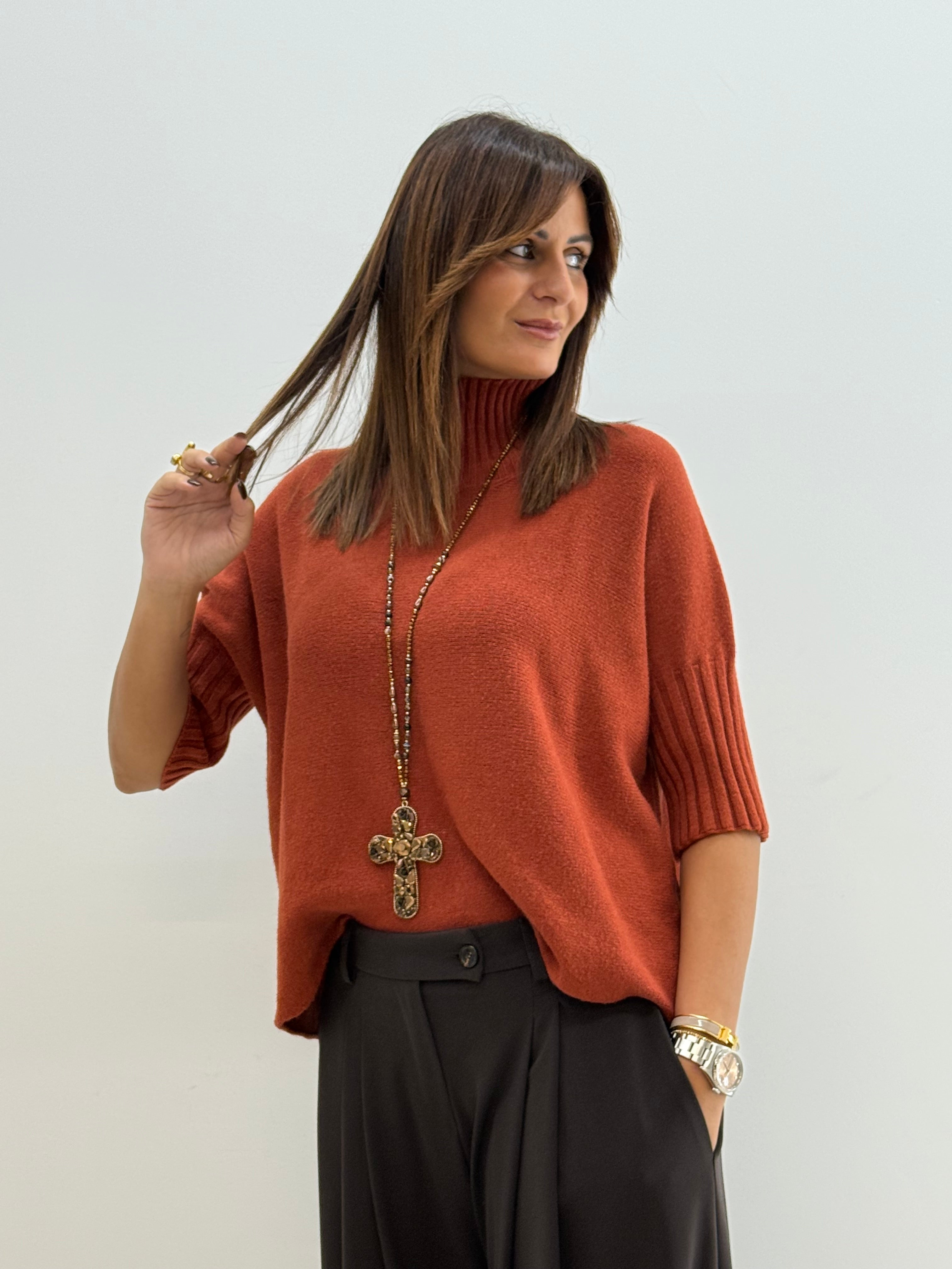 Pull in morbida maglia misto viscosa, maniche a 3/4, collo alto e morbido, vestibilità comoda.
