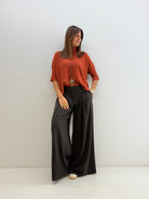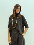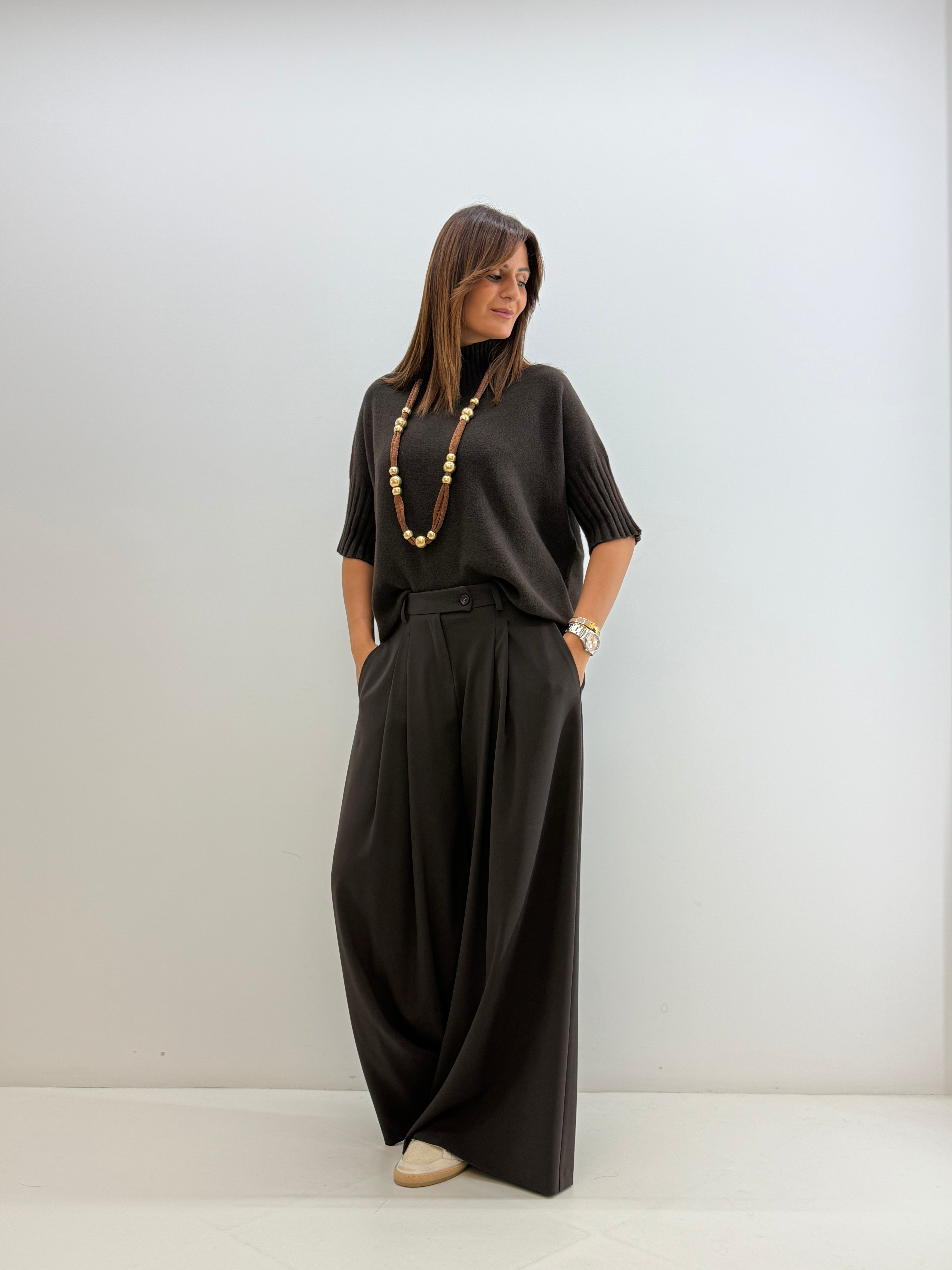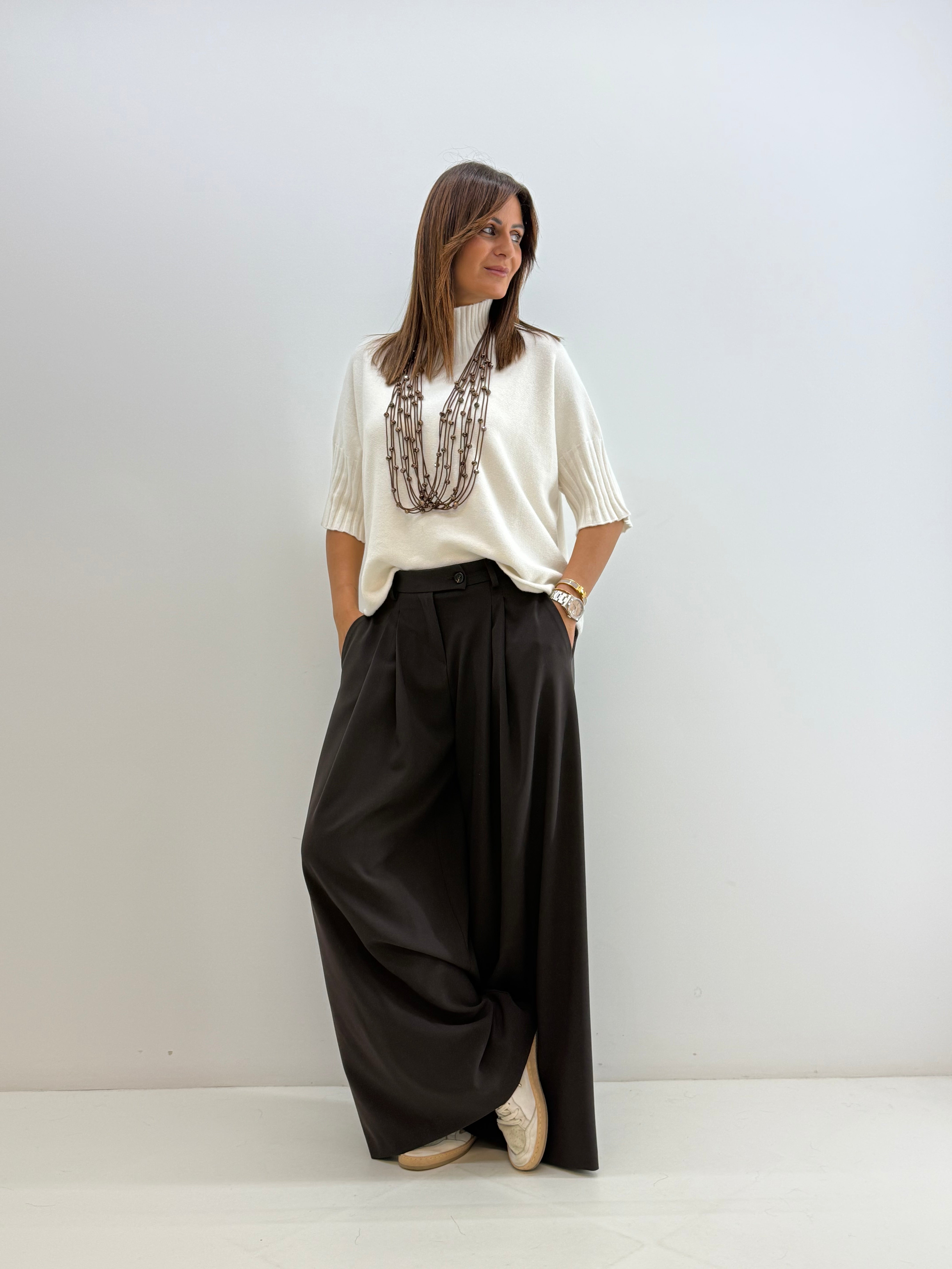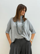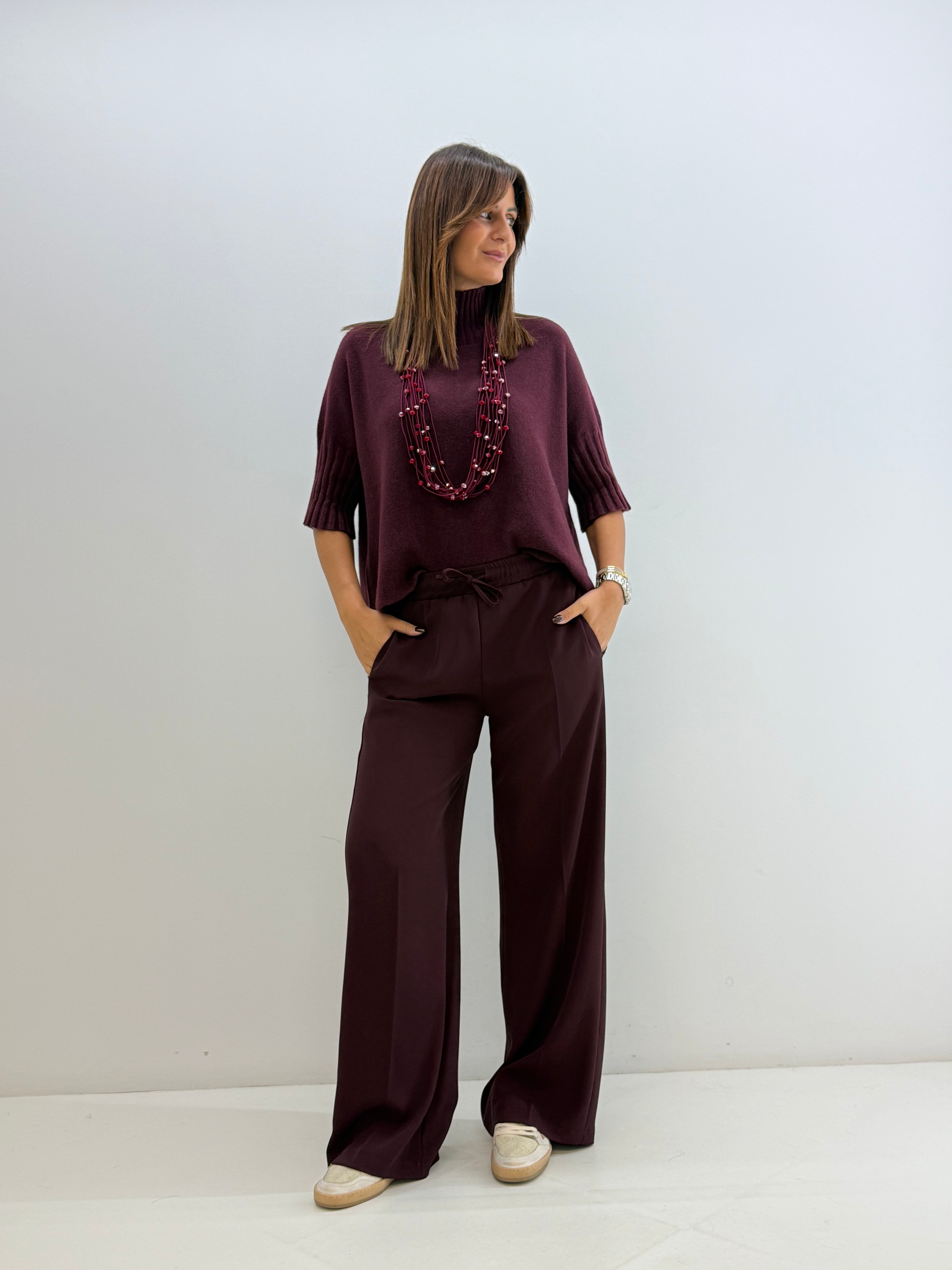 Pull in morbida maglia misto viscosa, maniche a 3/4, collo alto e morbido, vestibilità comoda.