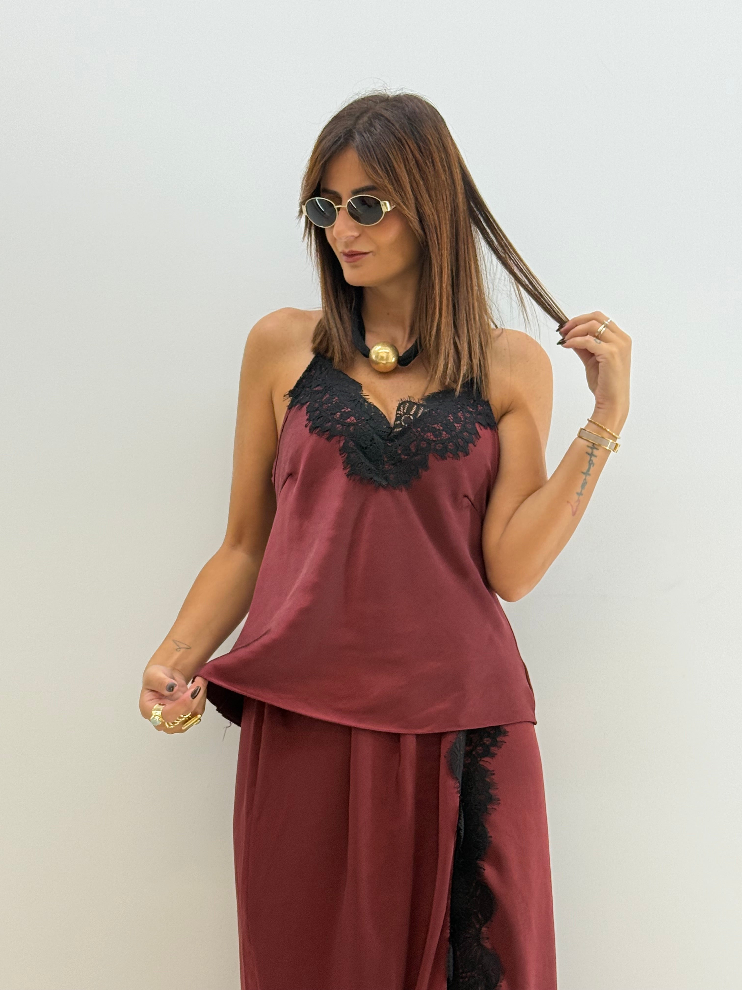 Top, effetto satin e inserti in pizzo.