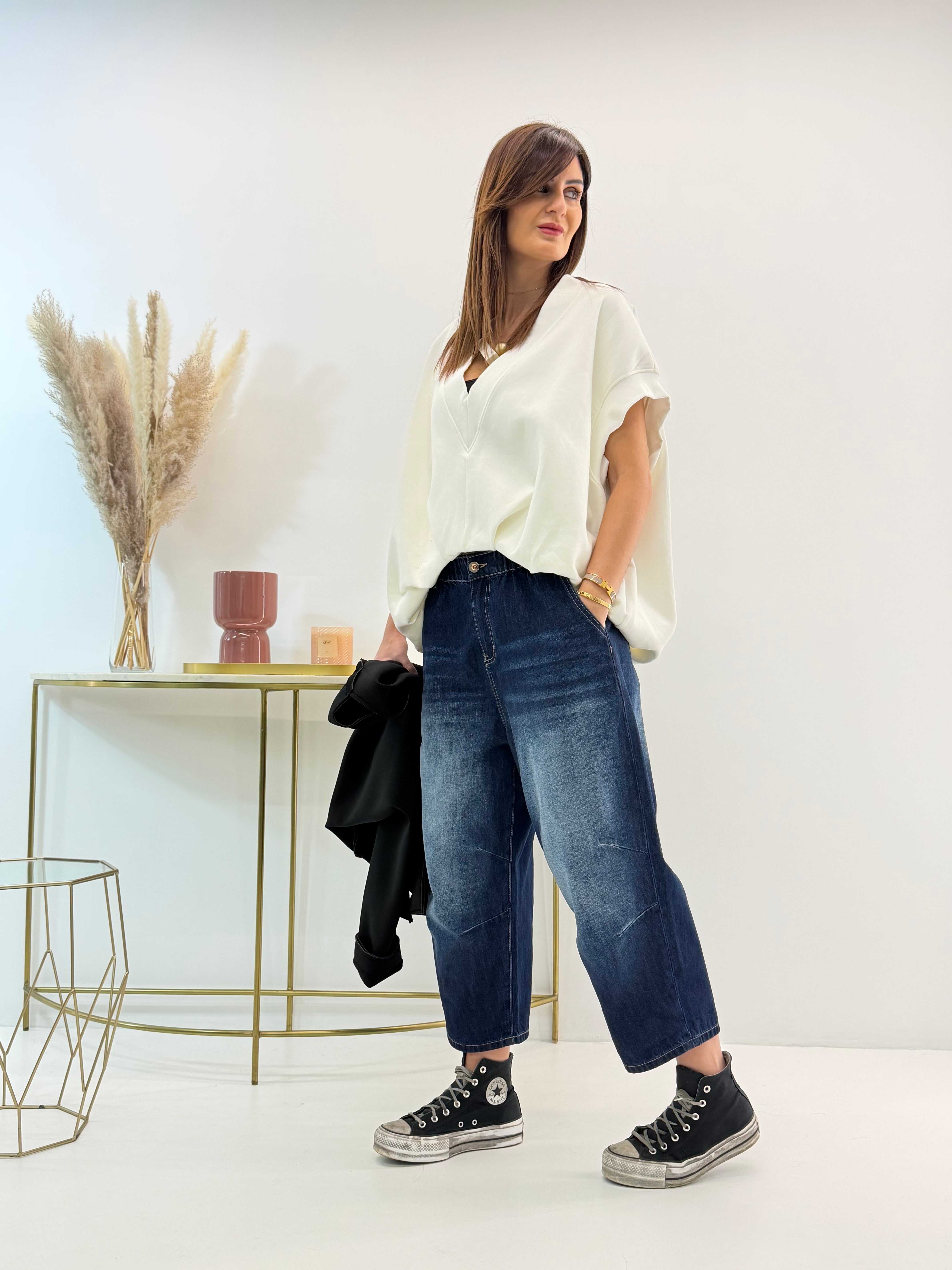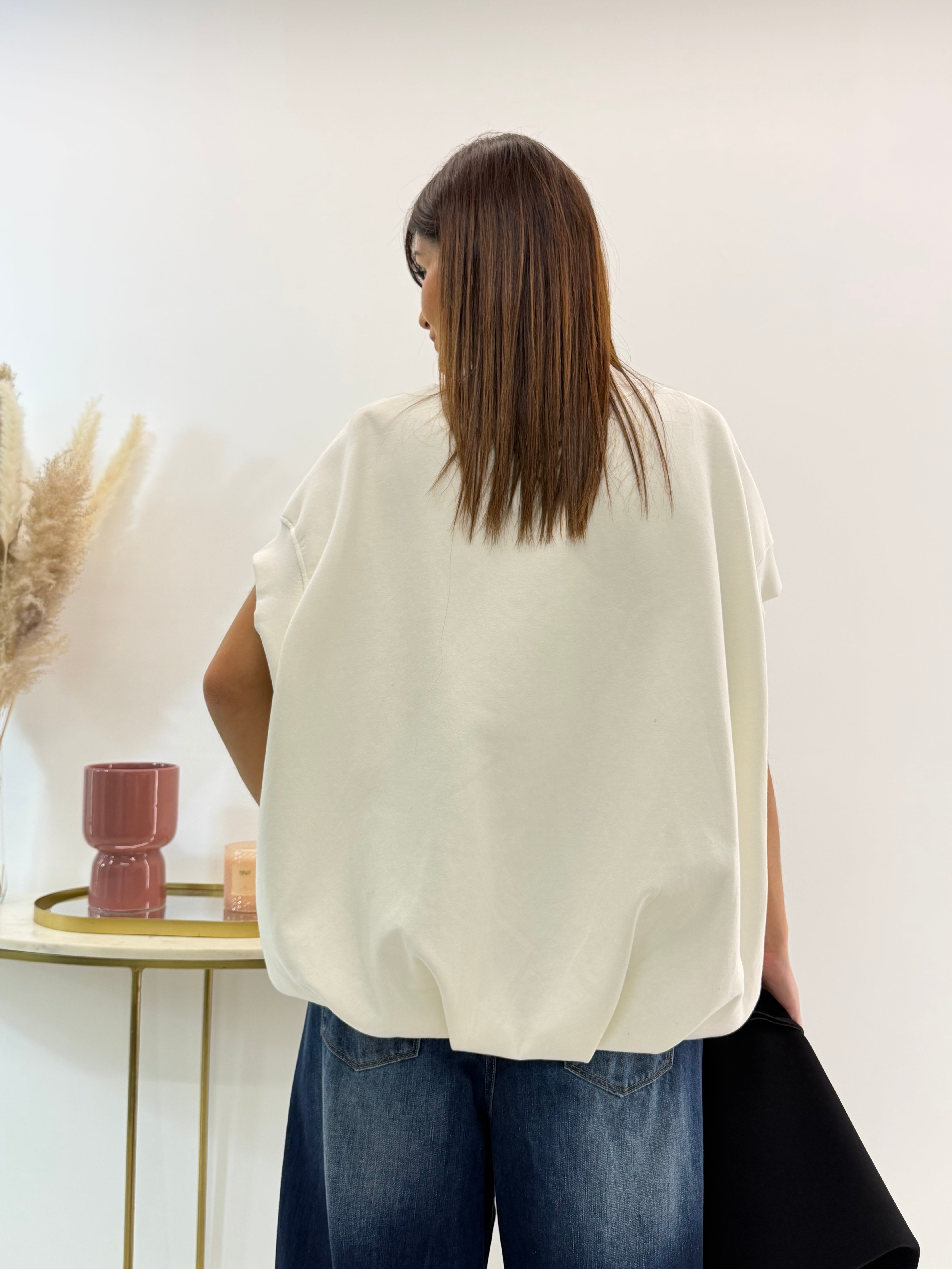 Blusa modello over con maniche corte a pipistrello, ampio scollo a V, effetto drappeggiato sulla parte anteriore che crea volume. Fodera interna in tulle. Vestibilità ampia e comoda.