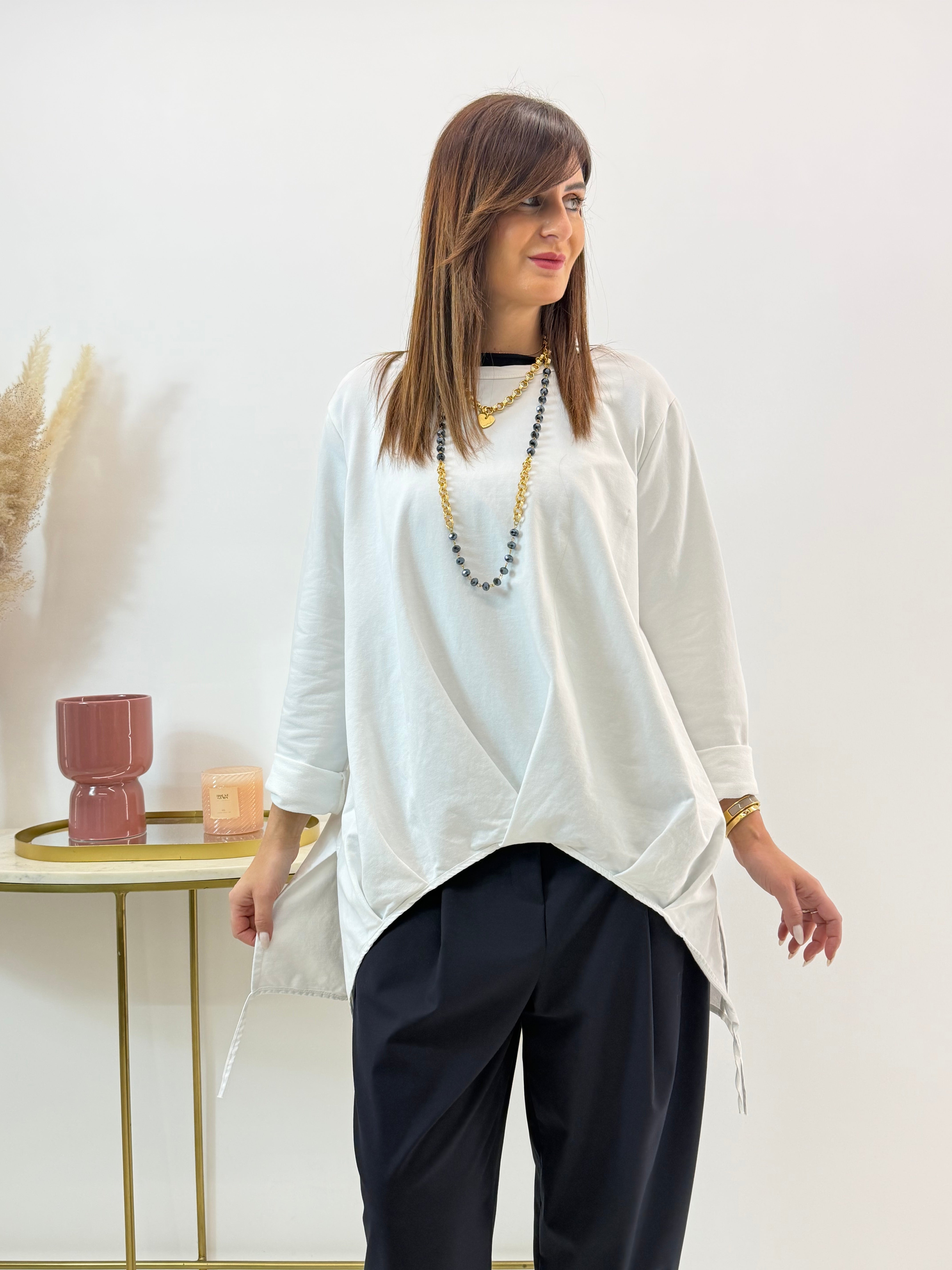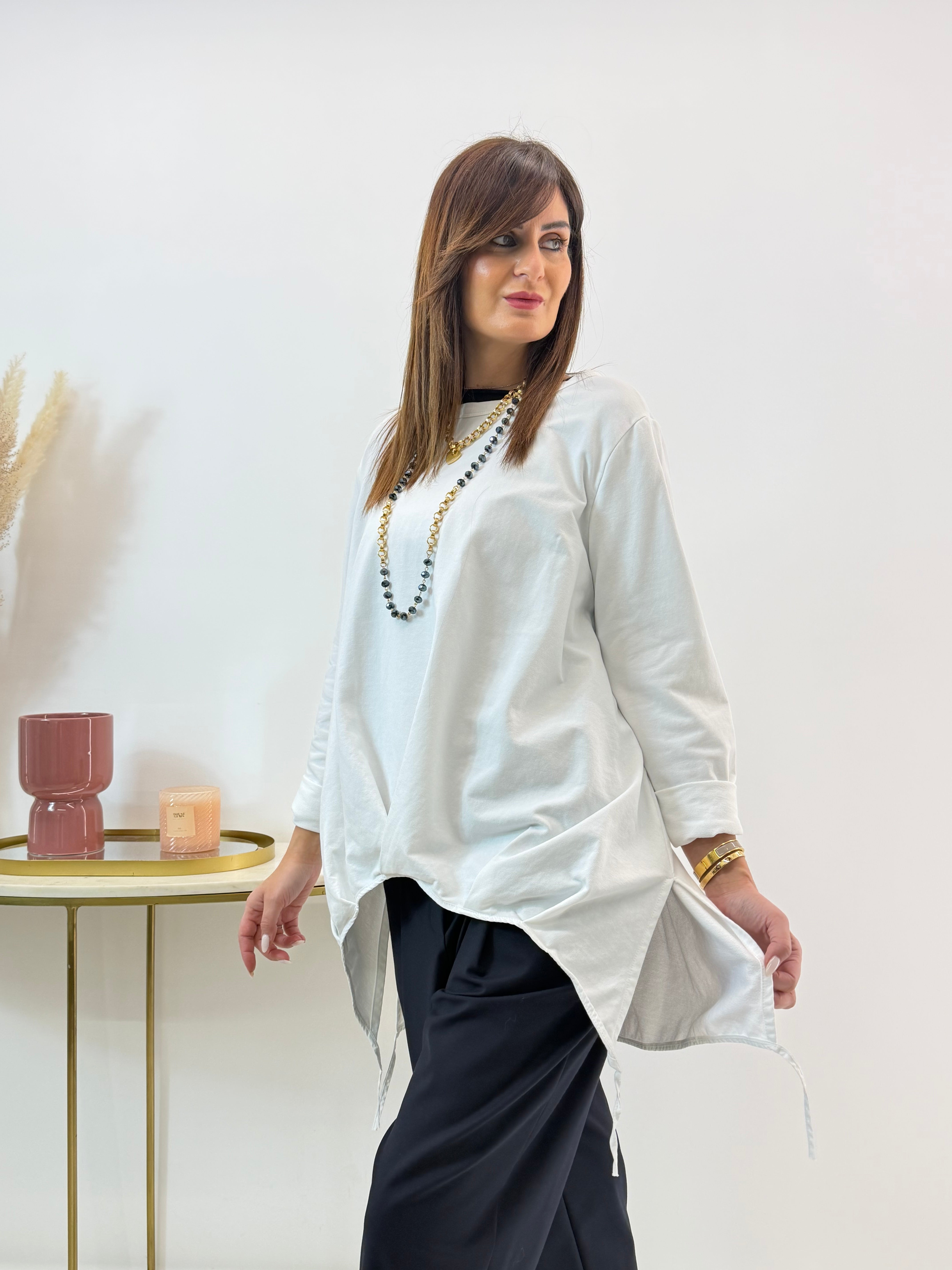 Blusa con intreccio frontale in cotone. Scollo rotondo. Spalle regolari e maniche lunghe, spacchetti laterali con laccetti. Stondata sul davanti e più lunga sul retro. Vestibilità comoda.