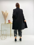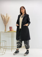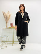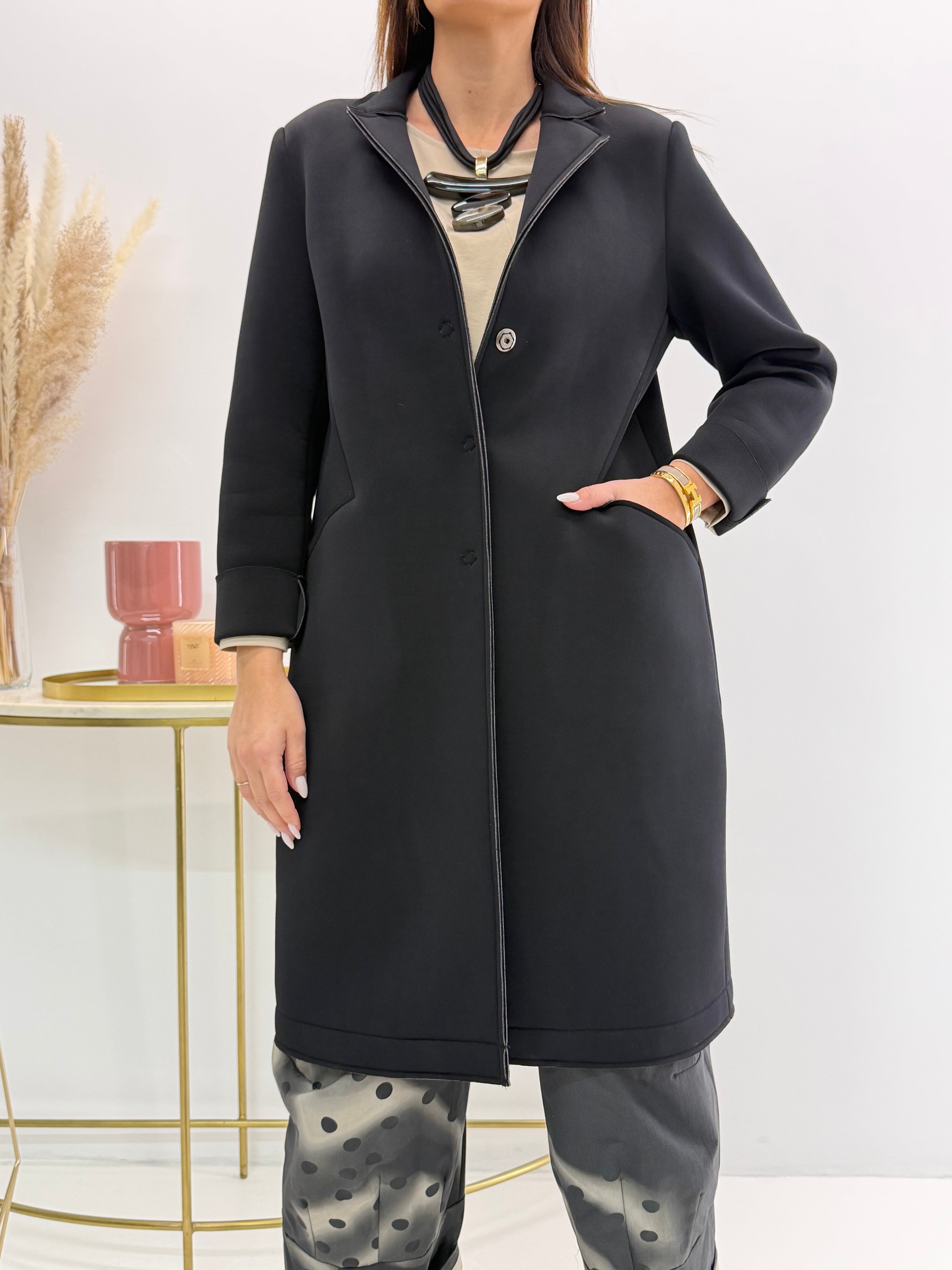 Cappotto lungo in neoprene, cuciture a vista, orli a taglio vivo. Chiusura con bottoni davanti.