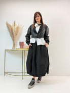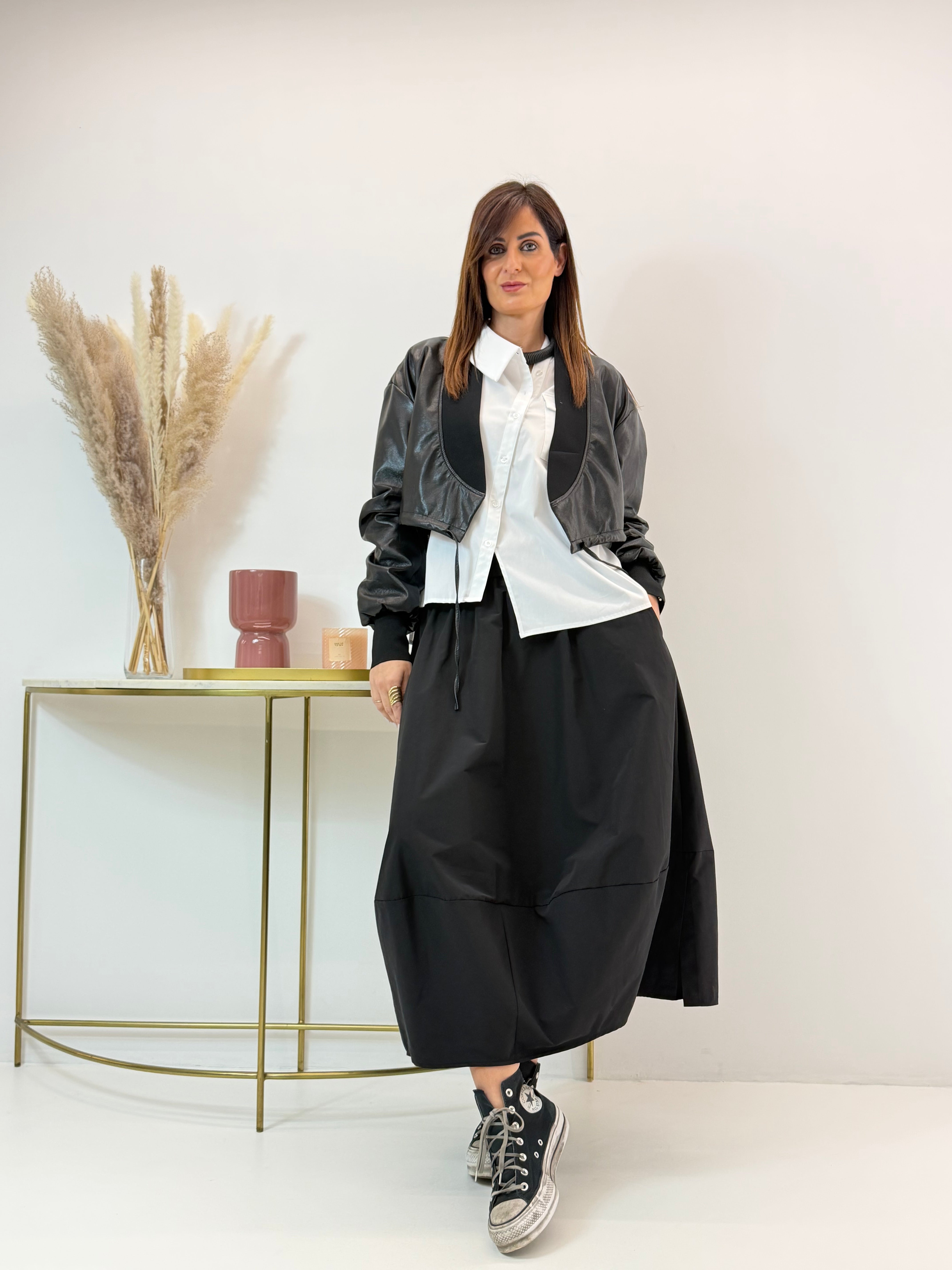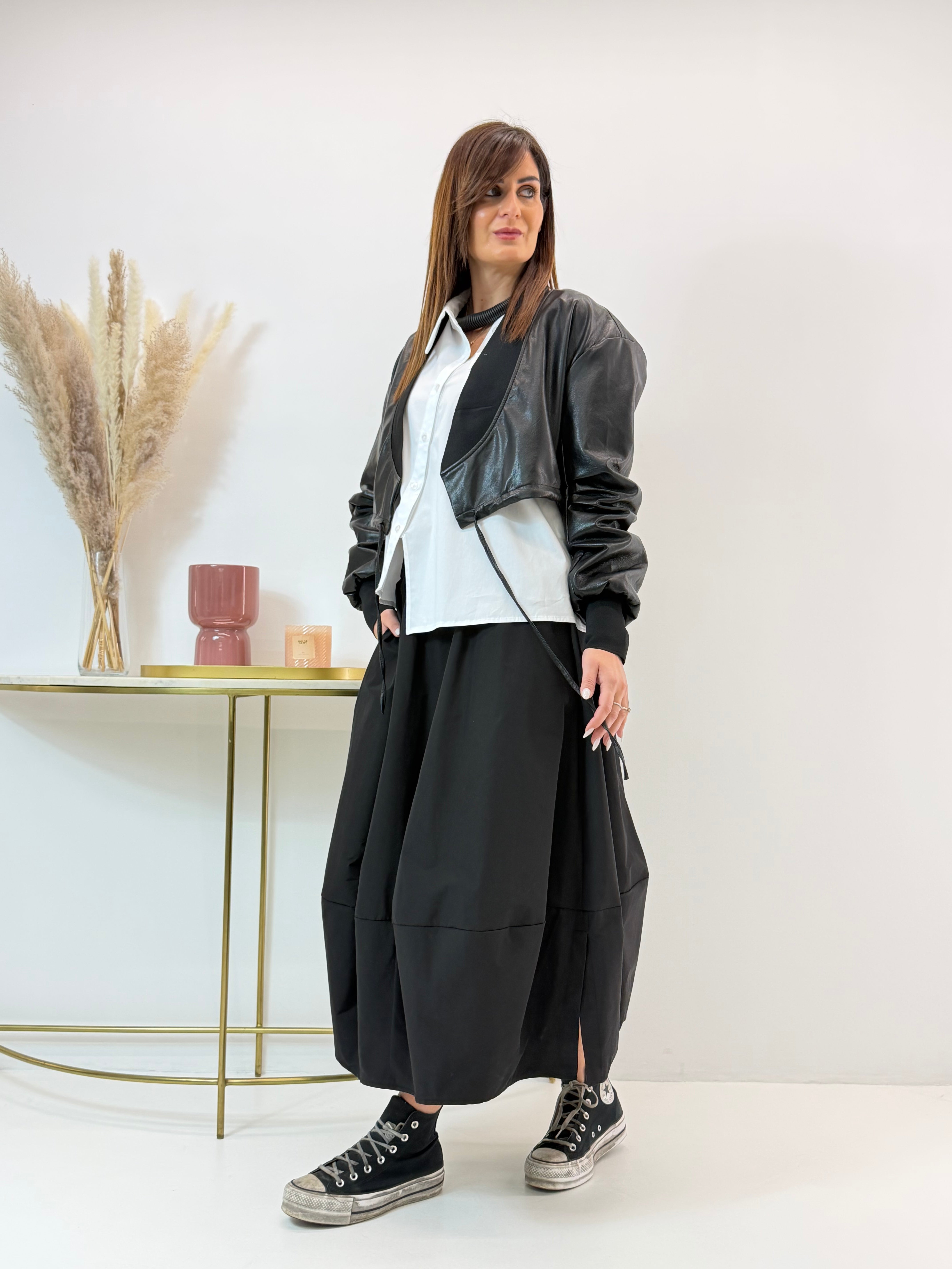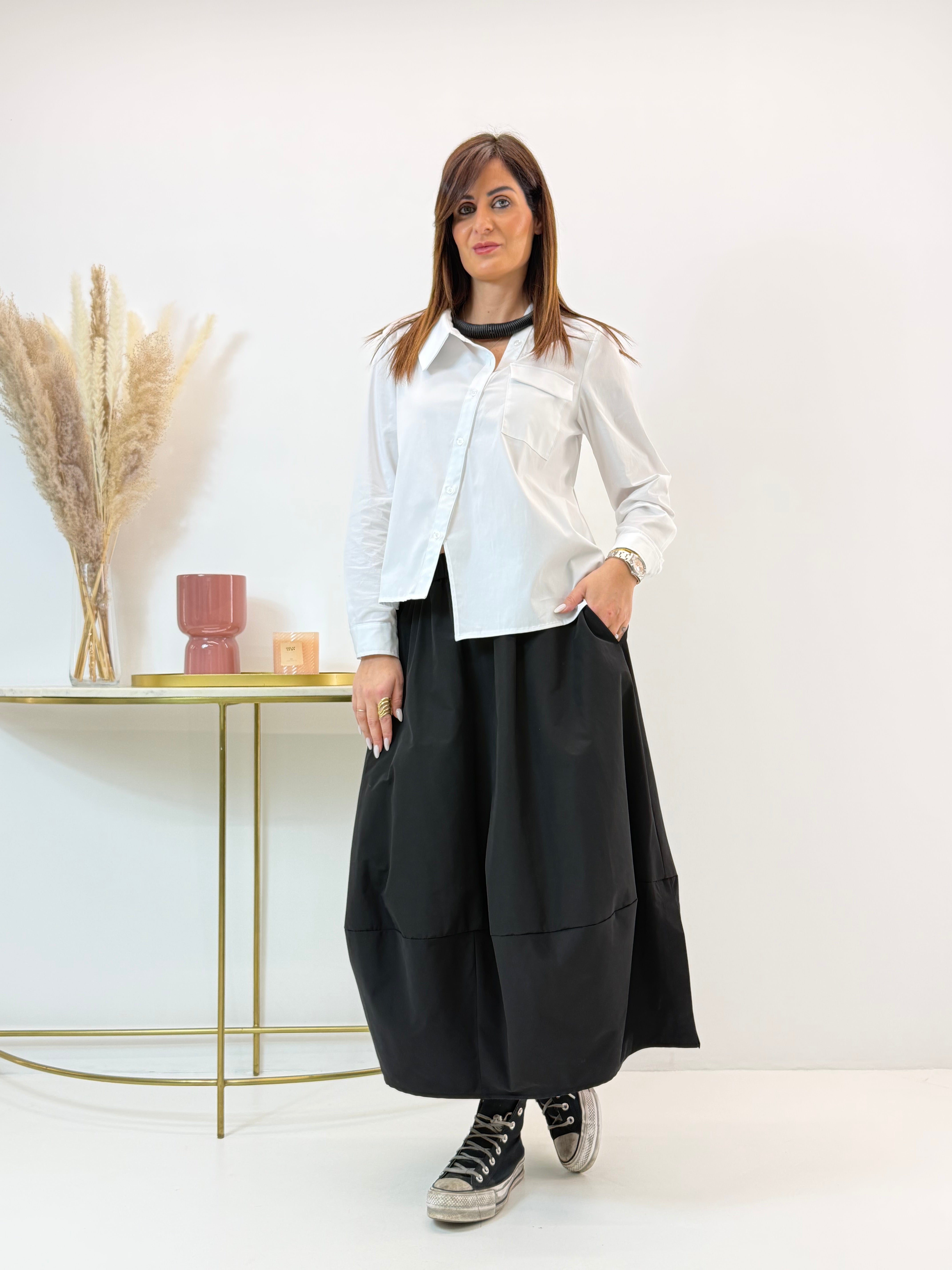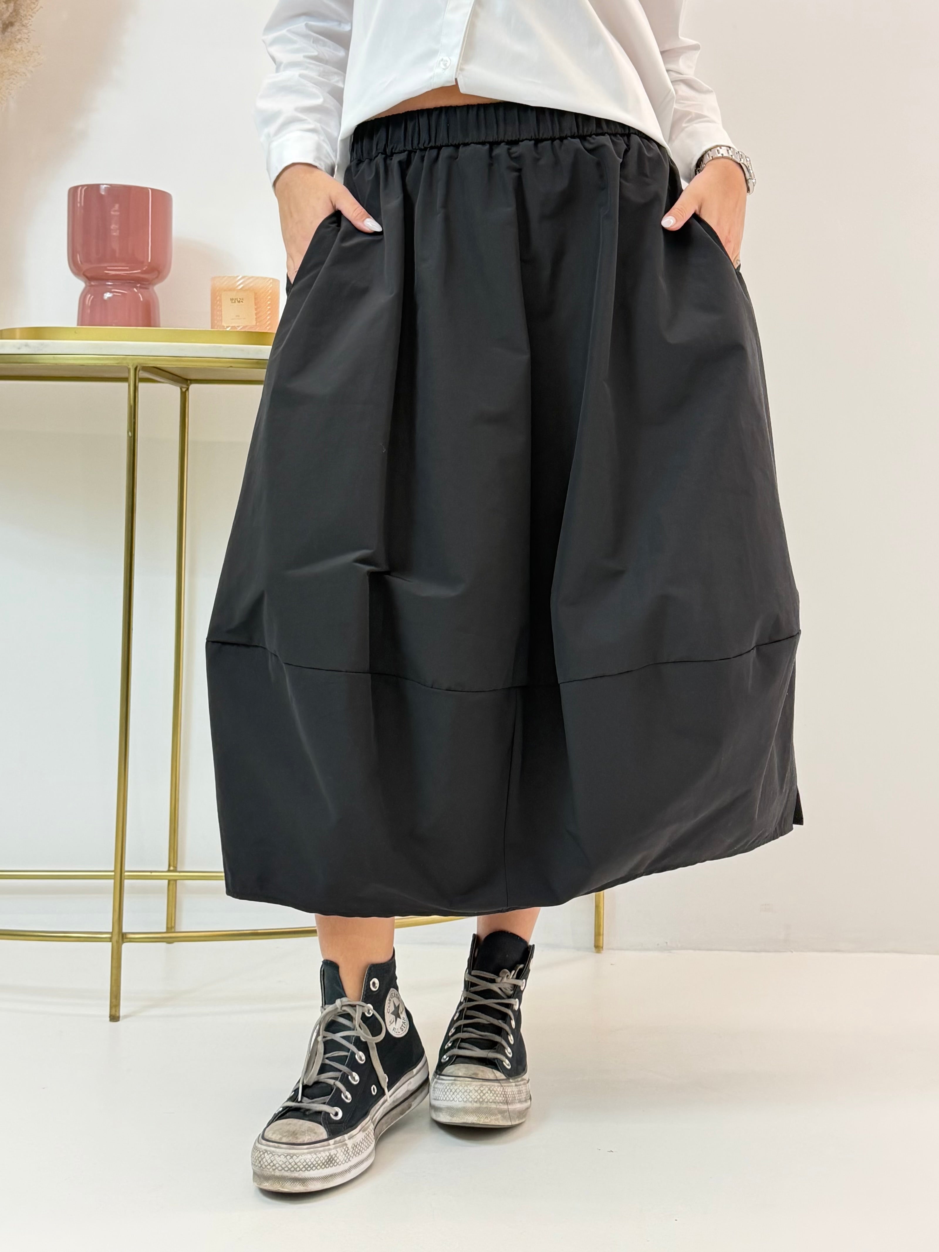 Gonna modello a palloncino, tasche laterali a scomparsa. Fascia elasticizzata in vita. Spacchetti laterali sull'orlo.