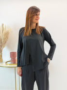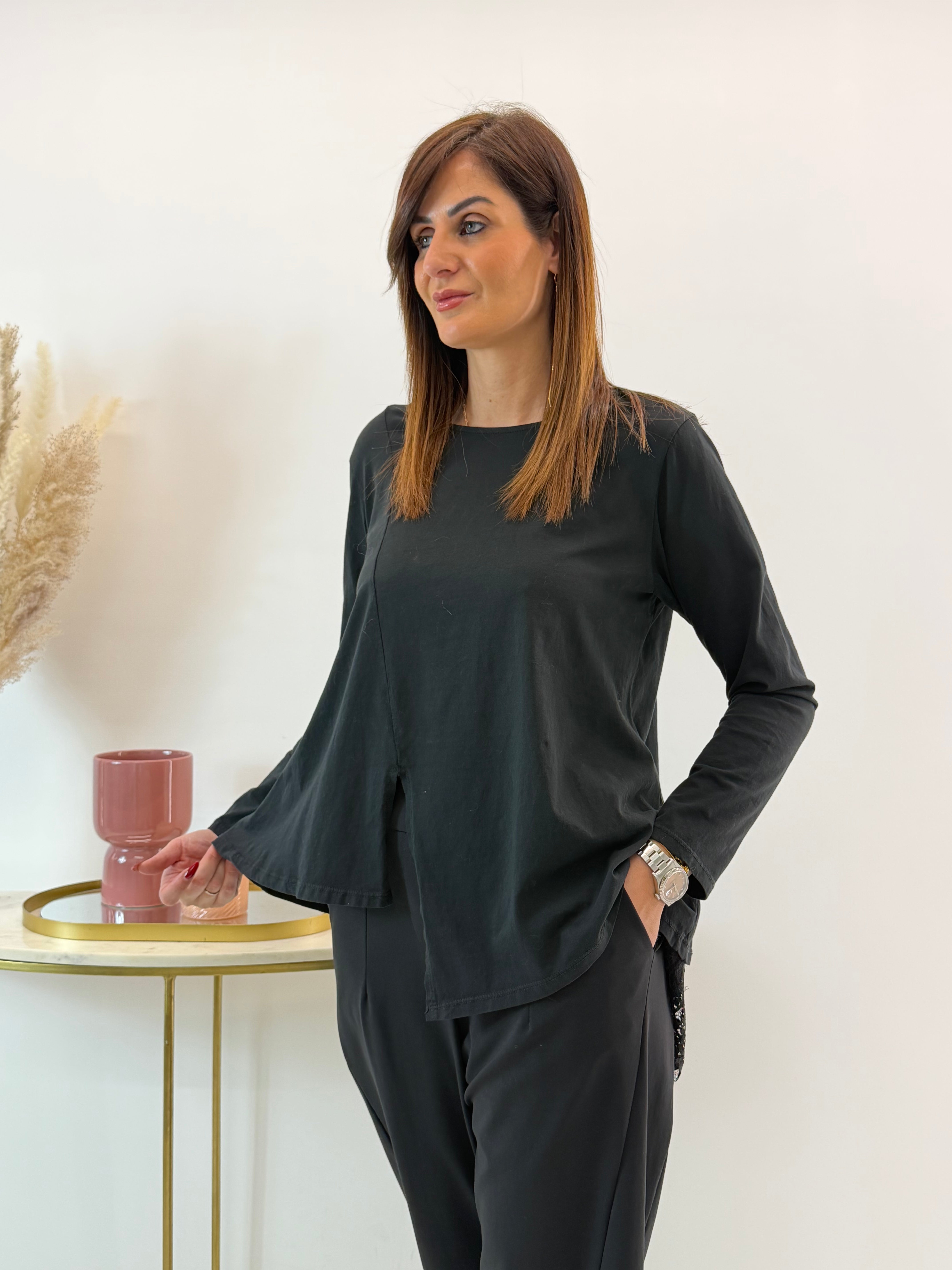 Maglietta in Jersey di cotone con scollo tondo e maniche lunghe. Dettaglio cucitura in diagonale frontale con spacchetto finale. Orli a taglio vivo. Vestibilità comoda.