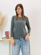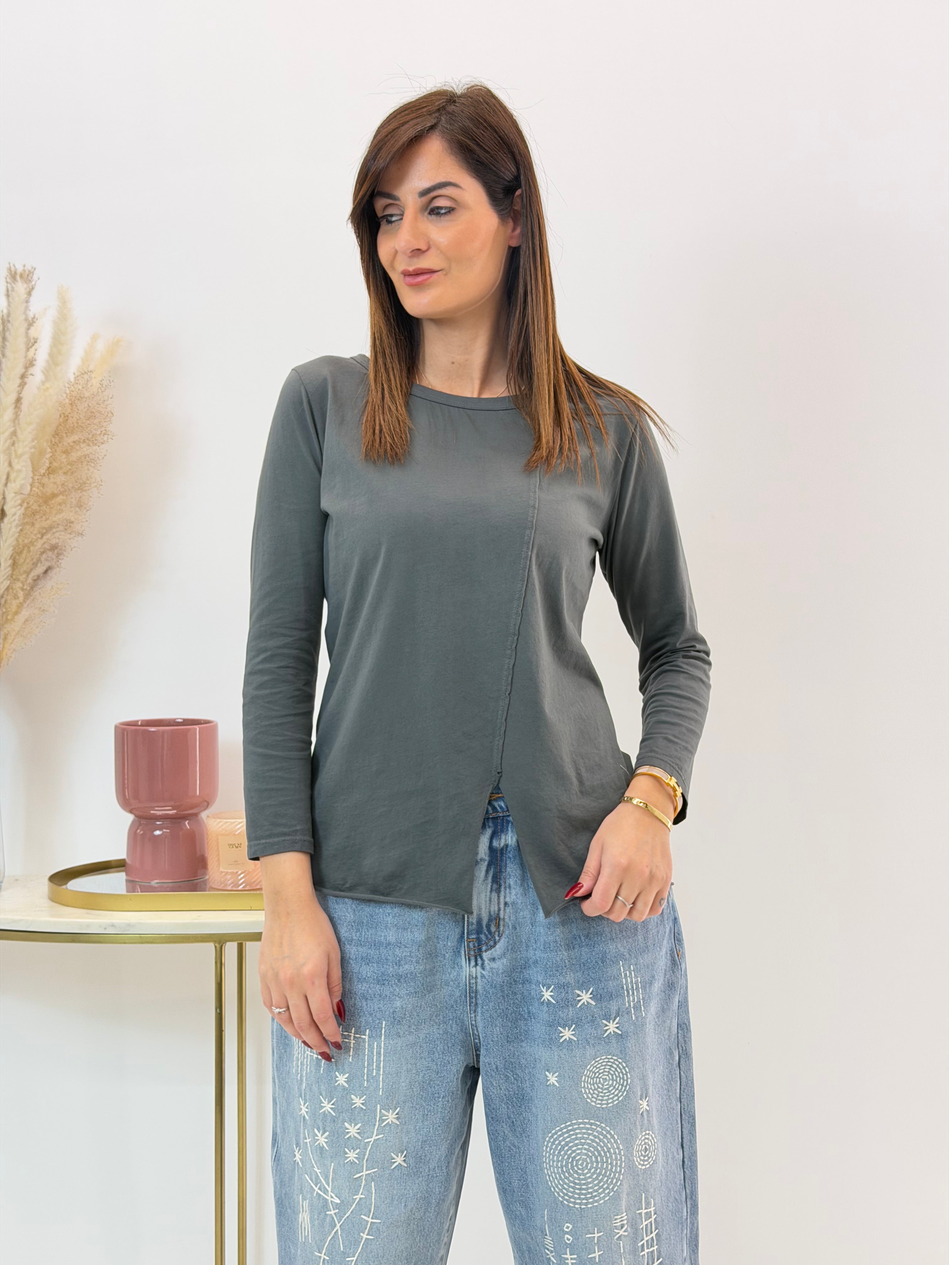 Maglietta in Jersey di cotone con scollo tondo e maniche lunghe. Dettaglio cucitura in diagonale frontale con spacchetto finale. Orli a taglio vivo. Vestibilità comoda.