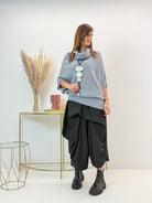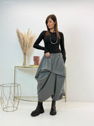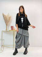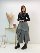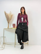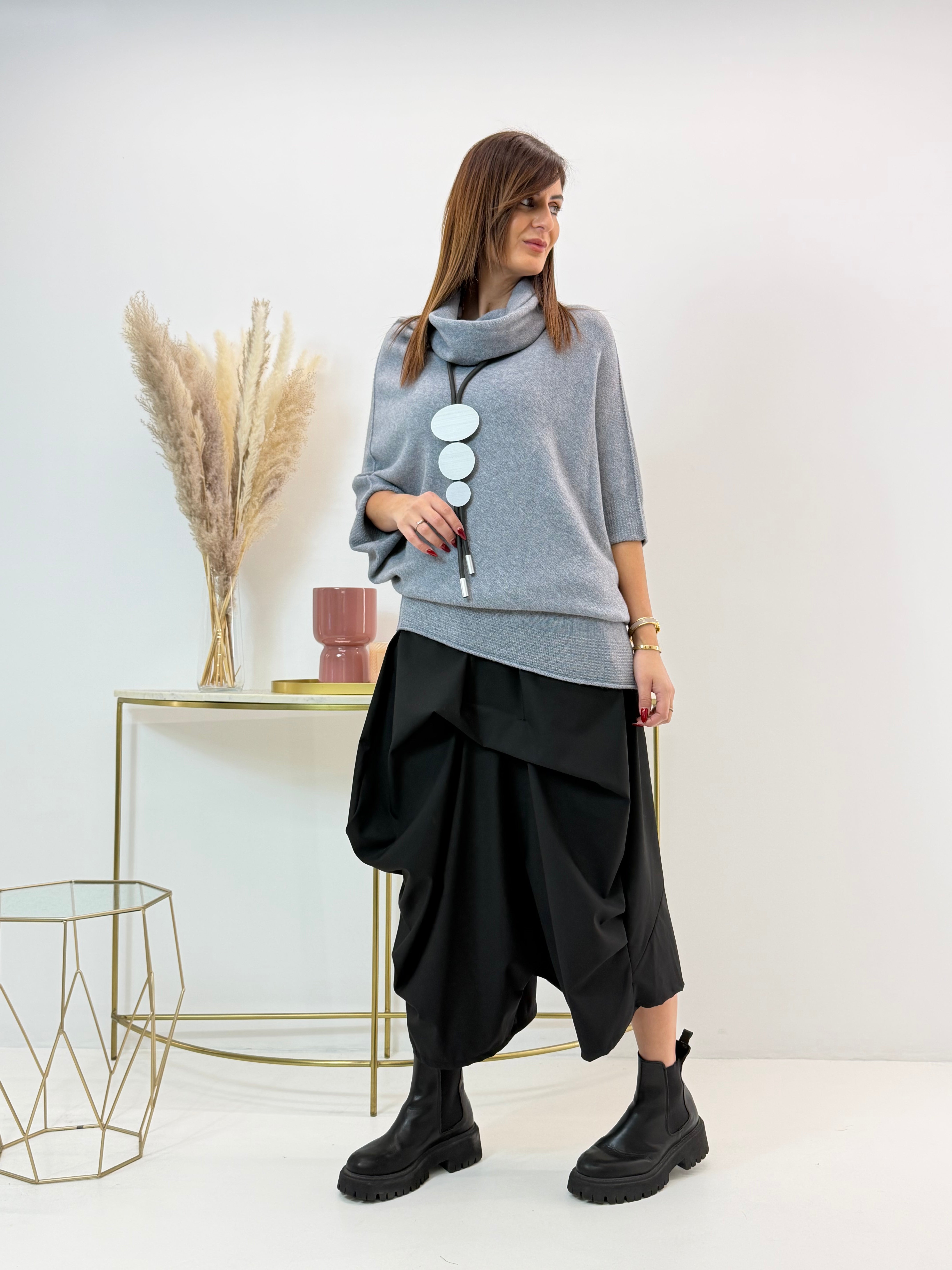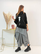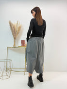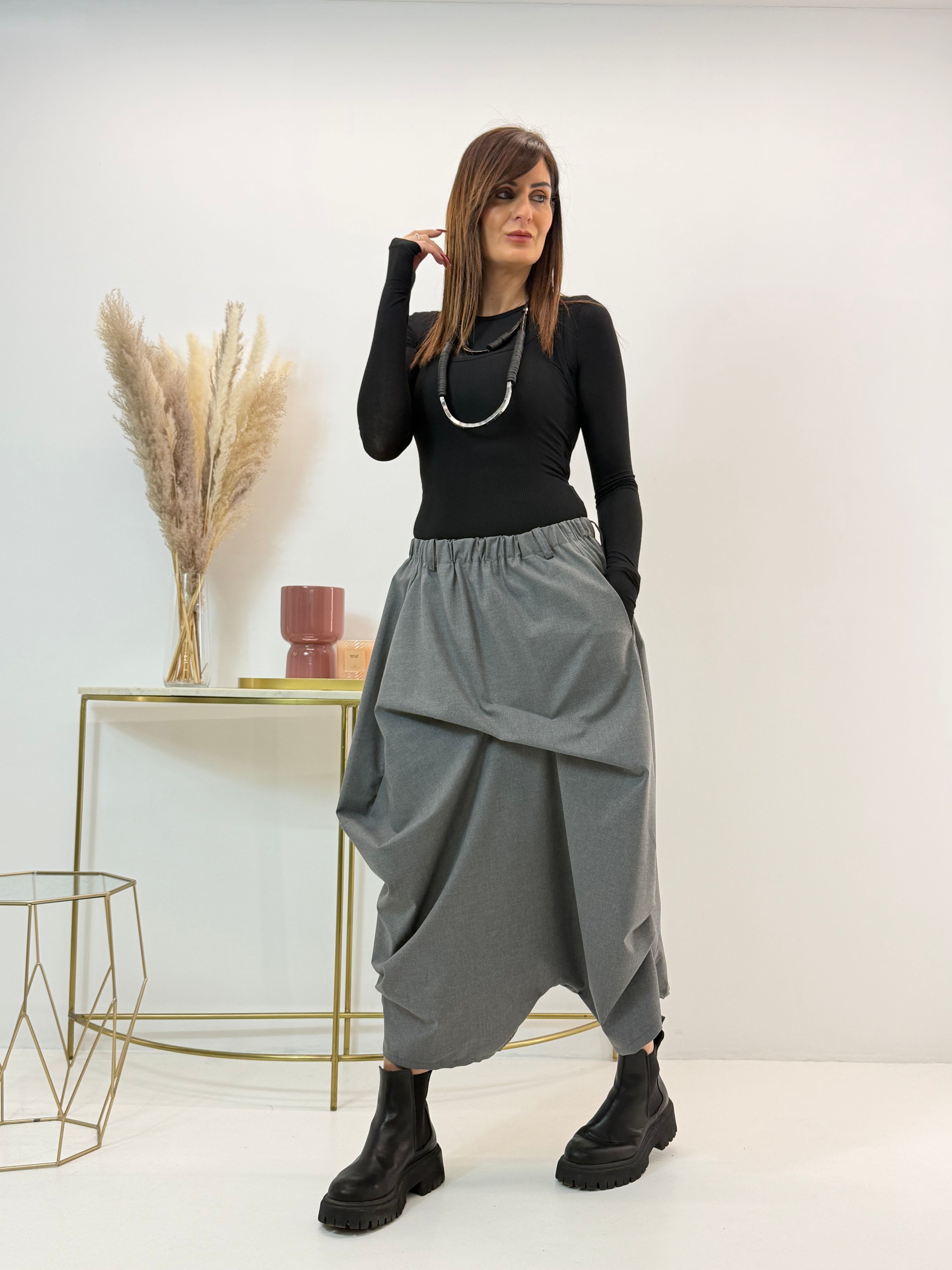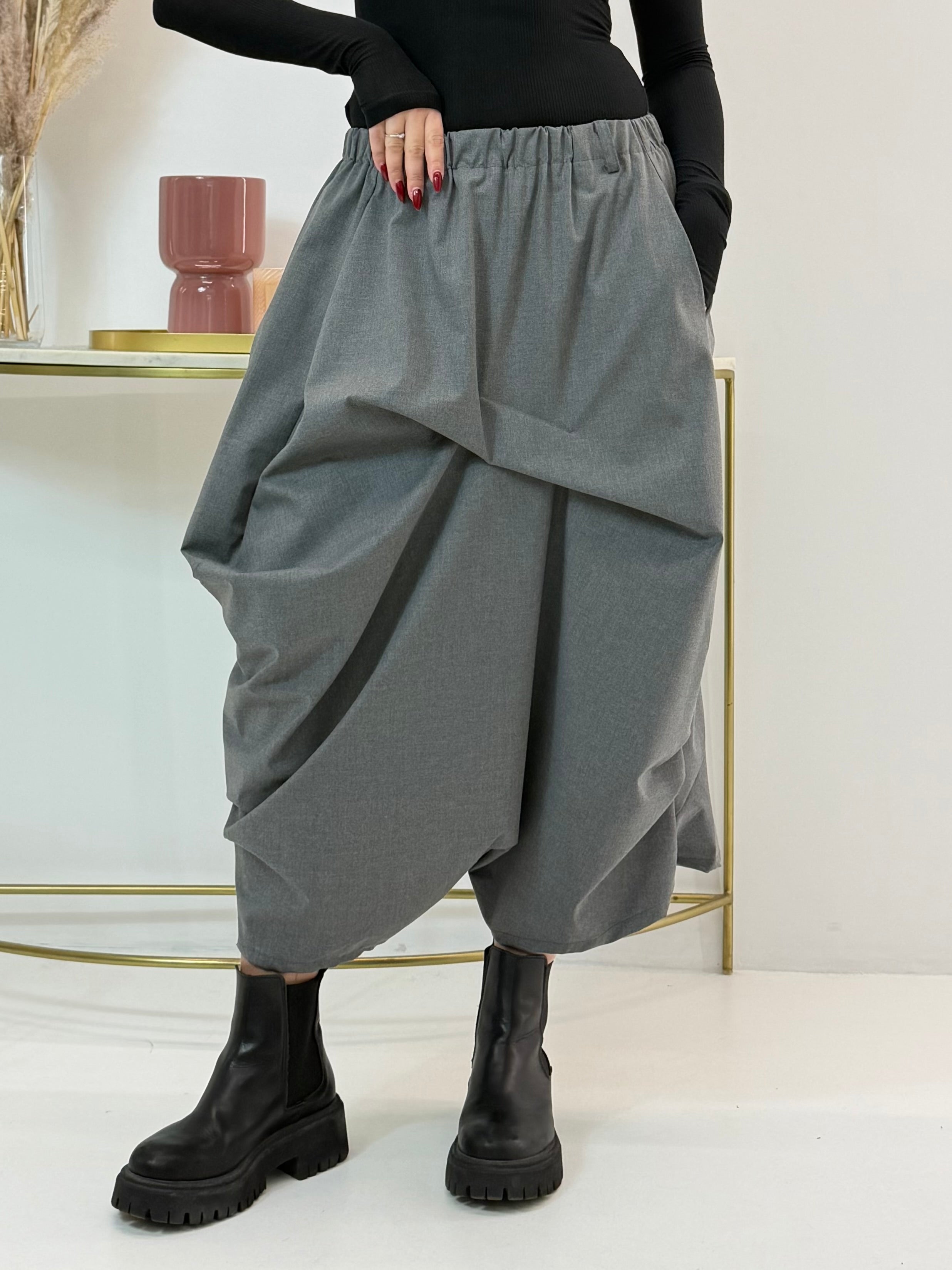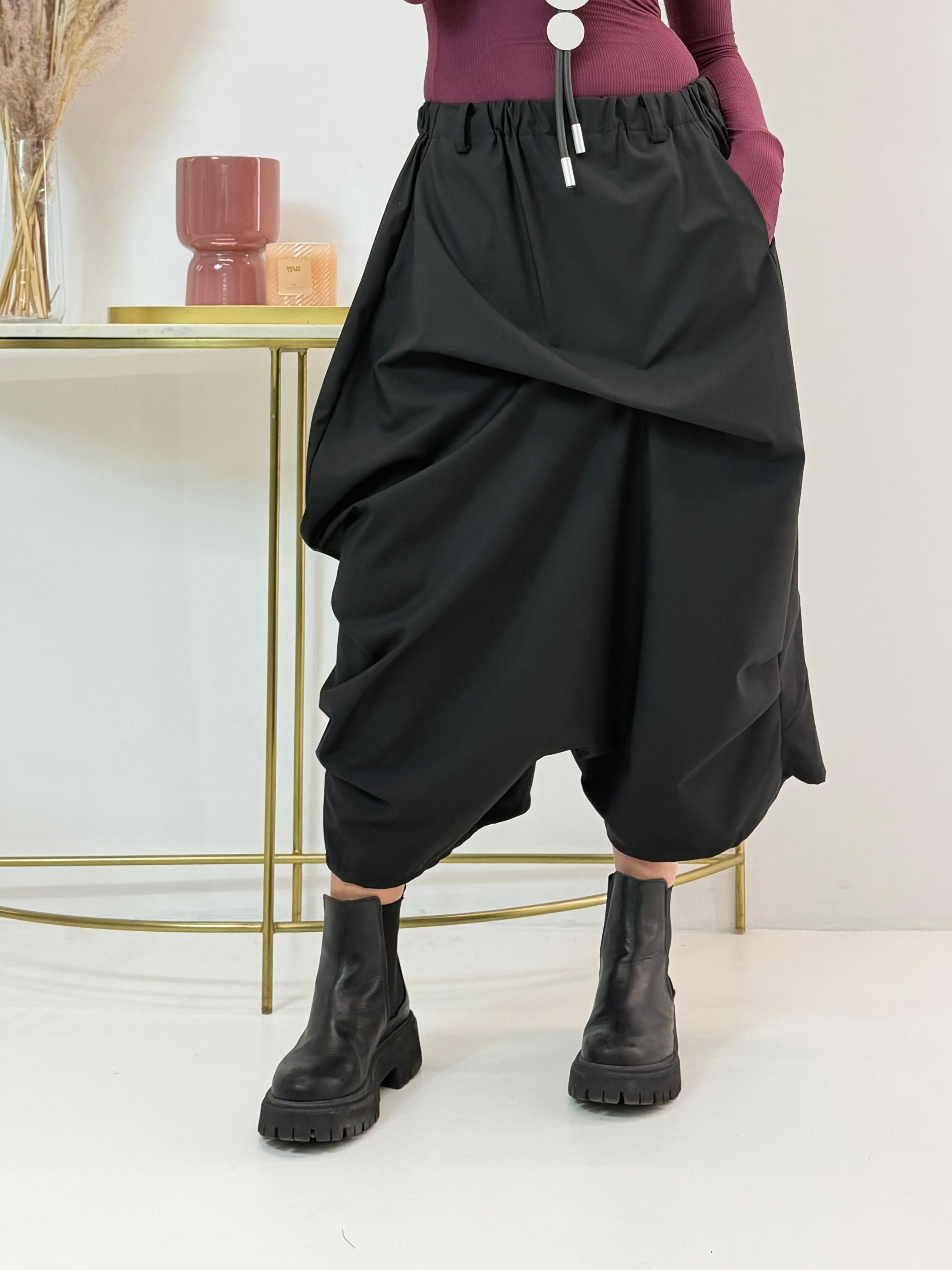 Pantagonna in tessuto liscio misto viscosa. Fascia elasticizzata in vita. Dettaglio pieghe. Tasche laterali a scomparsa. Cavallo molto basso. Vestibilità ampia e comoda.