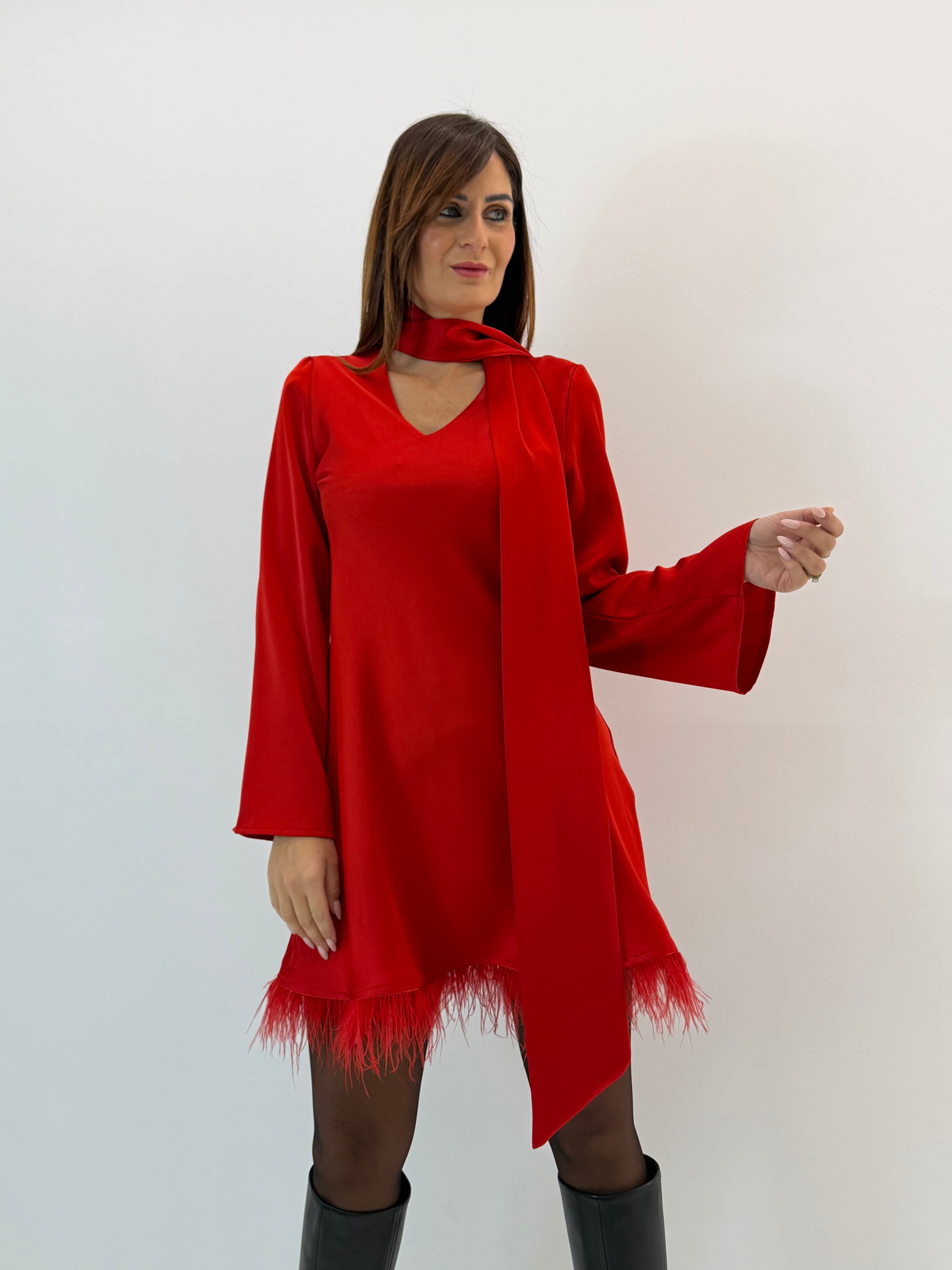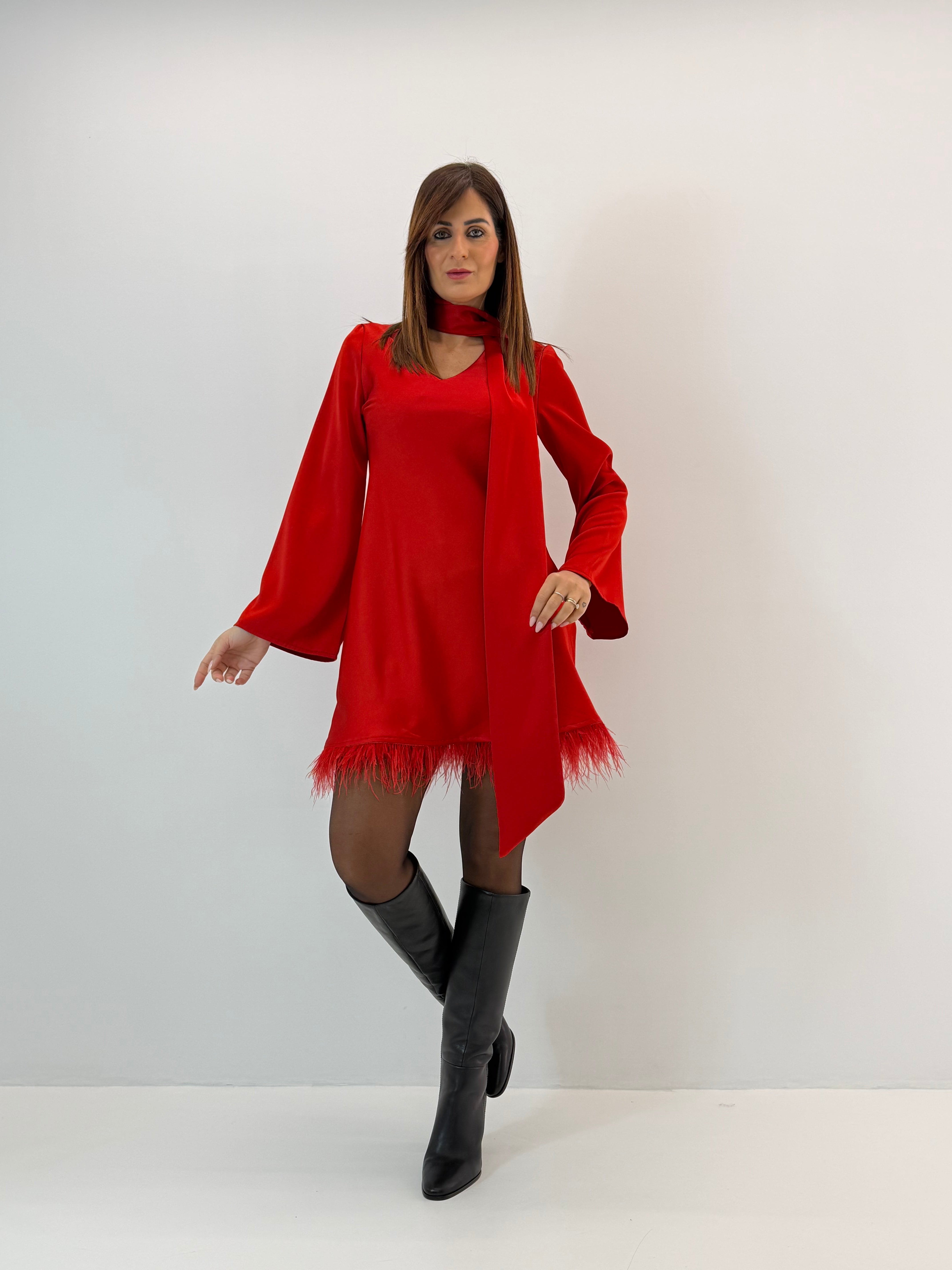Abito, effetto satin, scollo a V con fusciacca integrata sul davanti, maniche lunghe svasate sul fondo, orlo con piume.