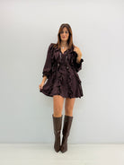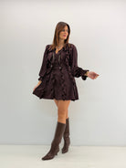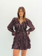 Abito effetto satin, scollo a V, manica lunga con elastico sul polsino, rouge sul davanti. Vestibilità a taglie.