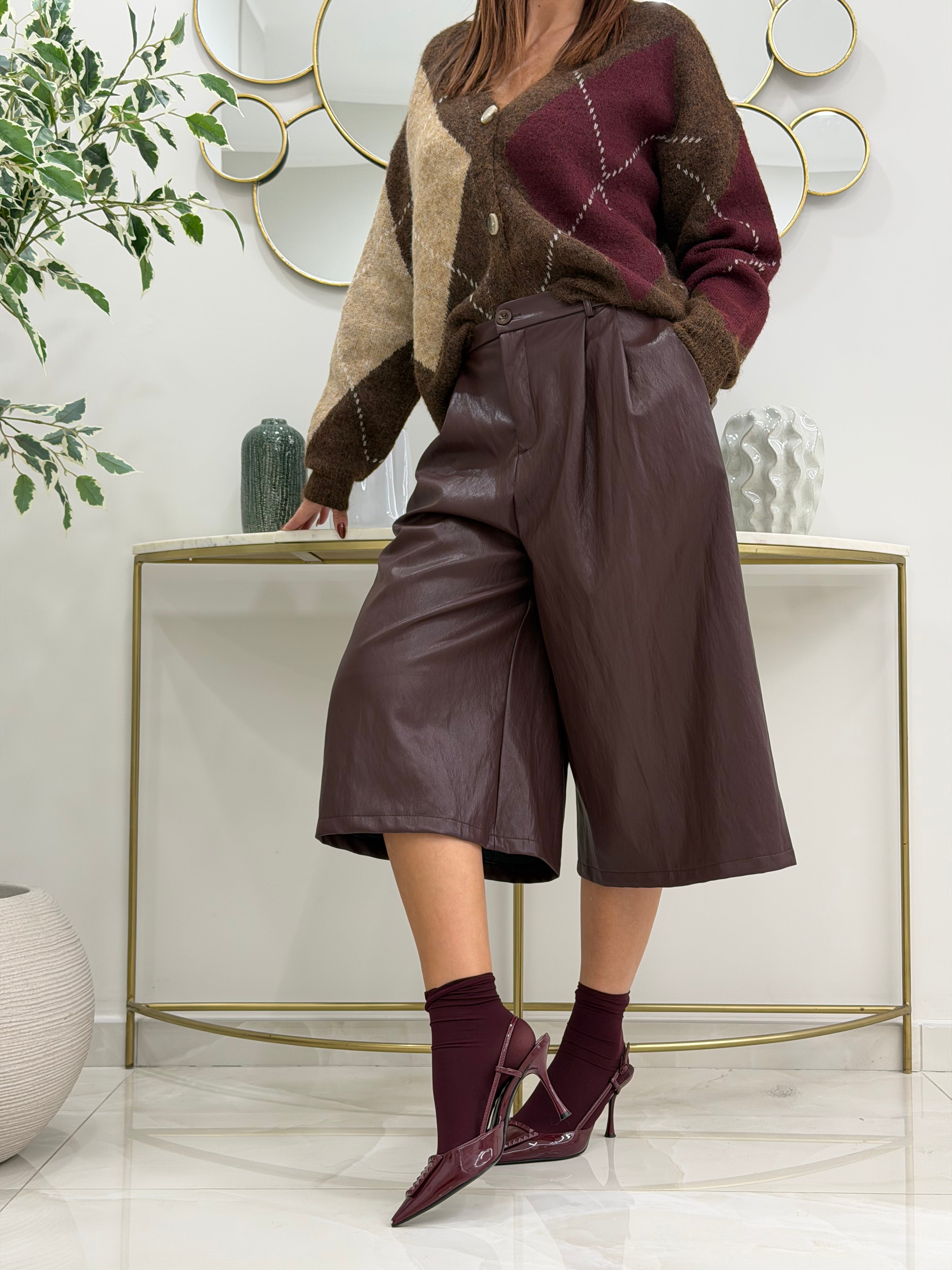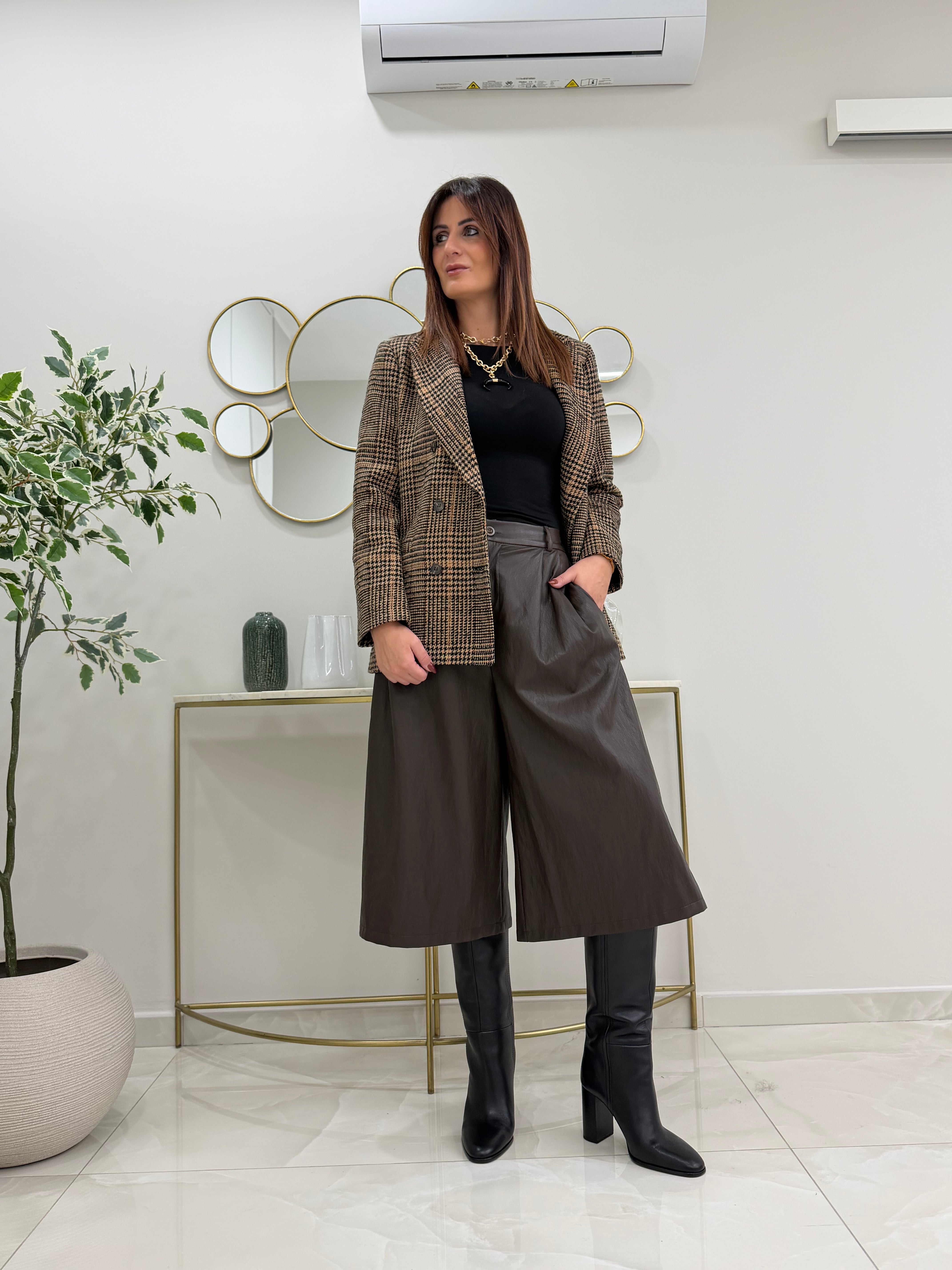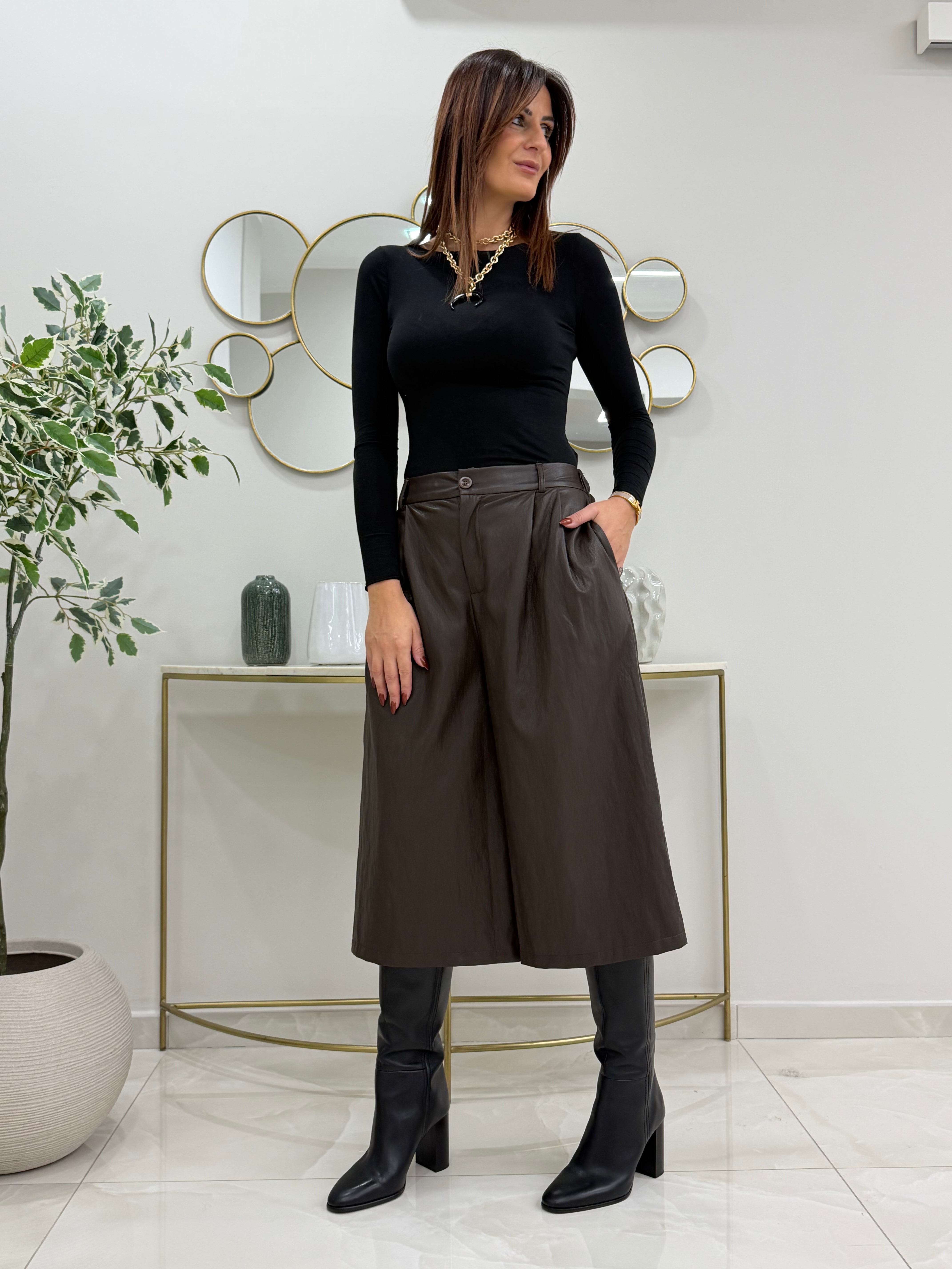 Pantalone in ecopelle, elastico in vita dietro, chiusura con zip e bottone, passanti per cintura, tasche laterali a scomparsa, pinces davanti, vestibilità a taglie.