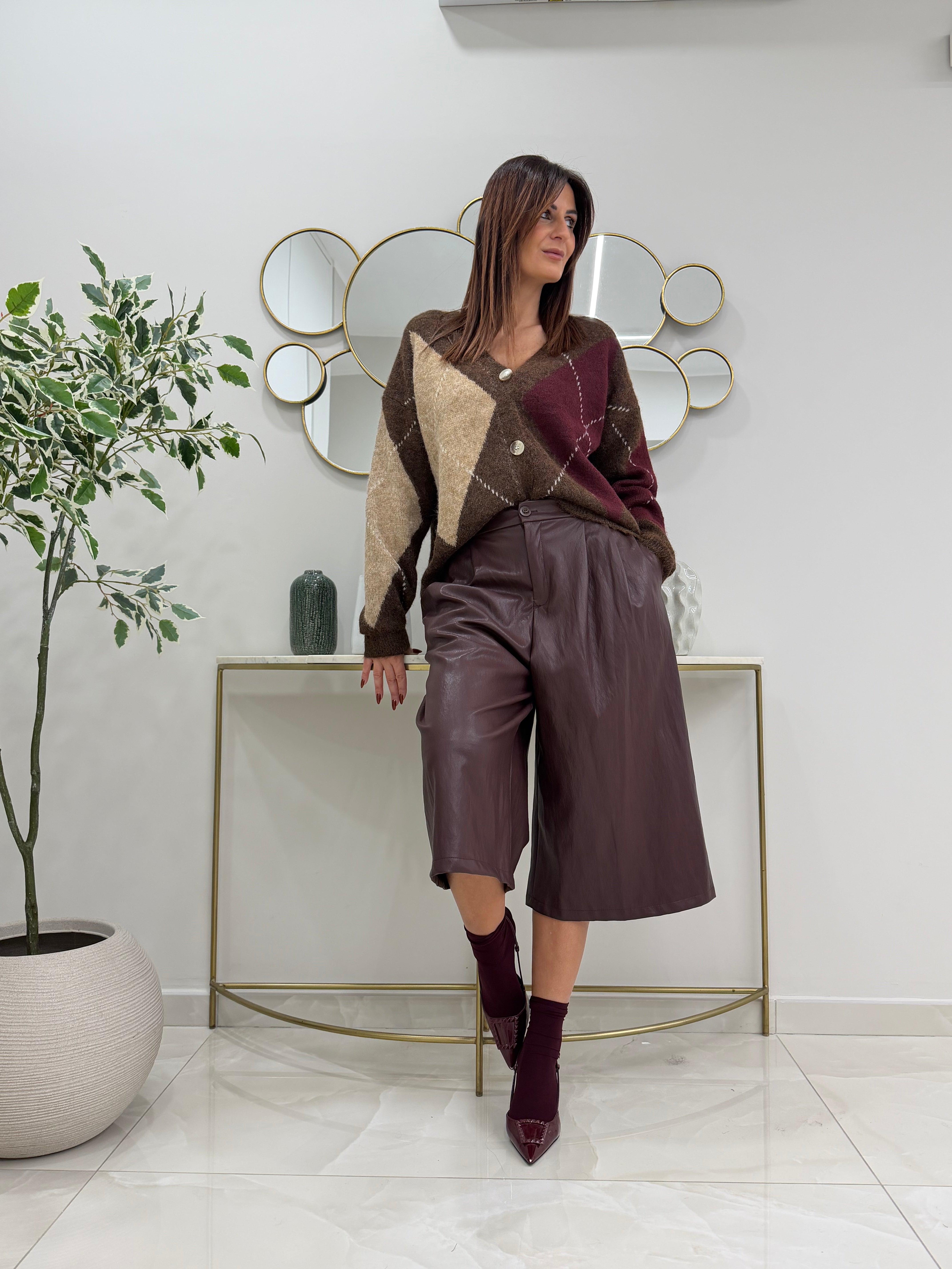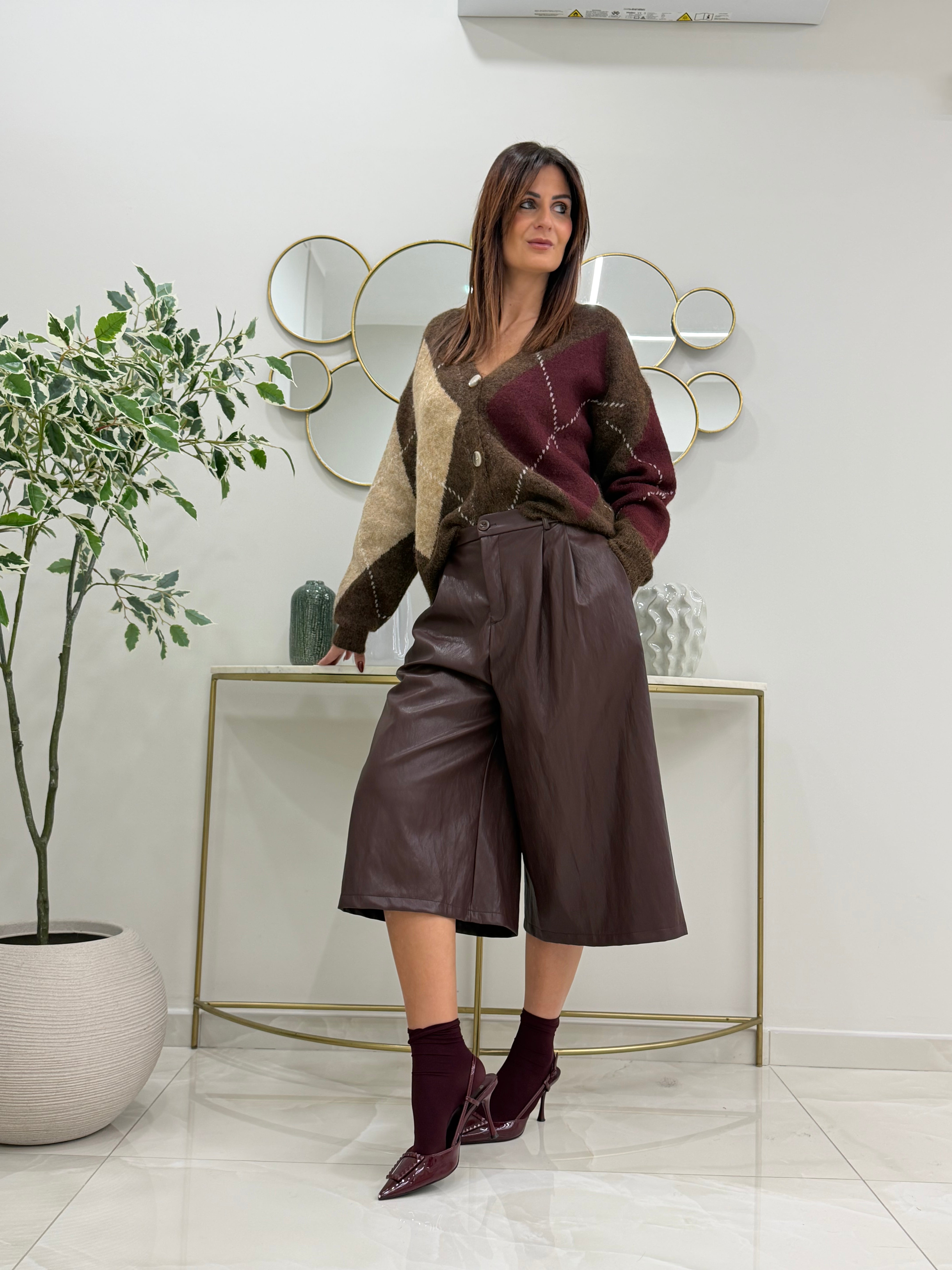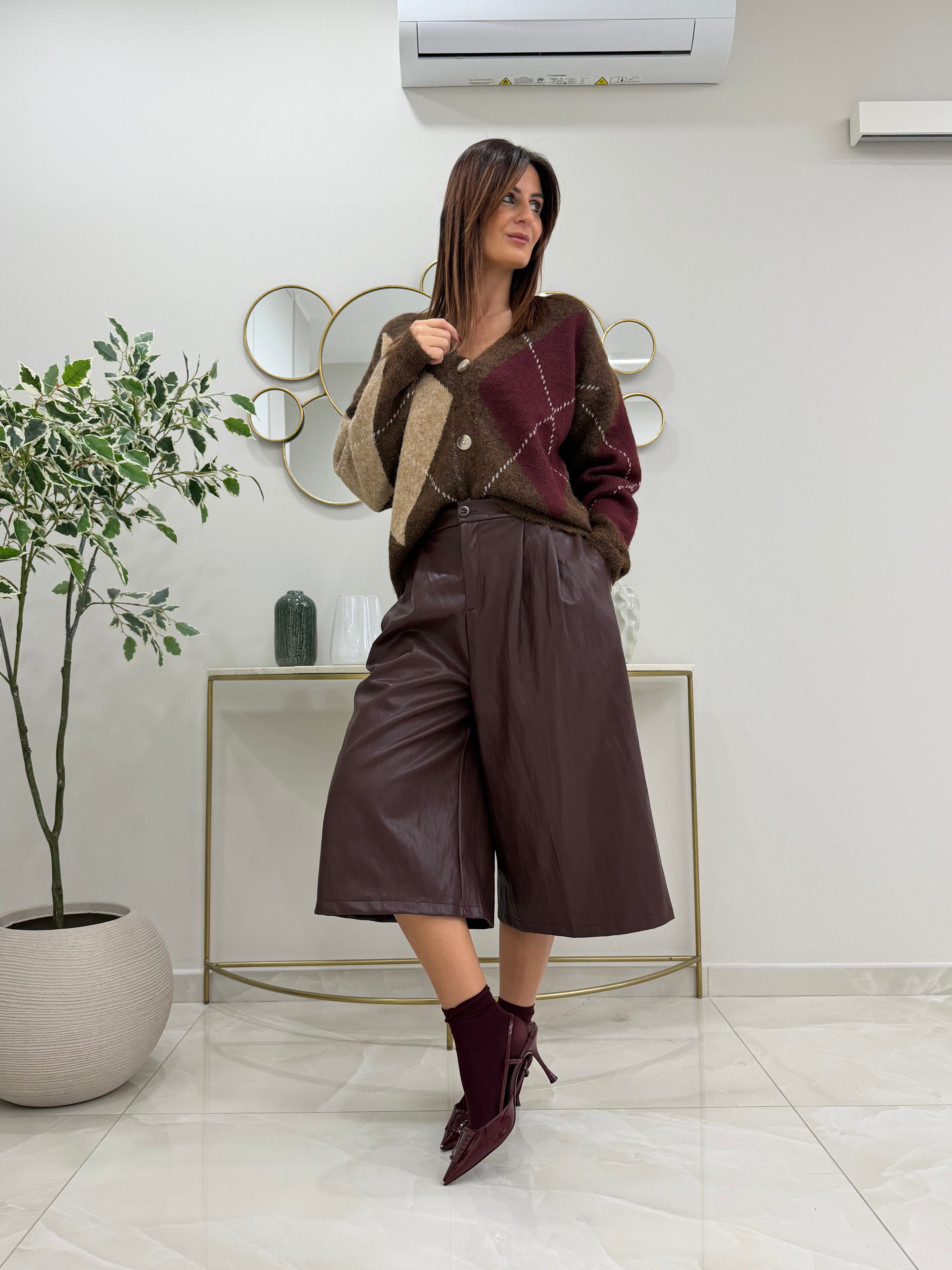 Pantalone in ecopelle, elastico in vita dietro, chiusura con zip e bottone, passanti per cintura, tasche laterali a scomparsa, pinces davanti, vestibilità a taglie.