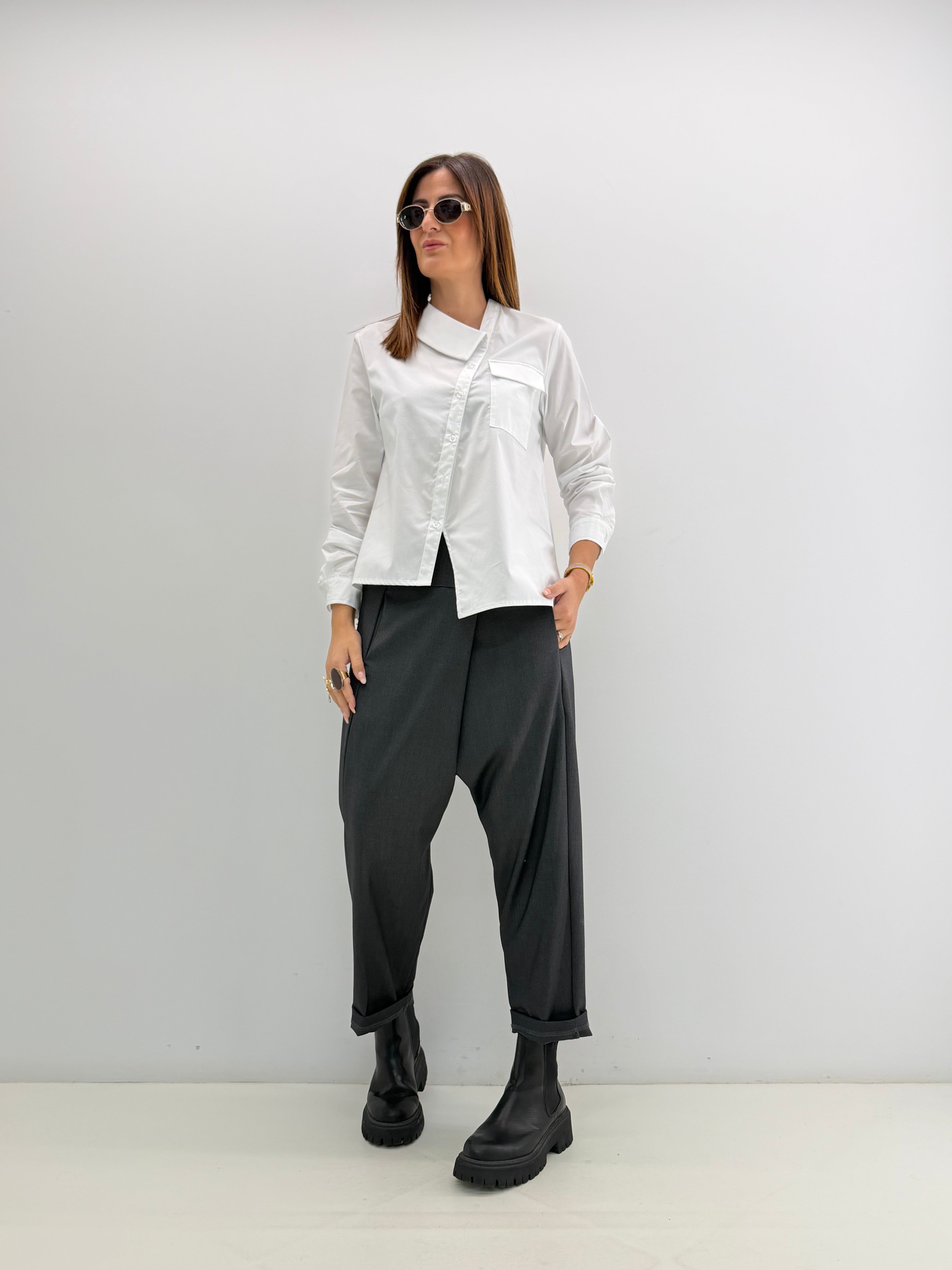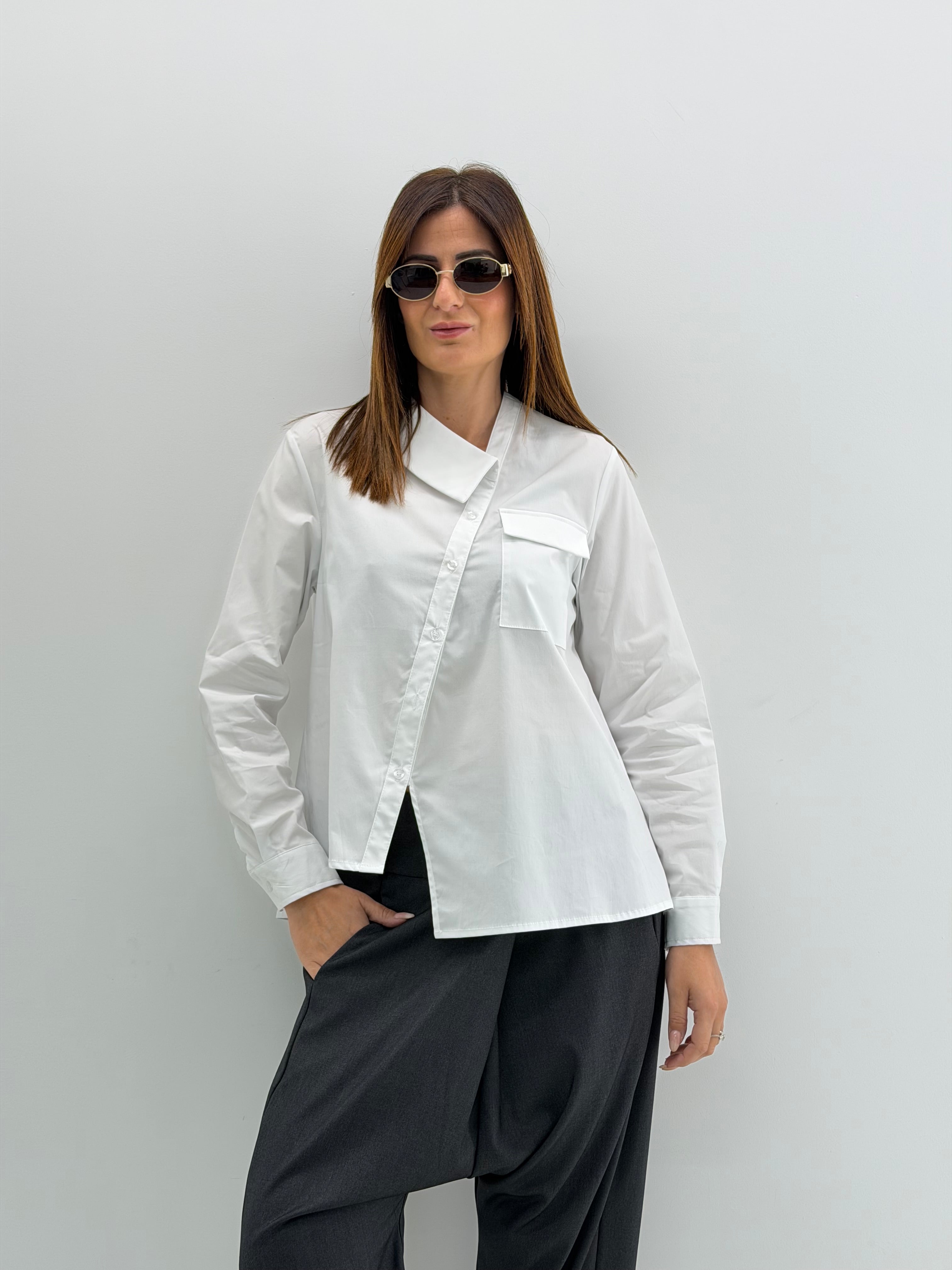 Camicia in cotone, con taglio asimmetrico. Dettaglio tasca lato cuore. Chiusura con bottoni trasversali. Comoda vestibilità.
