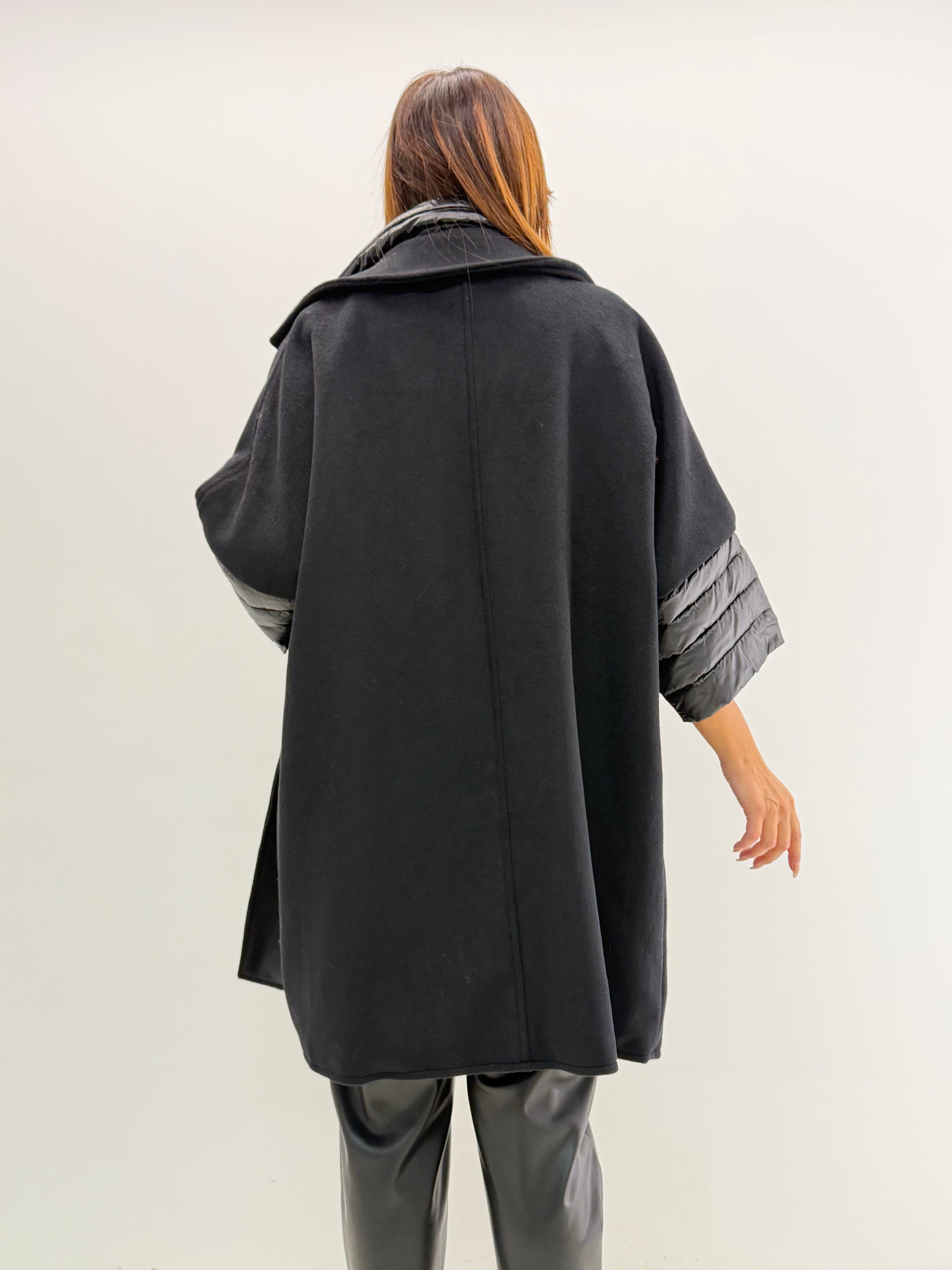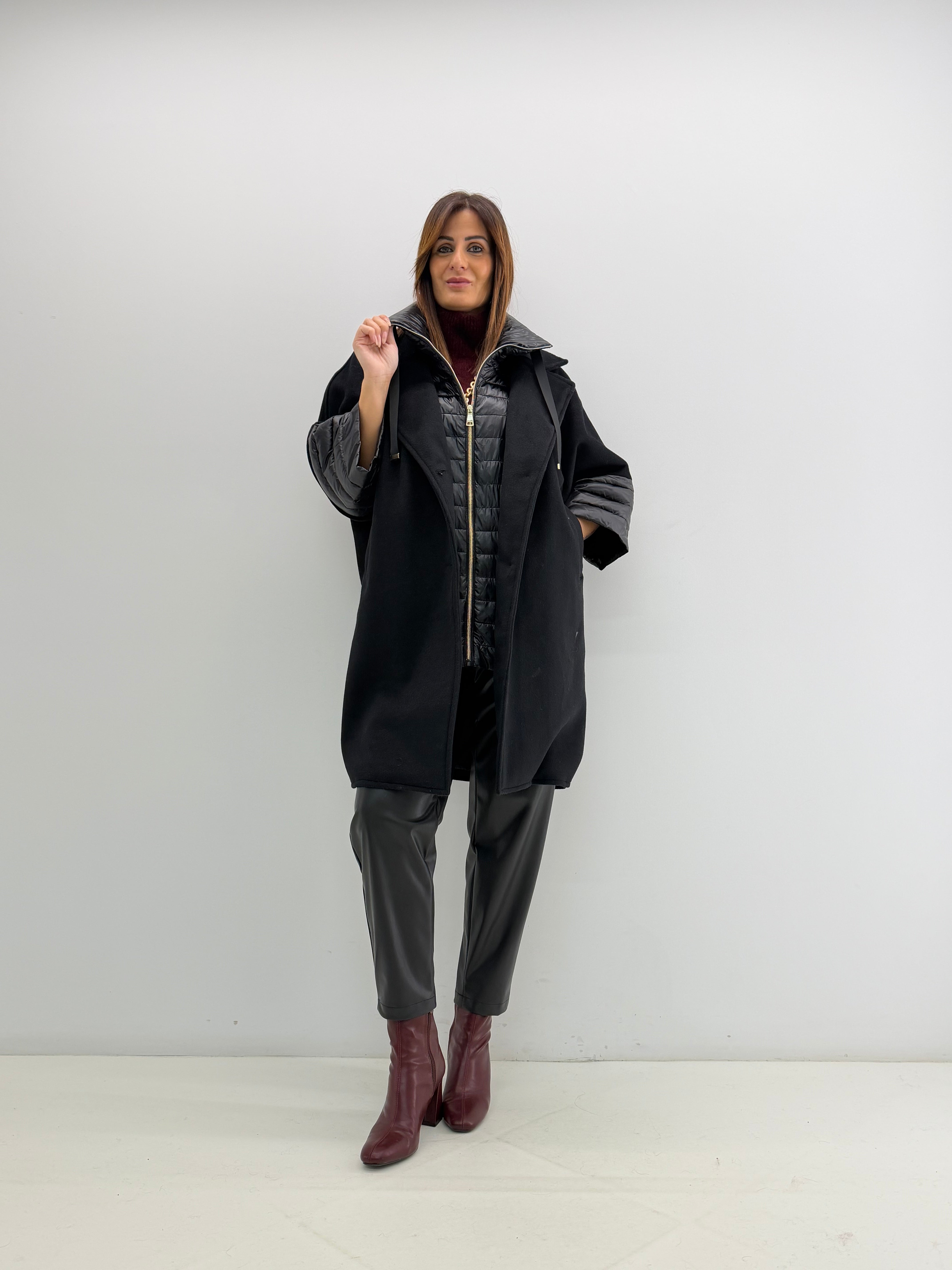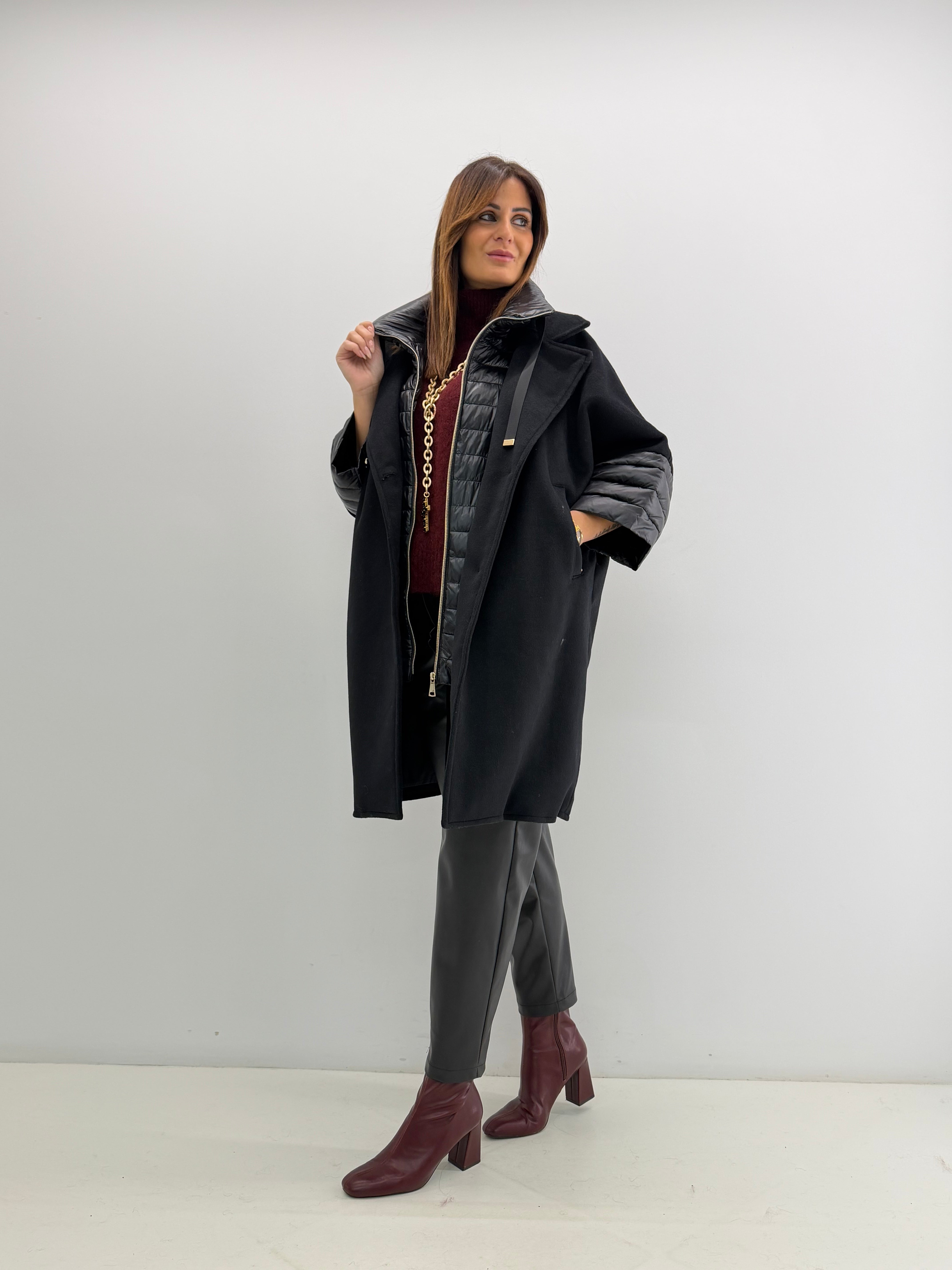 Cappotto in panno, con inserti in piumino, chiusura con zip e bottoni, tasche laterali, foderato all'interno.