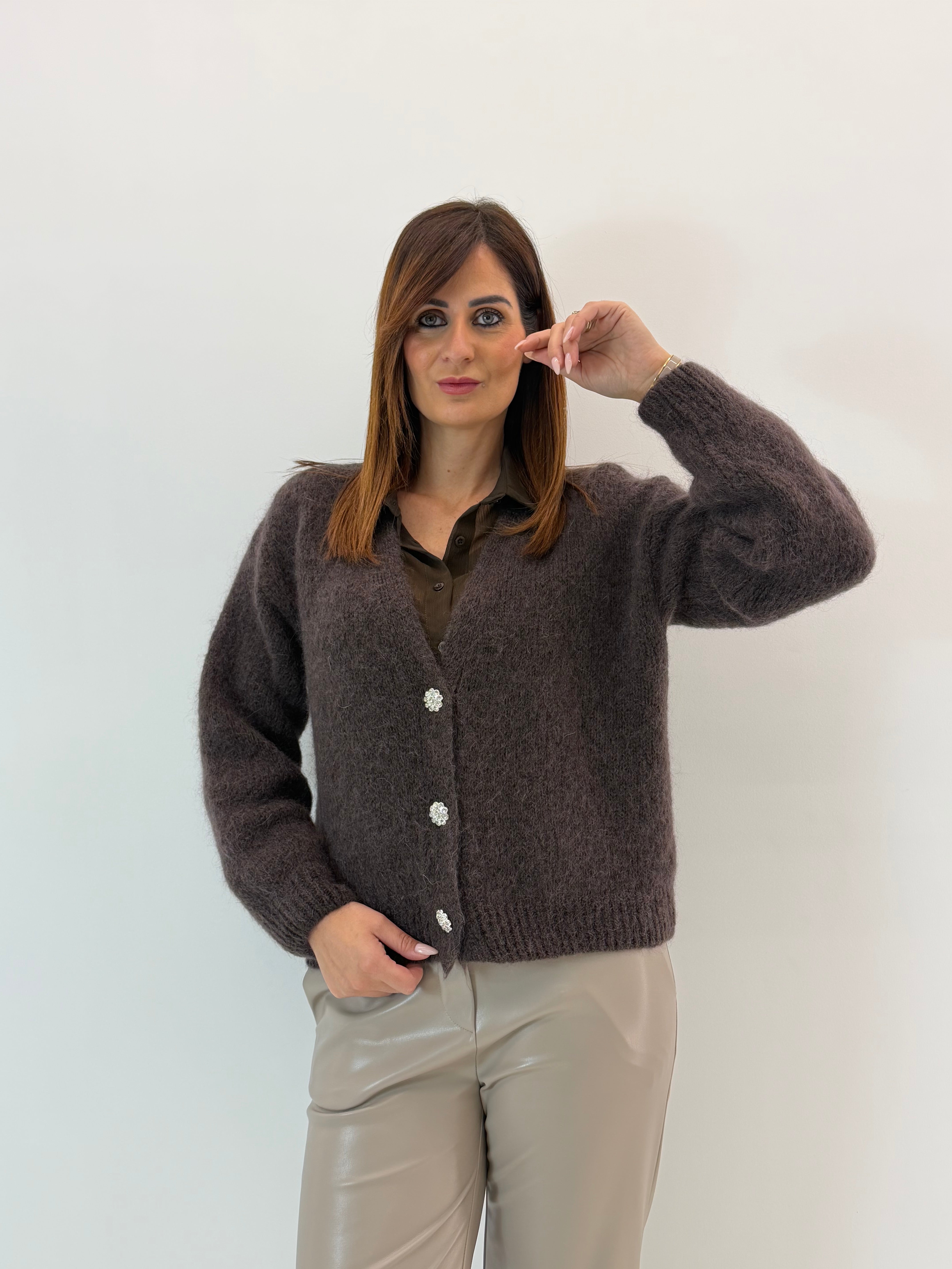 Cardigan in misto mohair, scollo a V e chiusura con bottoni gioiello.