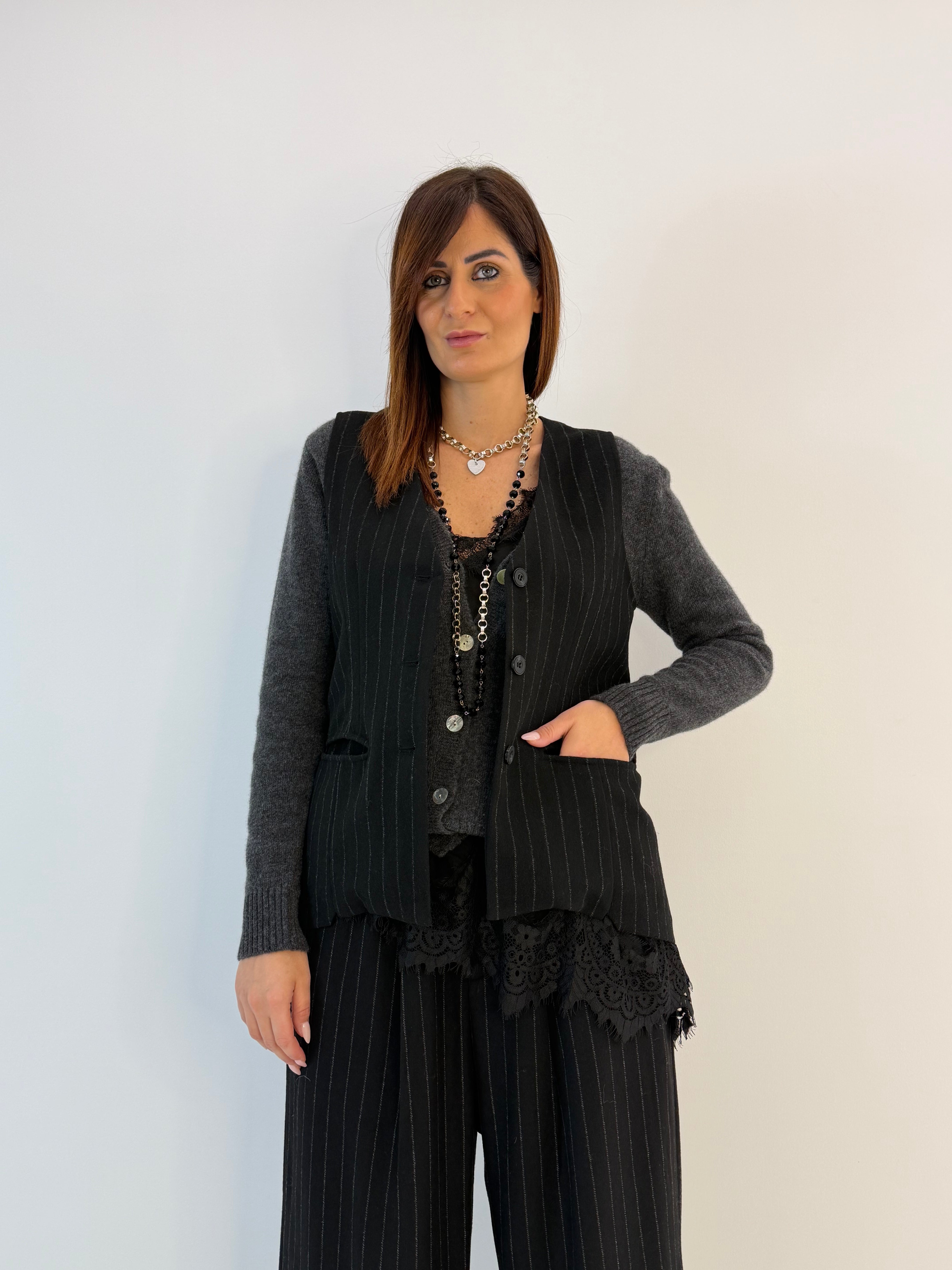 Gilet in panno, fantasia gessata, scollo a V chiusura con bottoni davanti. Retro con inserto di tessuto semi trasparente e laccetti.
