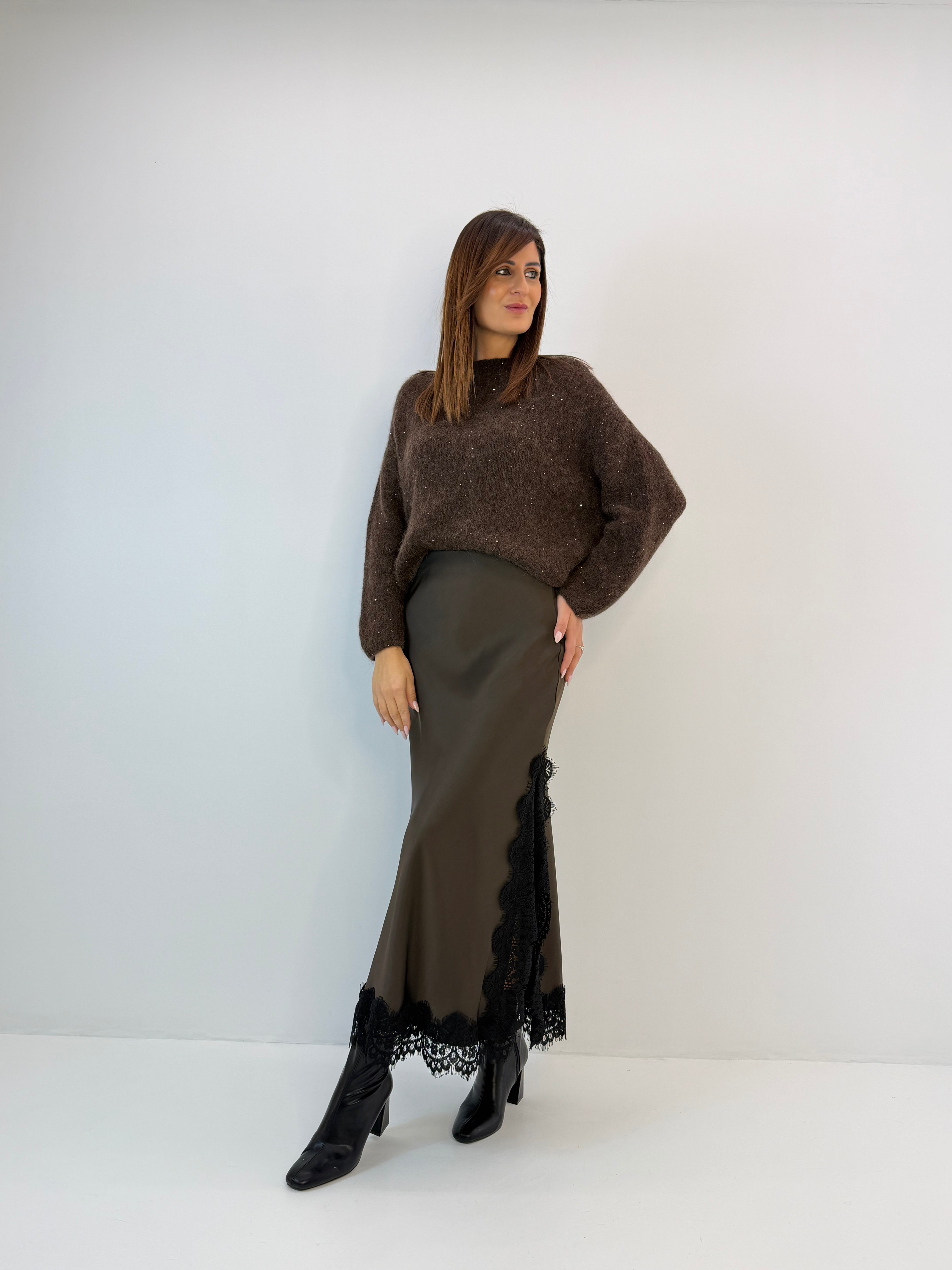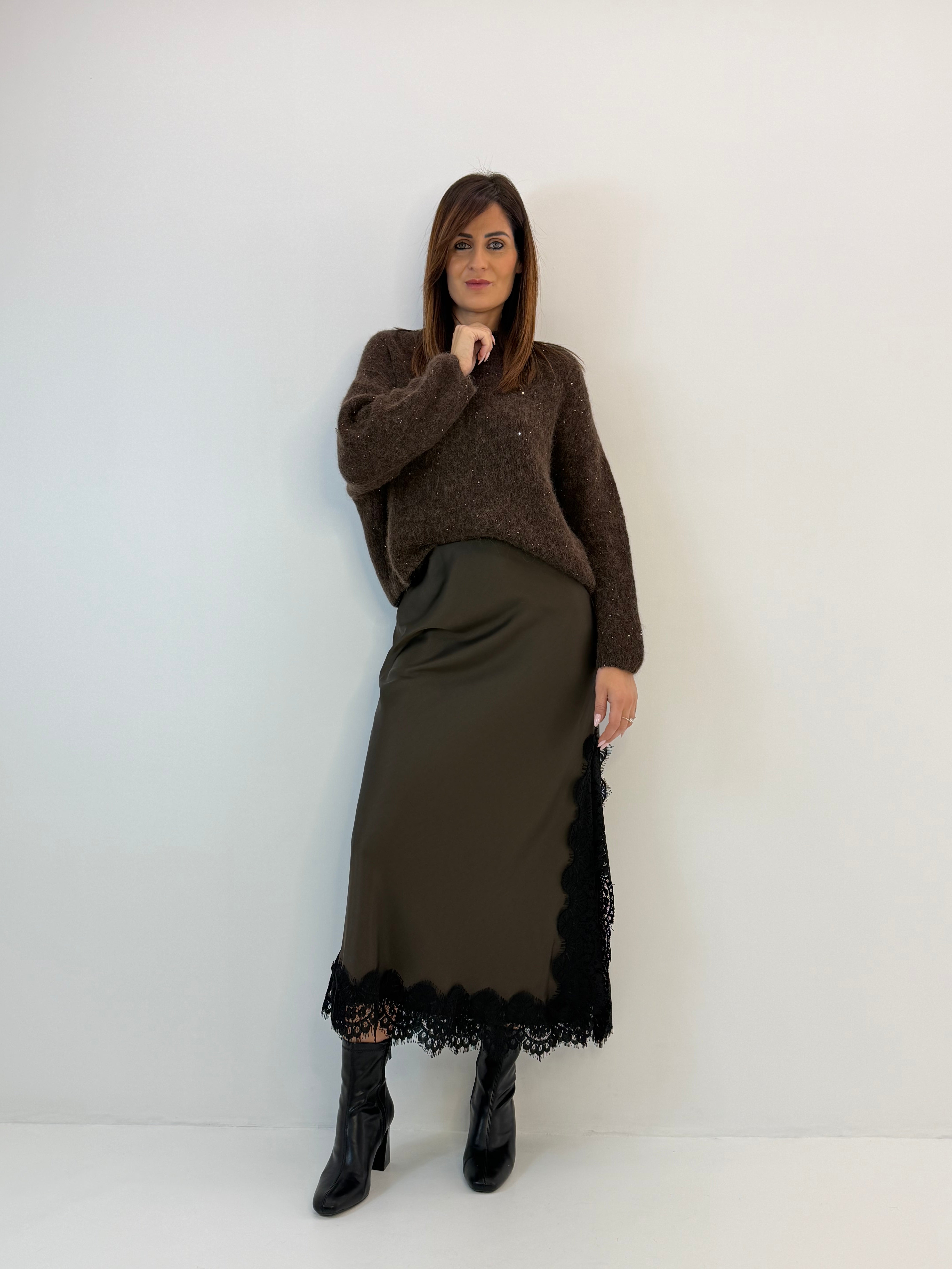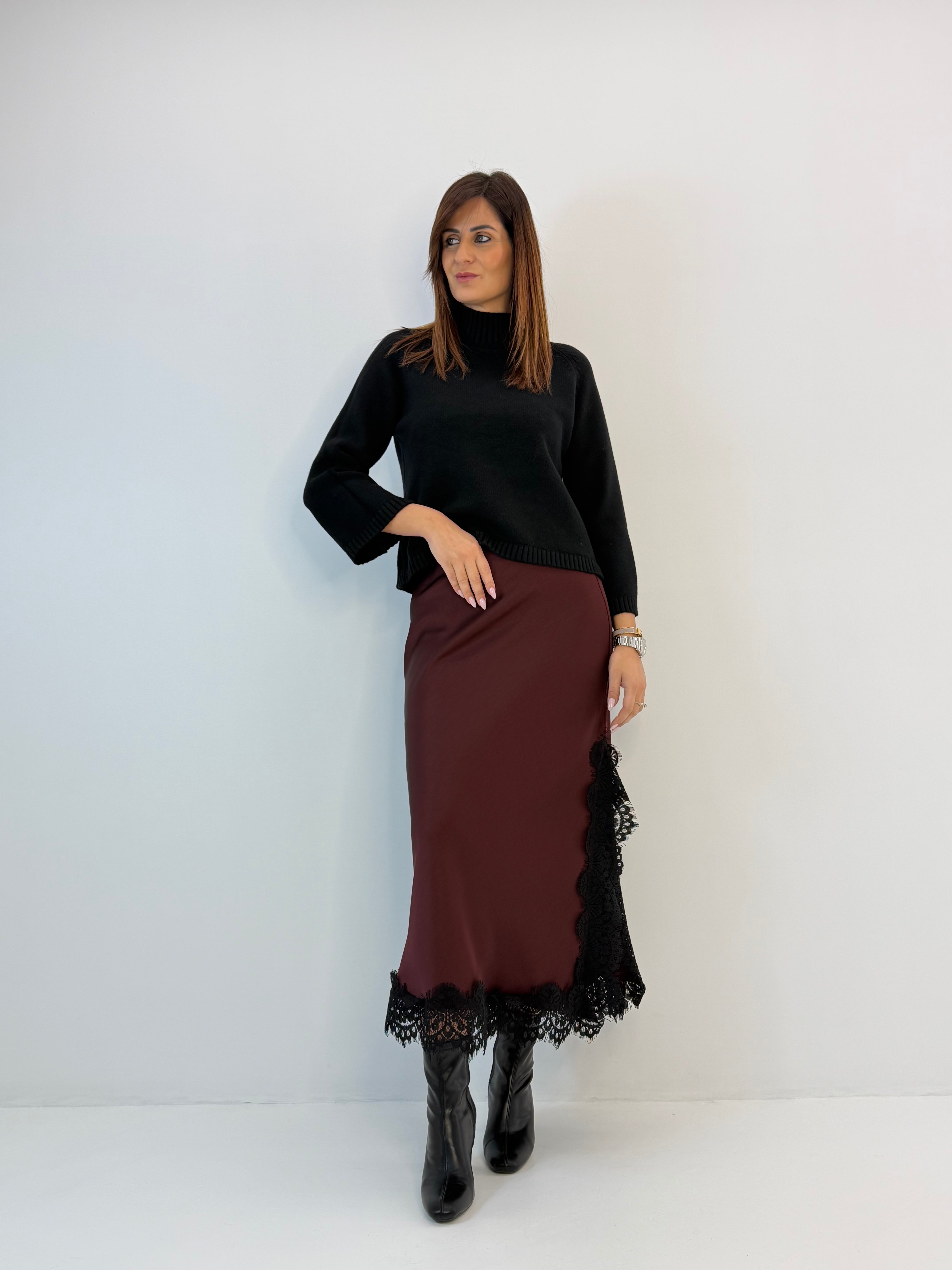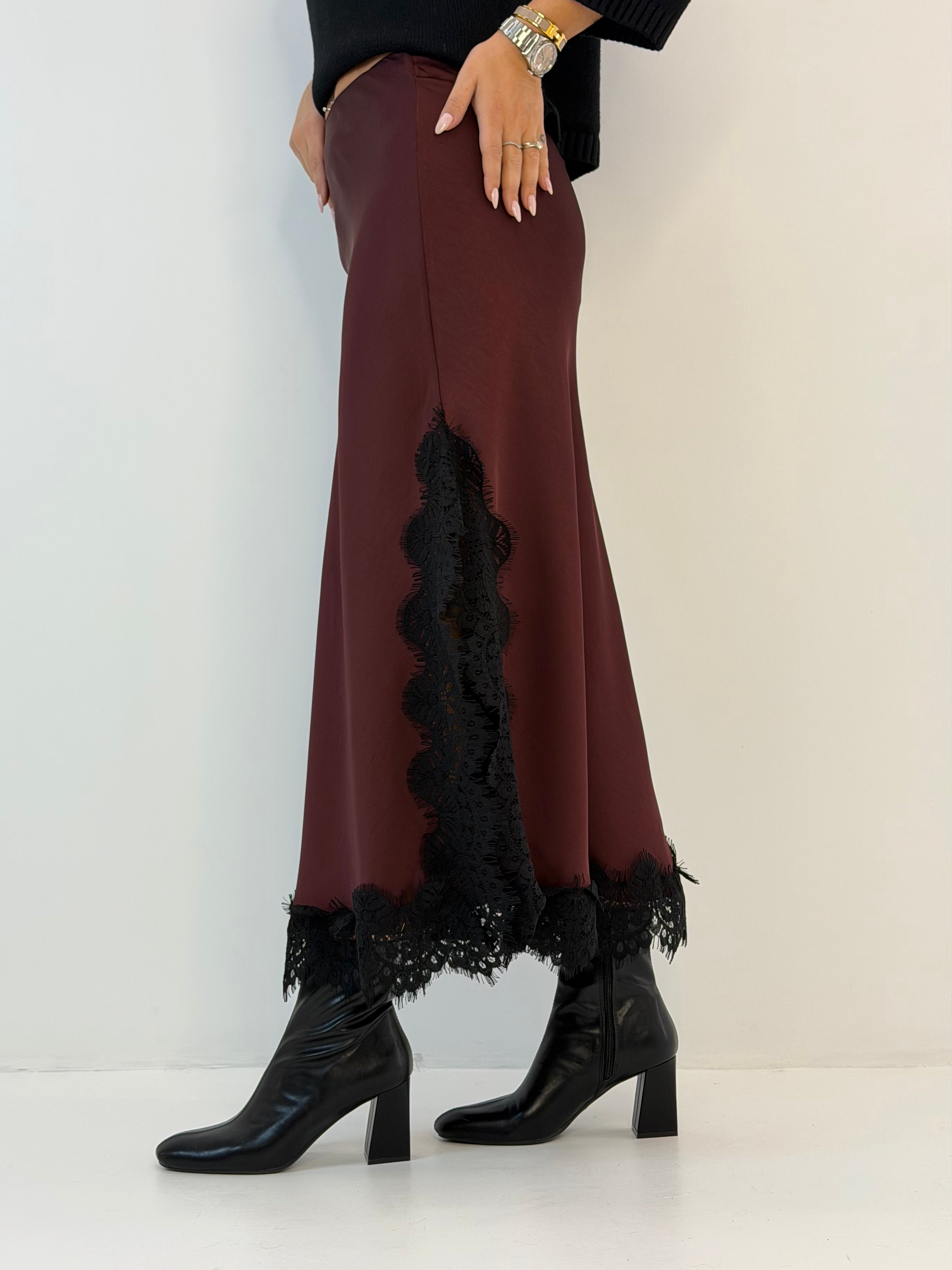 Gonna effetto satin, con elastico in vita, leggermente più lunga dietro, inserti in pizzo e spacco laterale.
