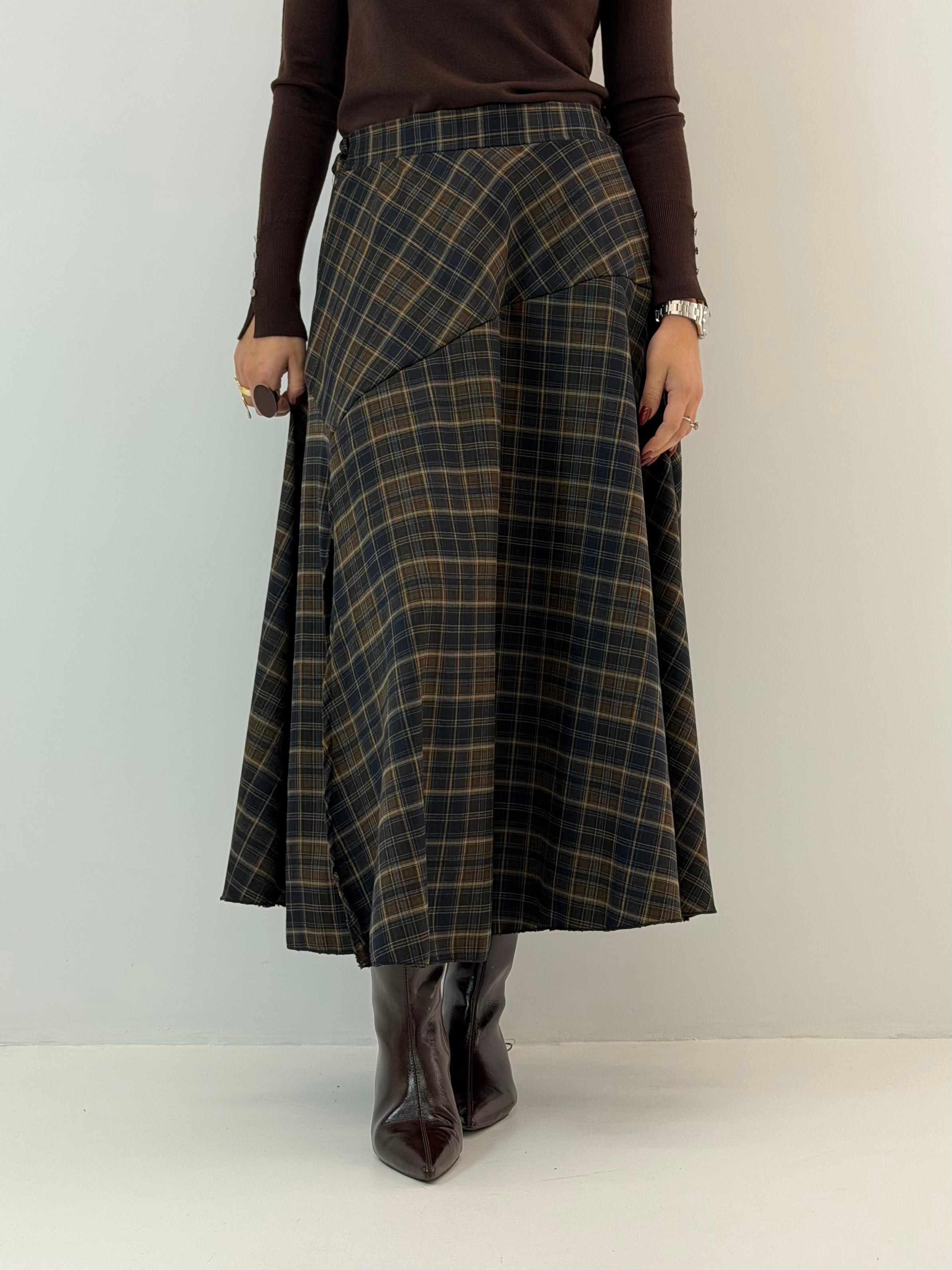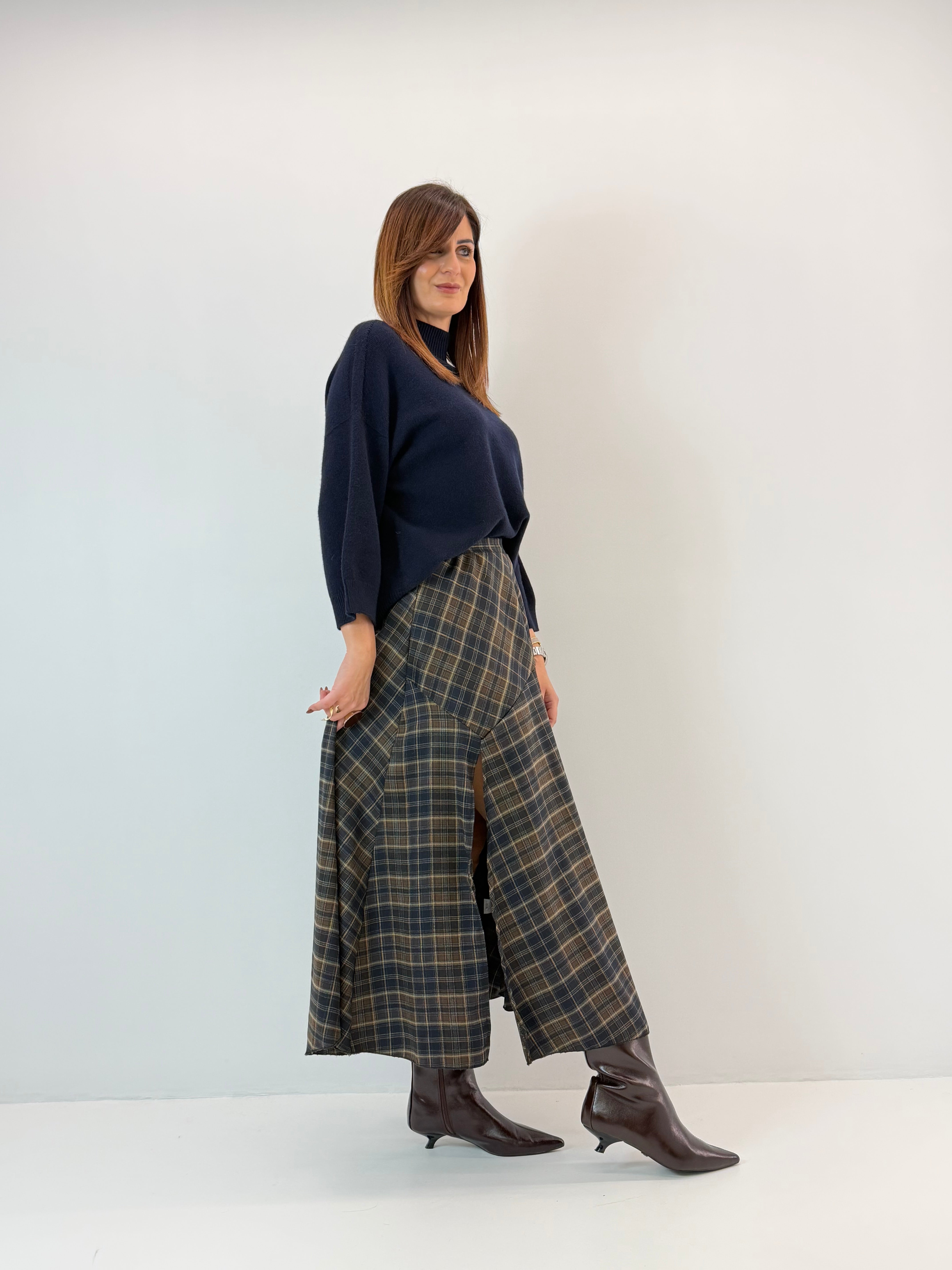 Gonna a quadri, spacco laterale ed elastico in vita dietro.