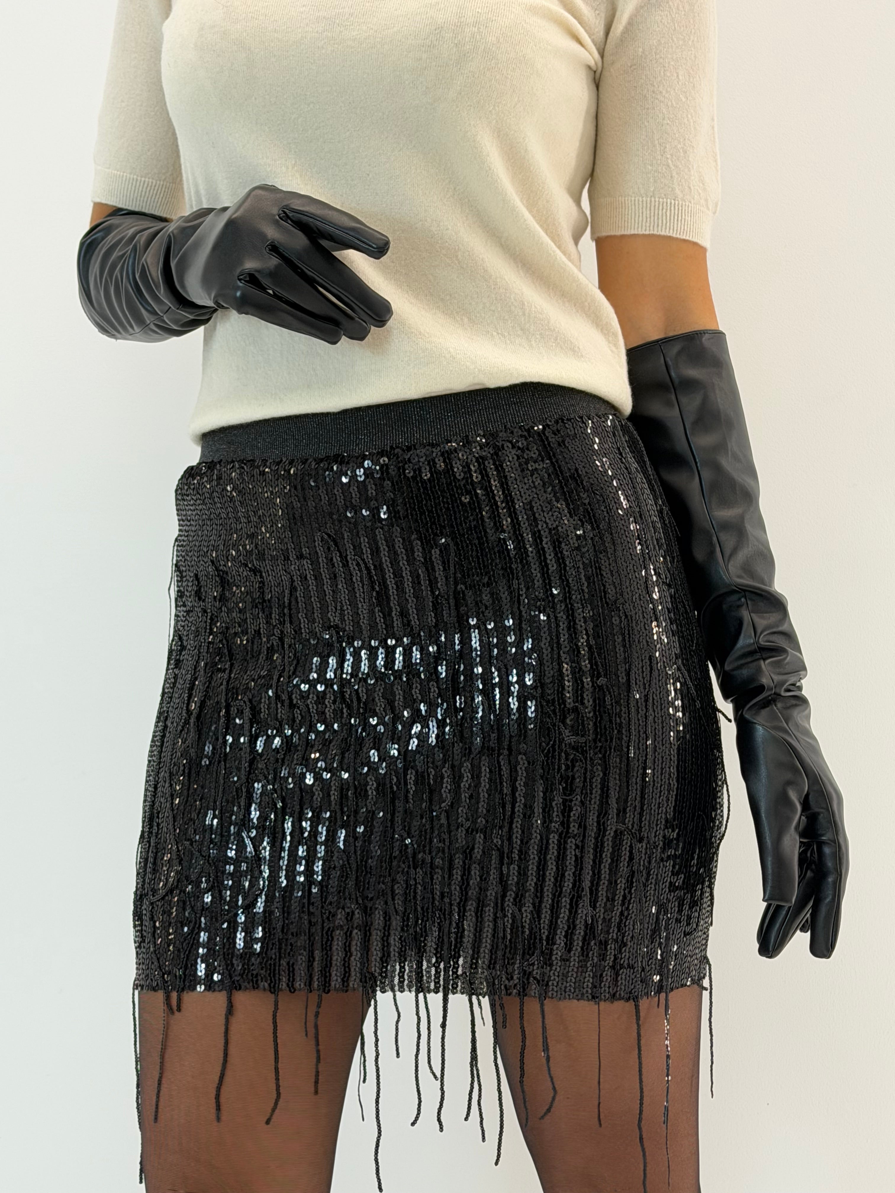 Minigonna con paillettes e frange, senza chiusure, elastico in vita. Fodera interna.
