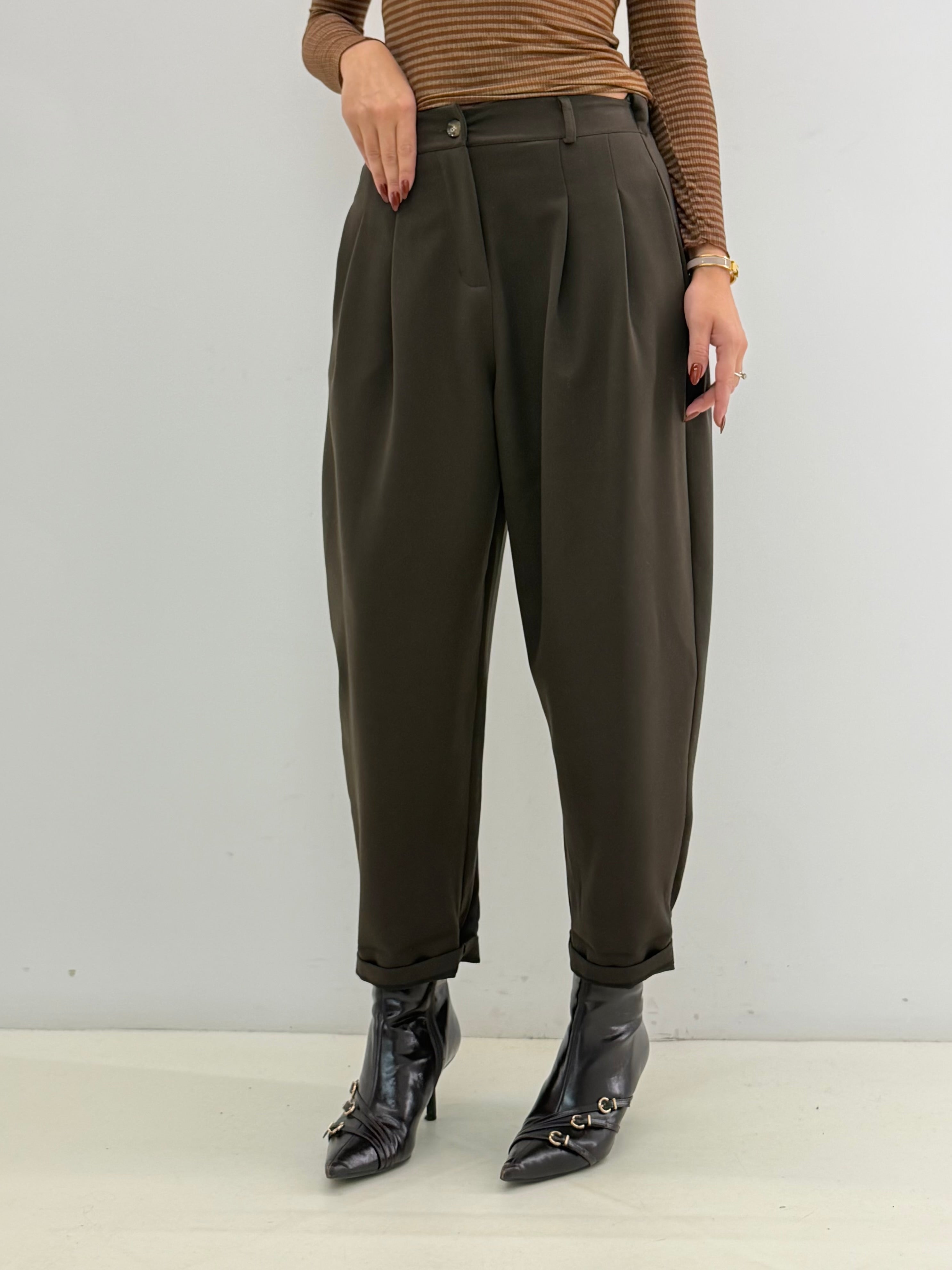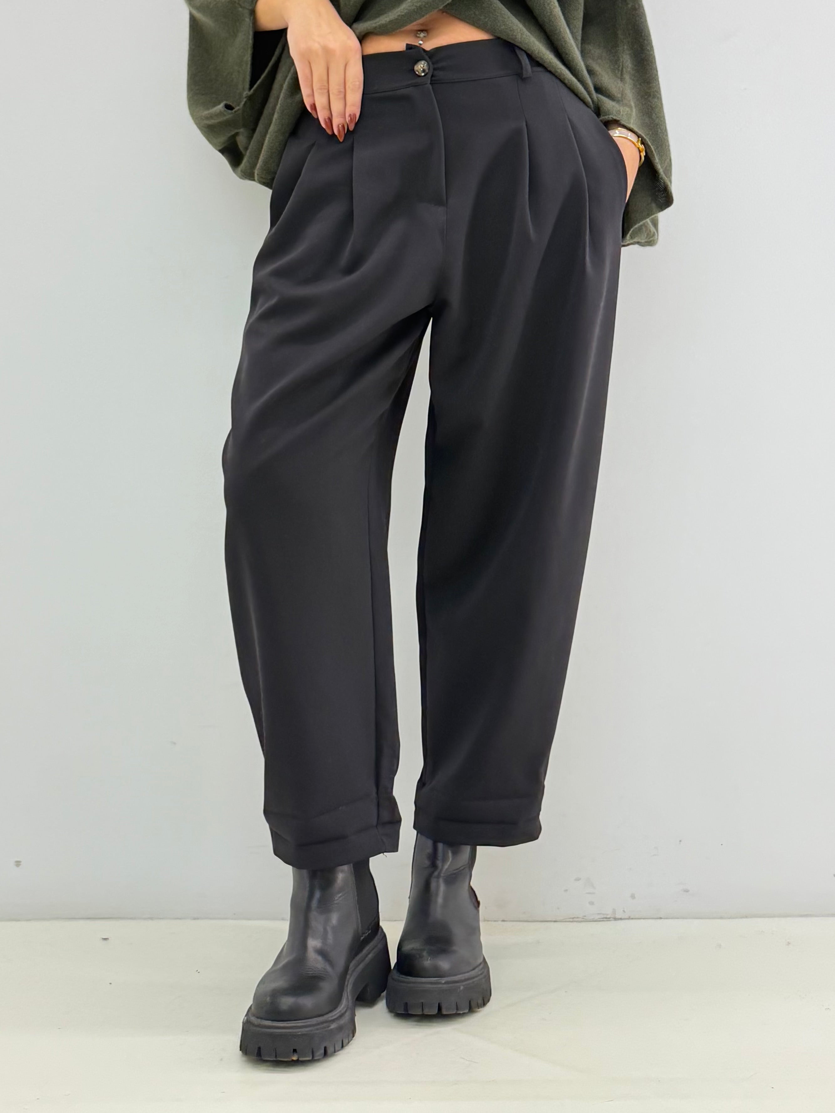 Pantalone a vita alta in misto viscosa. Fascia elasticizzata in vita dietro, morbido nella gamba, chiusura con bottone e zip, passanti per cintura, pinces sul davanti, tasche laterali a scomparsa, finte tasche a filetto dietro.