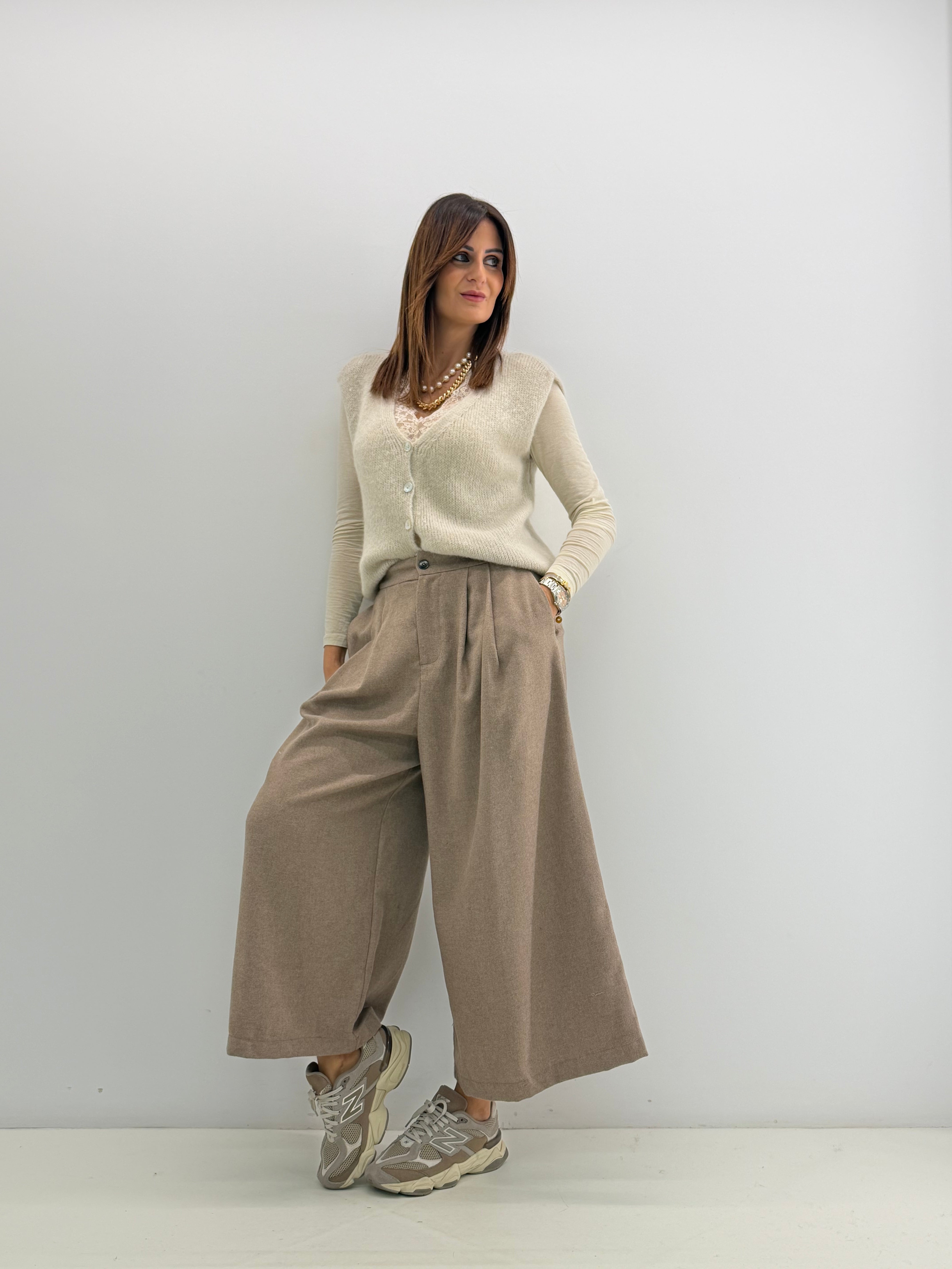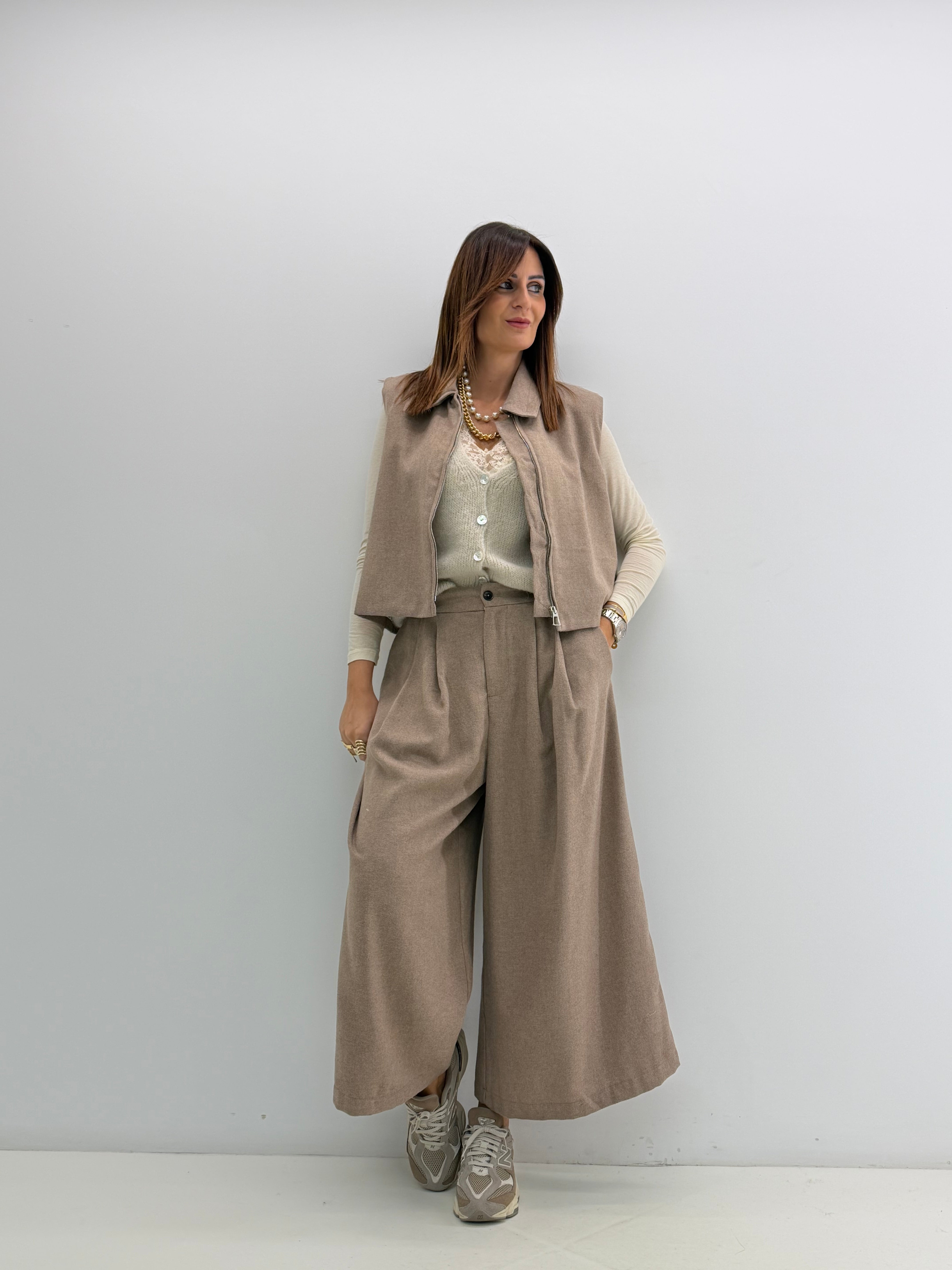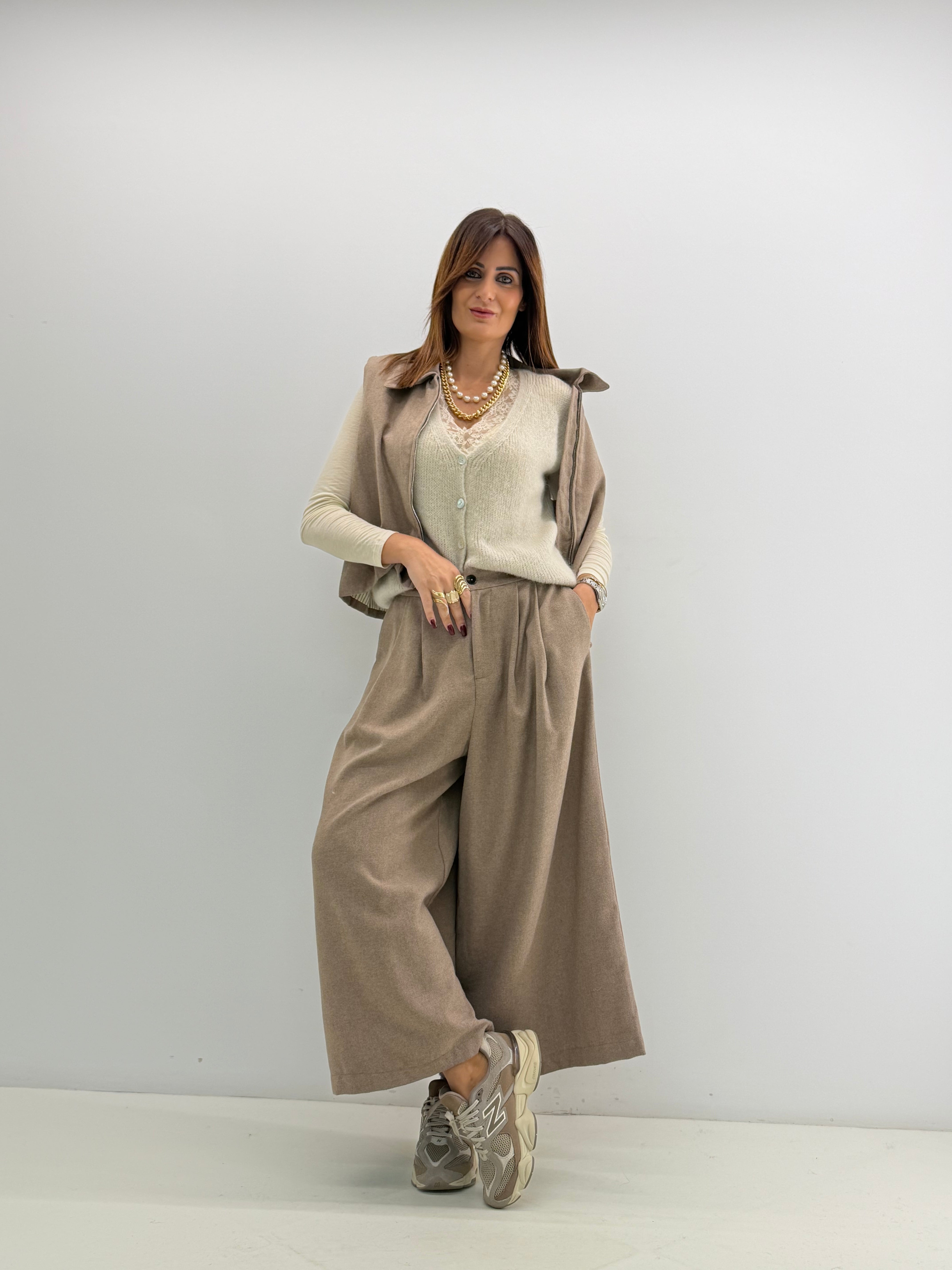 Pantalone, modello a gamba larga, elastico in vita dietro, tasche laterali a scomparsa, chiusura con zip e bottone, pinces davanti.