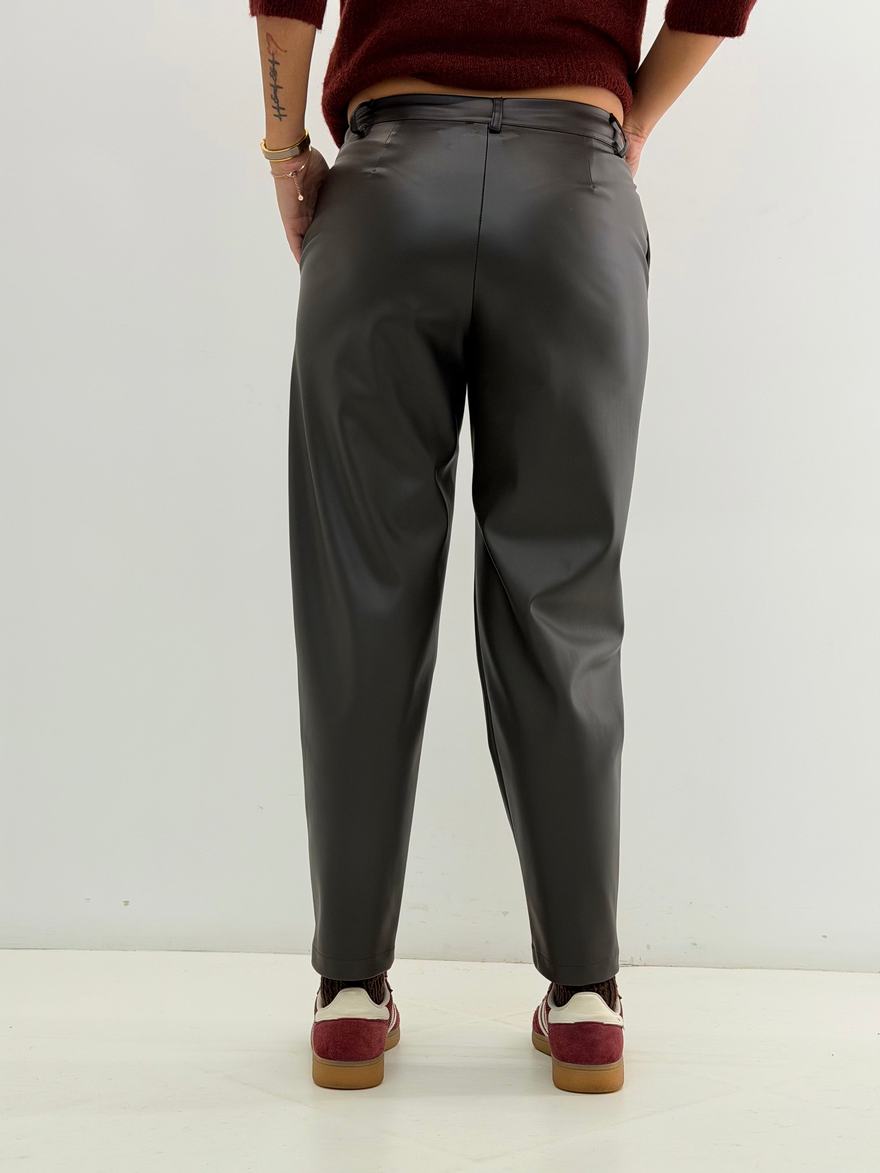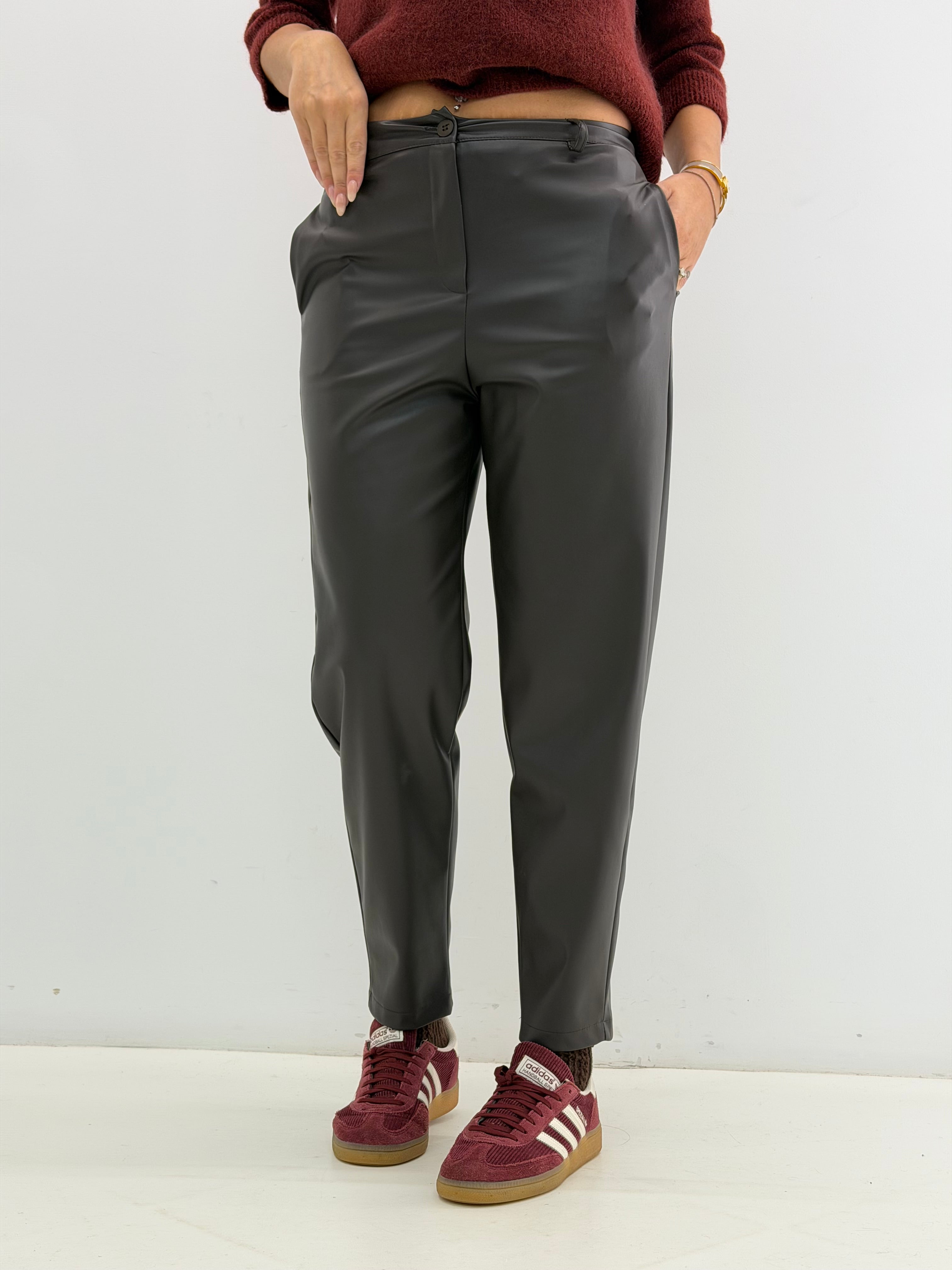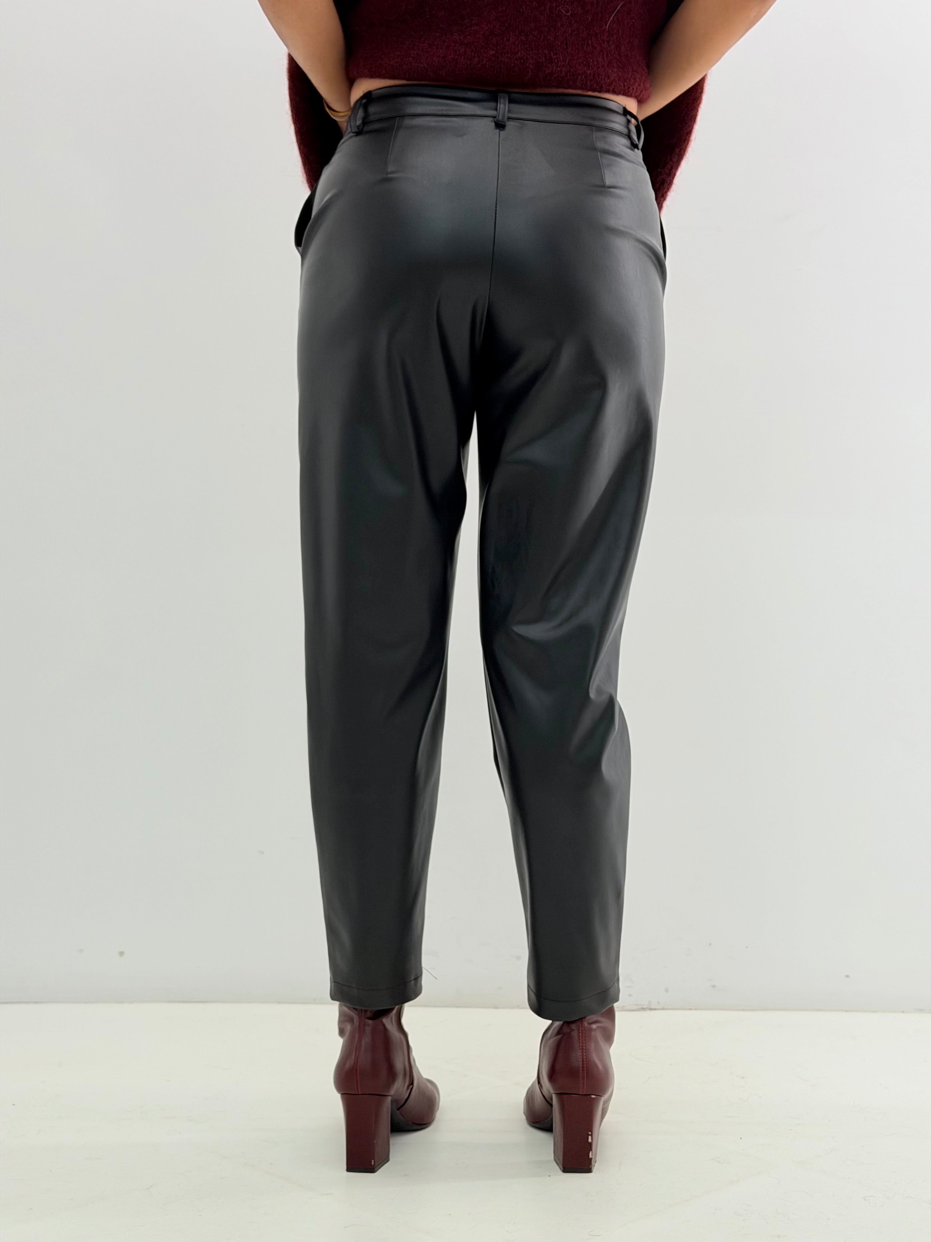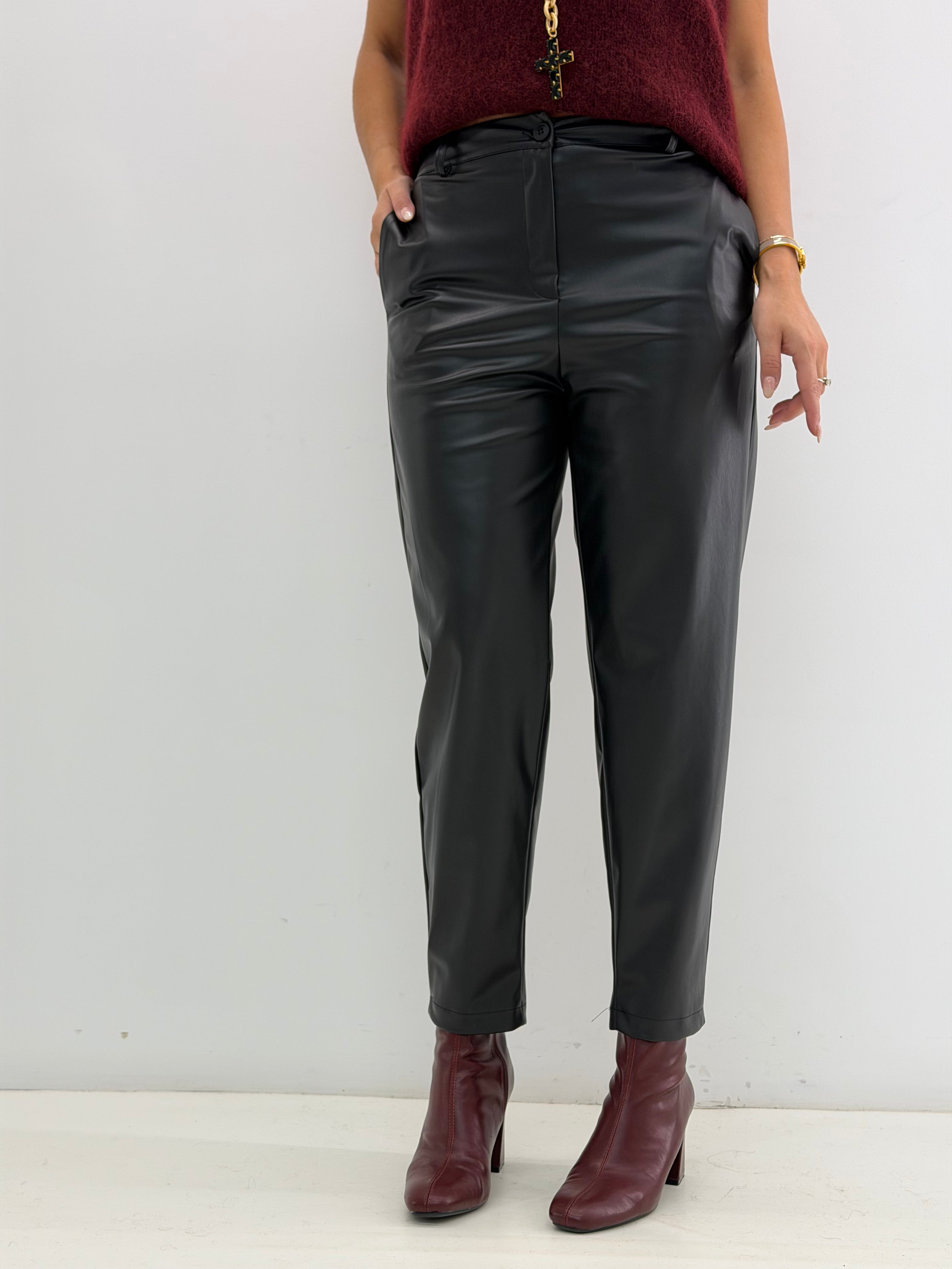Pantalone in ecopelle, modello dritto, chiusura con zip e bottone, passanti per cintura. Vestibilità a taglie.