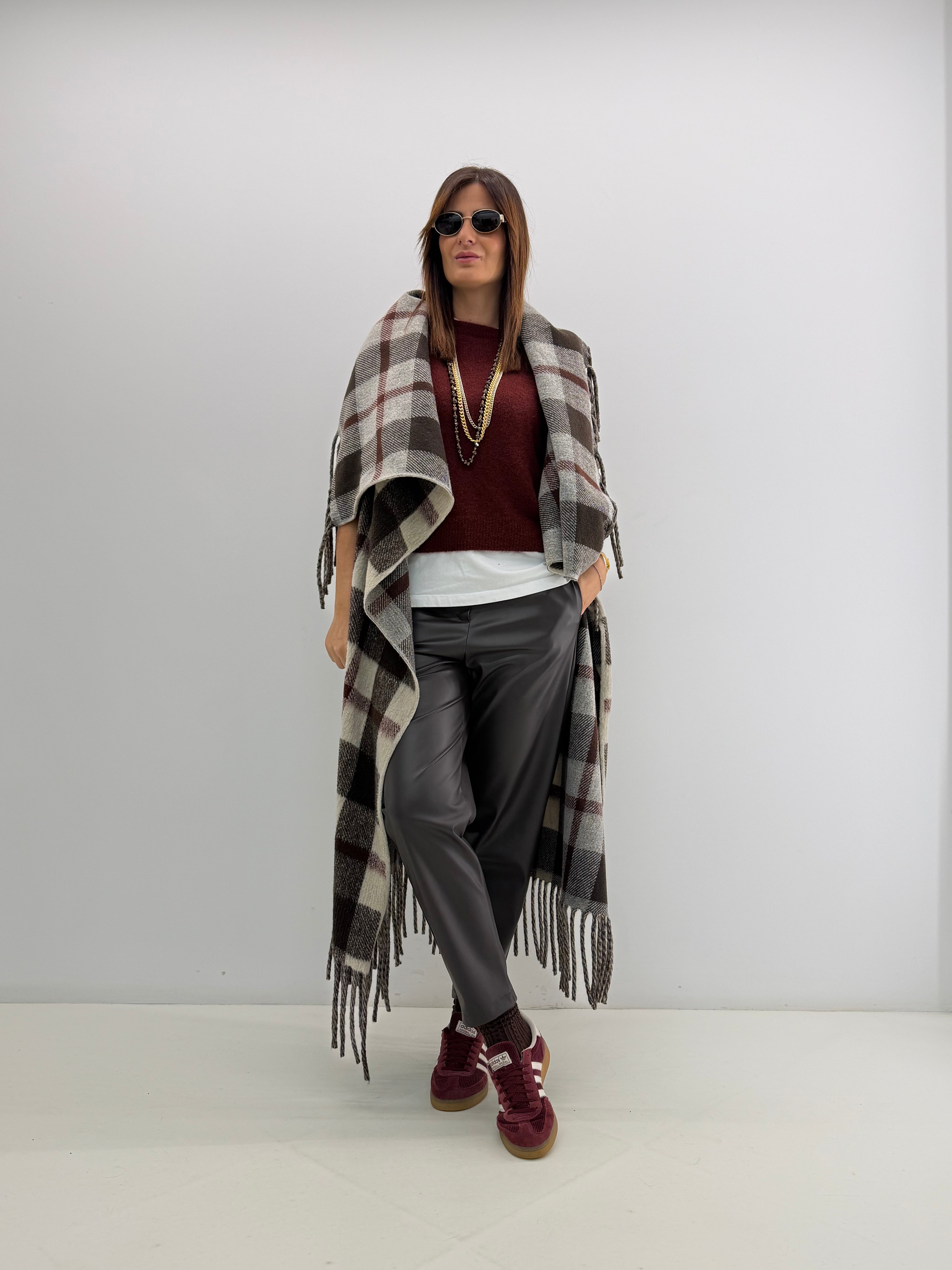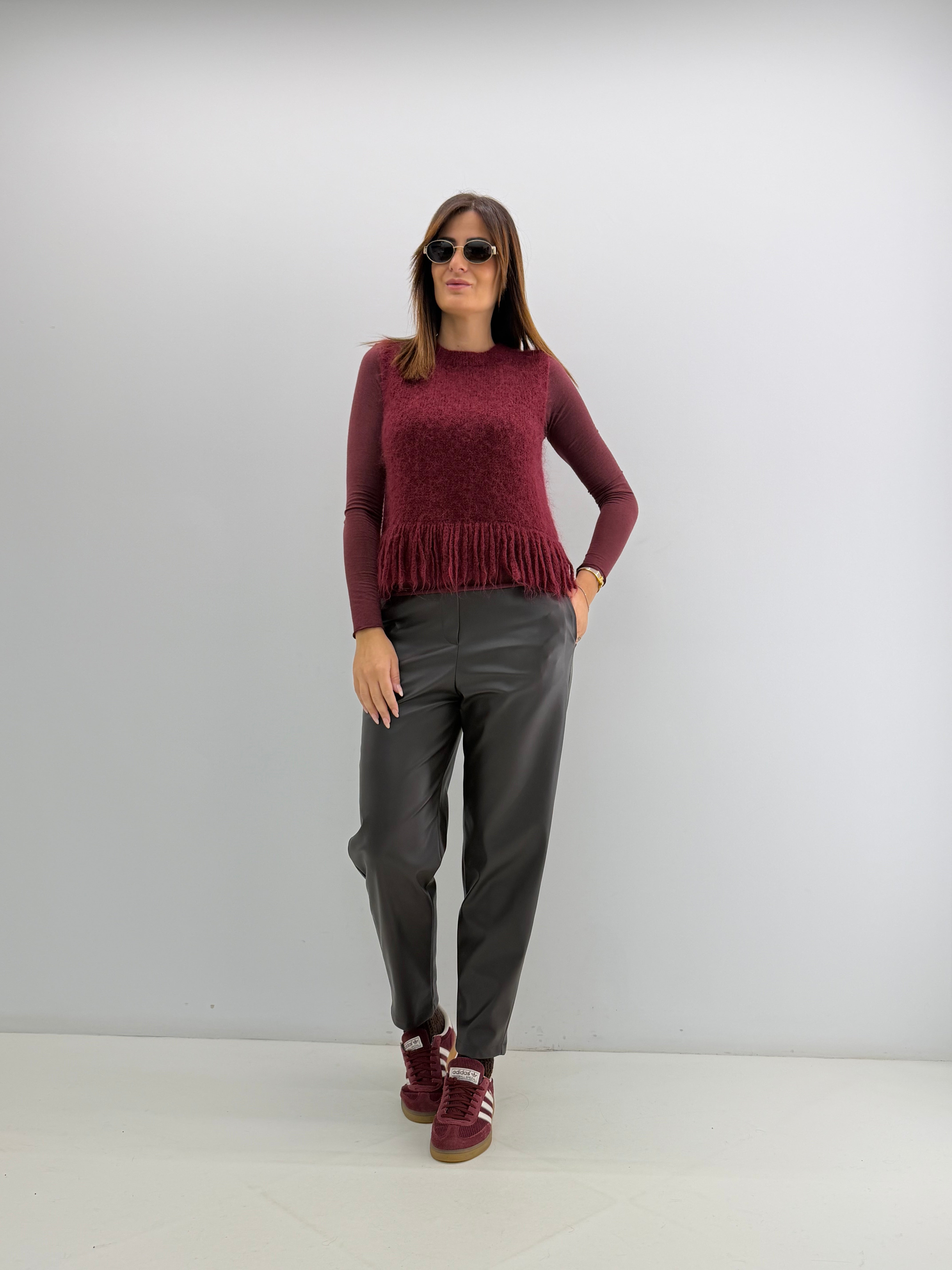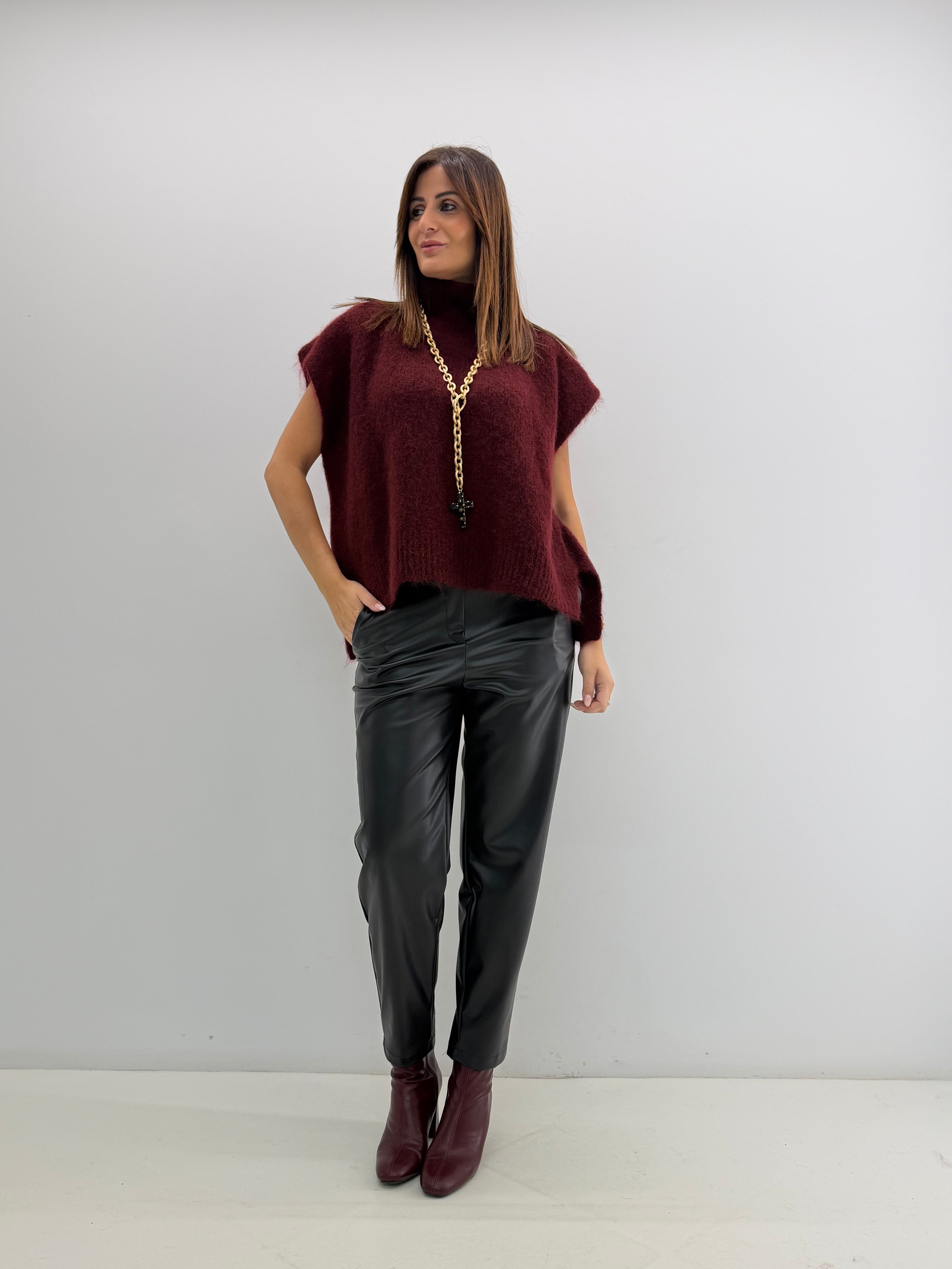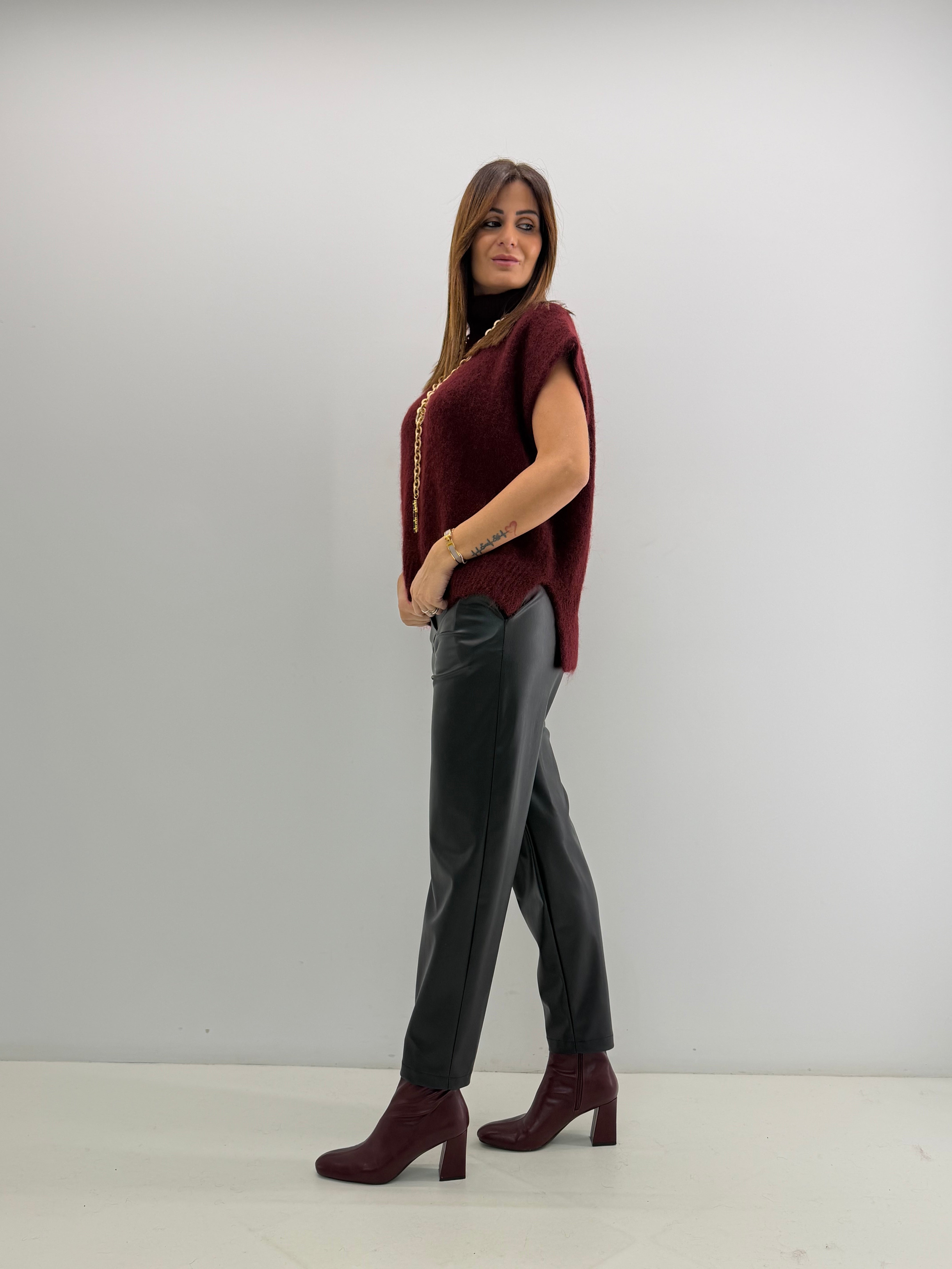 Pantalone in ecopelle, modello dritto, chiusura con zip e bottone, passanti per cintura. Vestibilità a taglie.