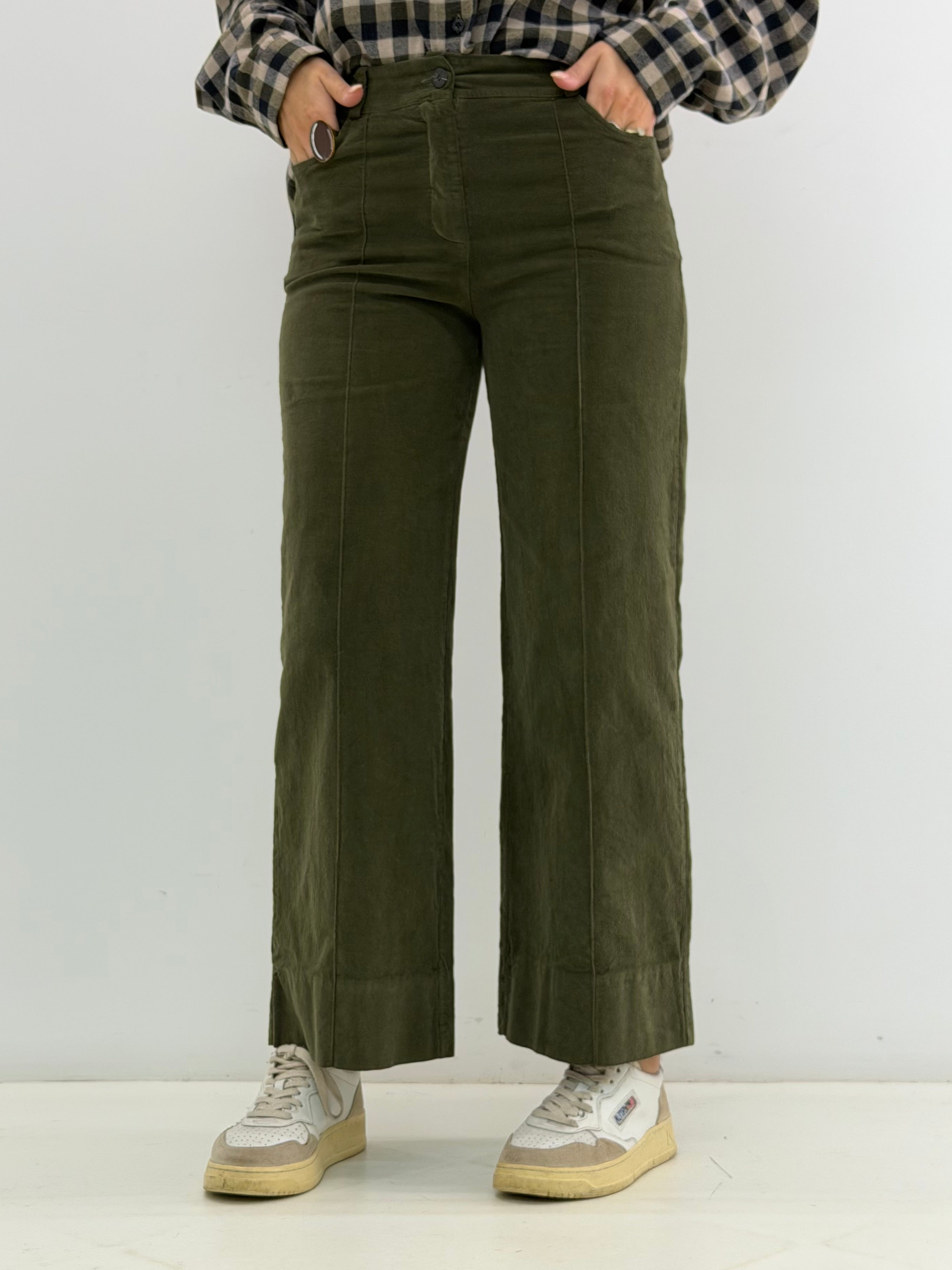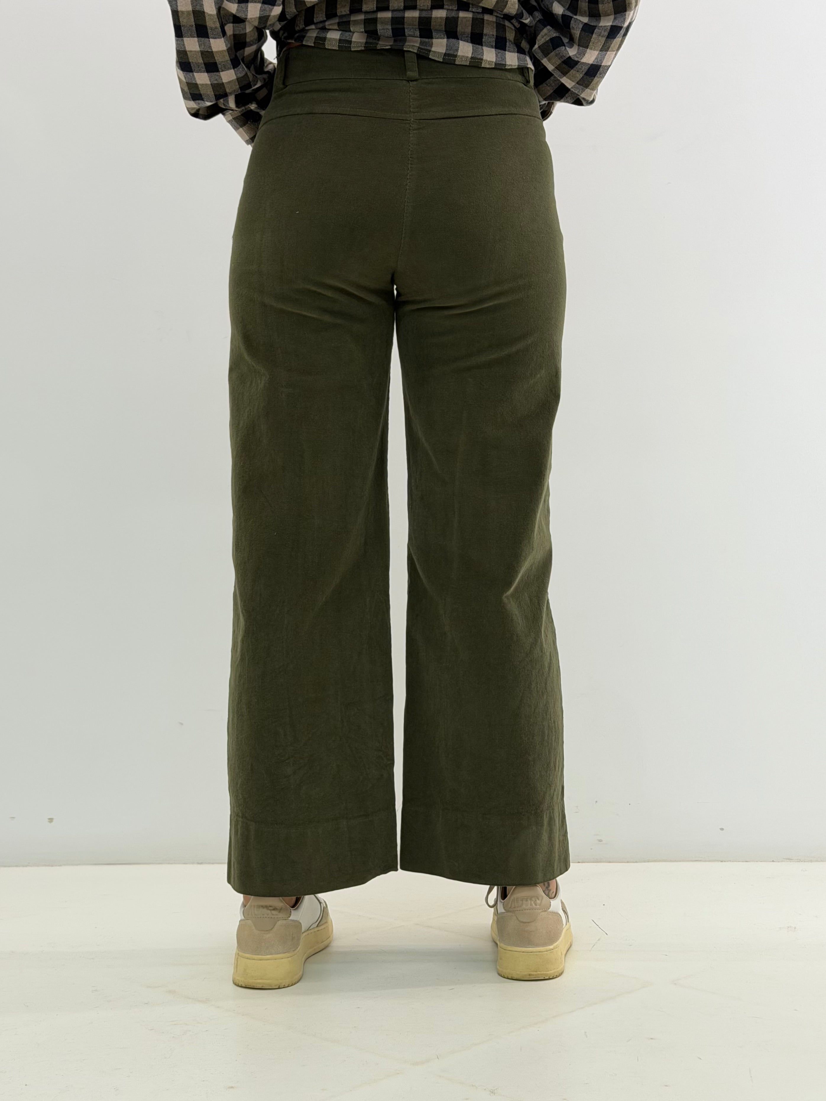 Pantalone in velluto a costine, tasche laterali a lunetta, chiusura con bottone e zip, passanti per cintura, modello a gamba larga. Vestibilità a taglie.
