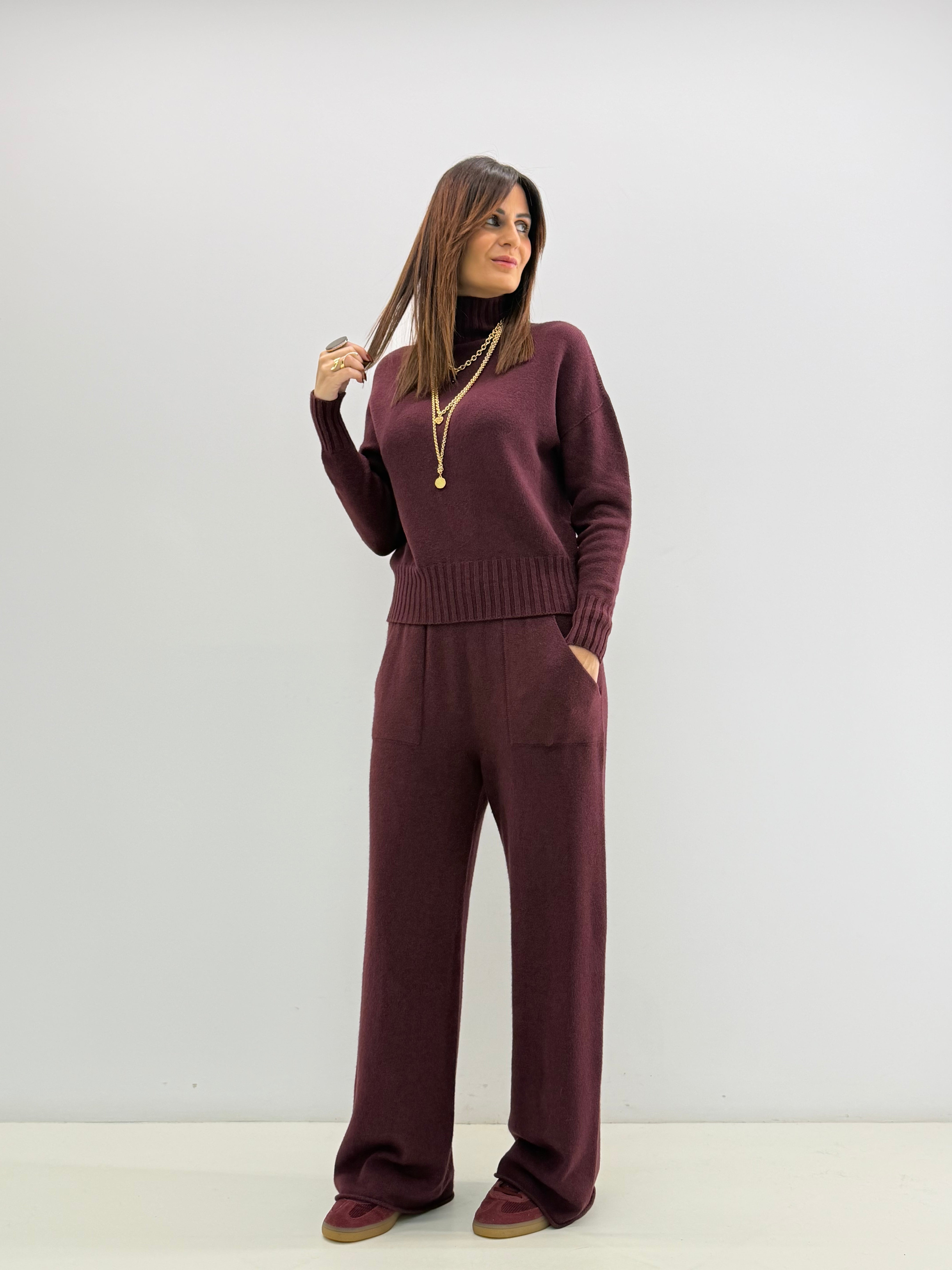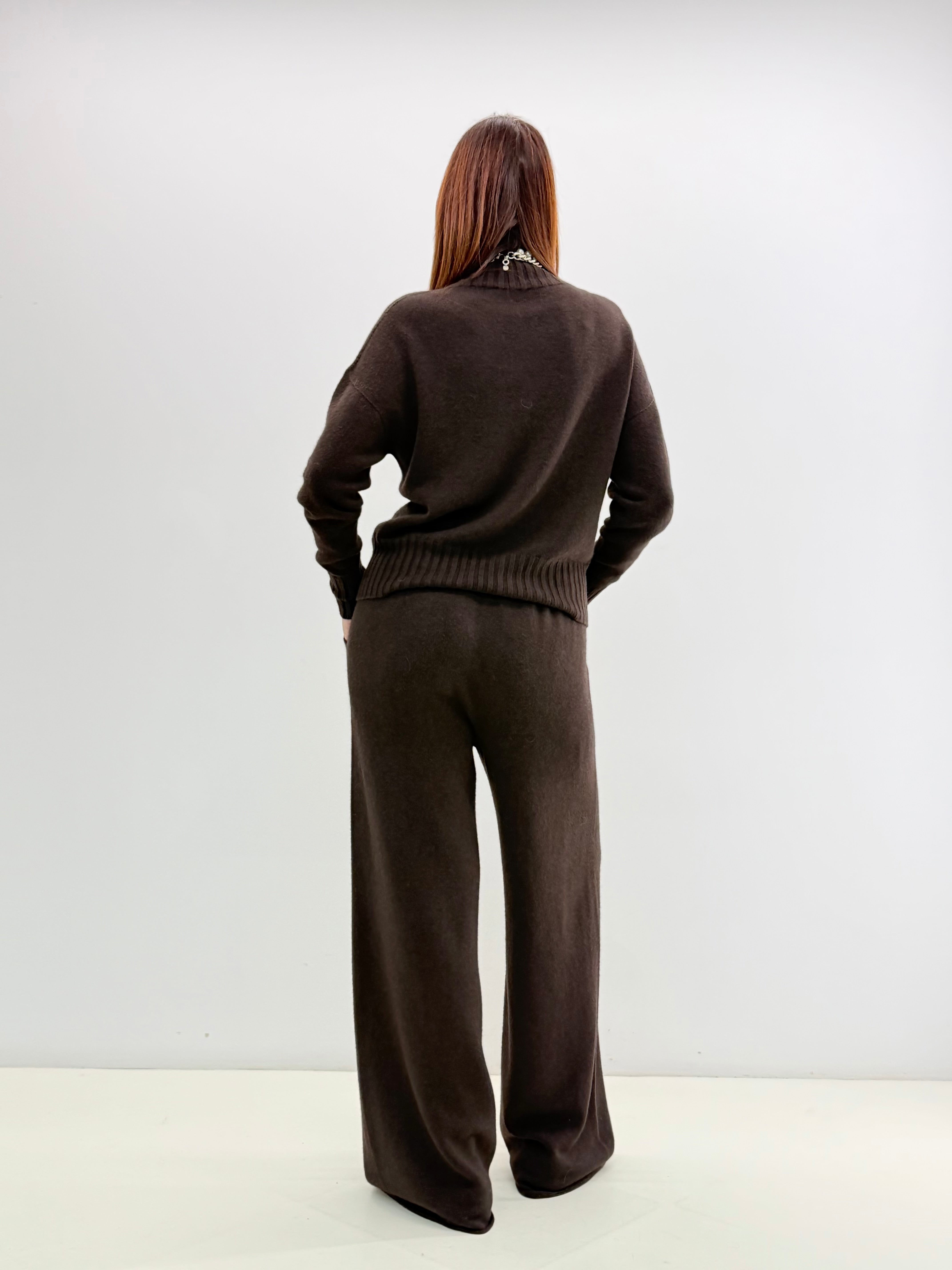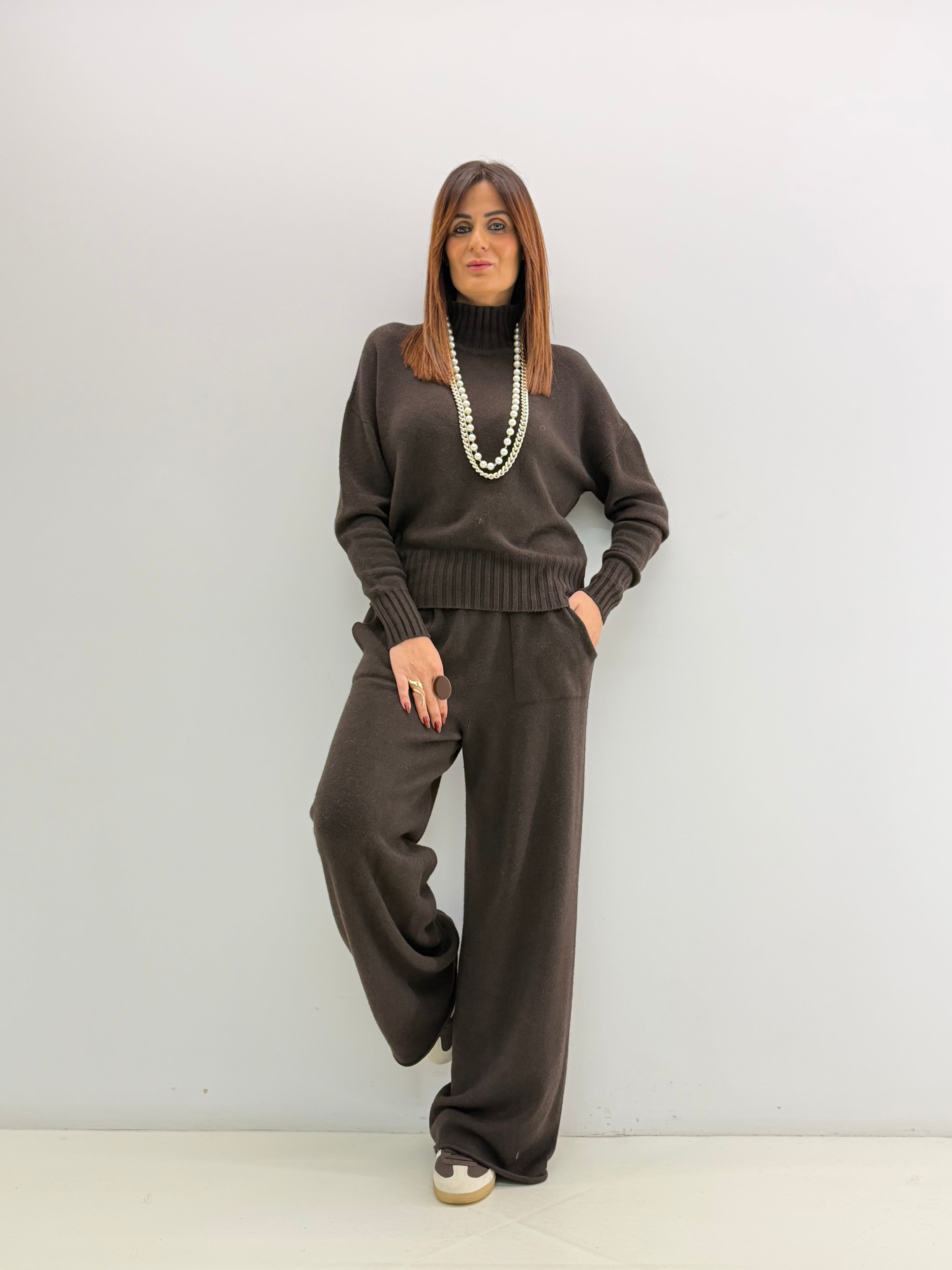 Tuta in maglia, pull con collo alto, pantalone modello a gamba larga con elastico in vita e tasche laterali a lunetta.