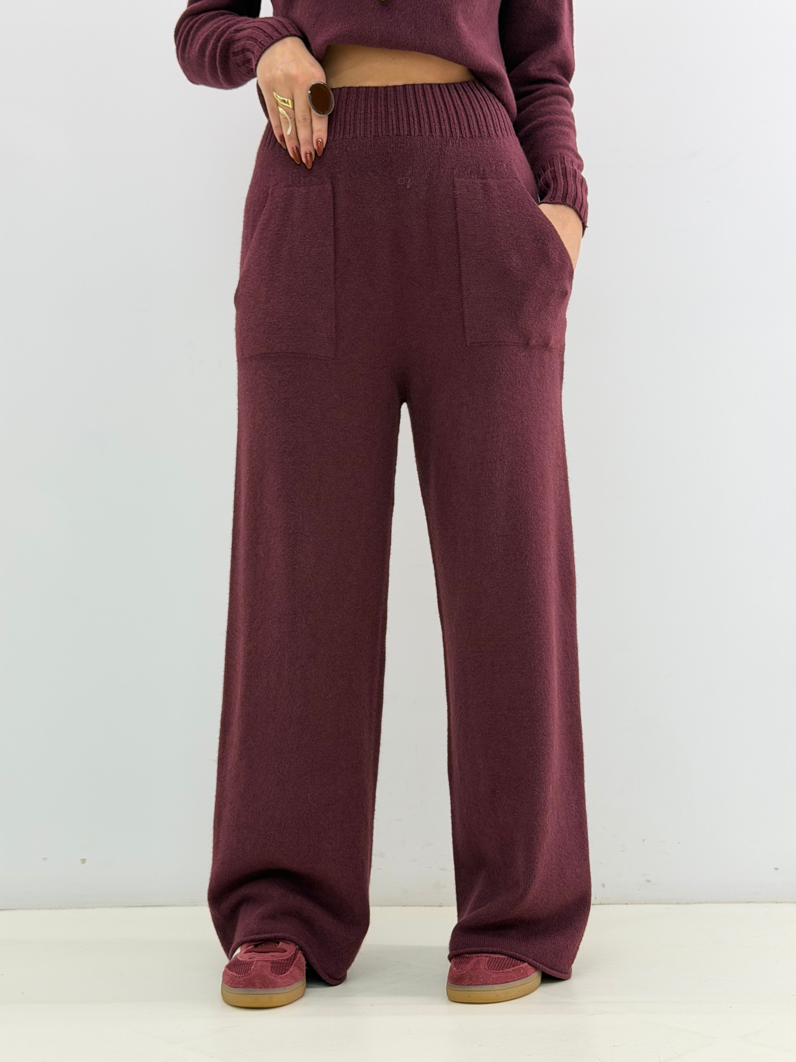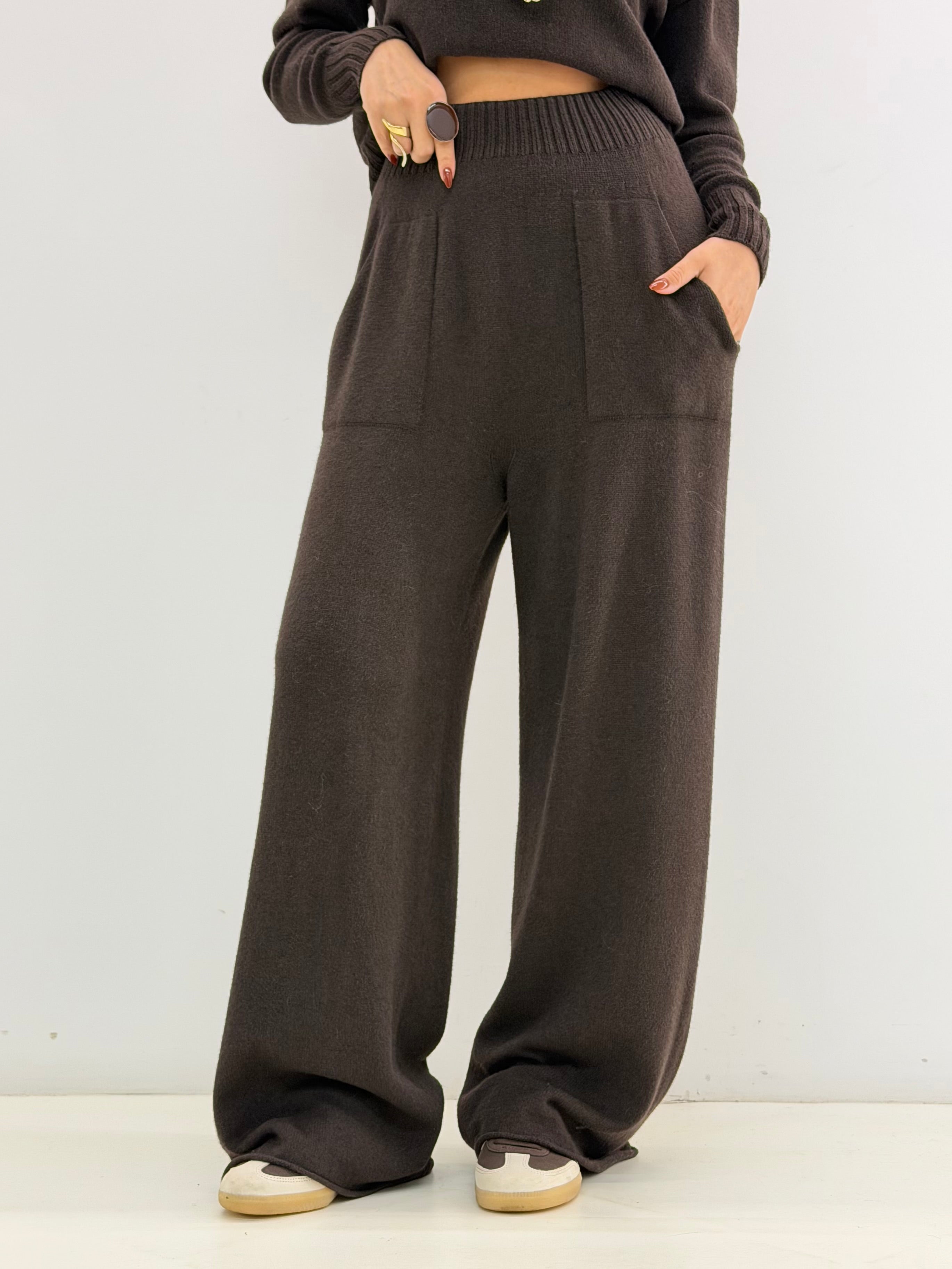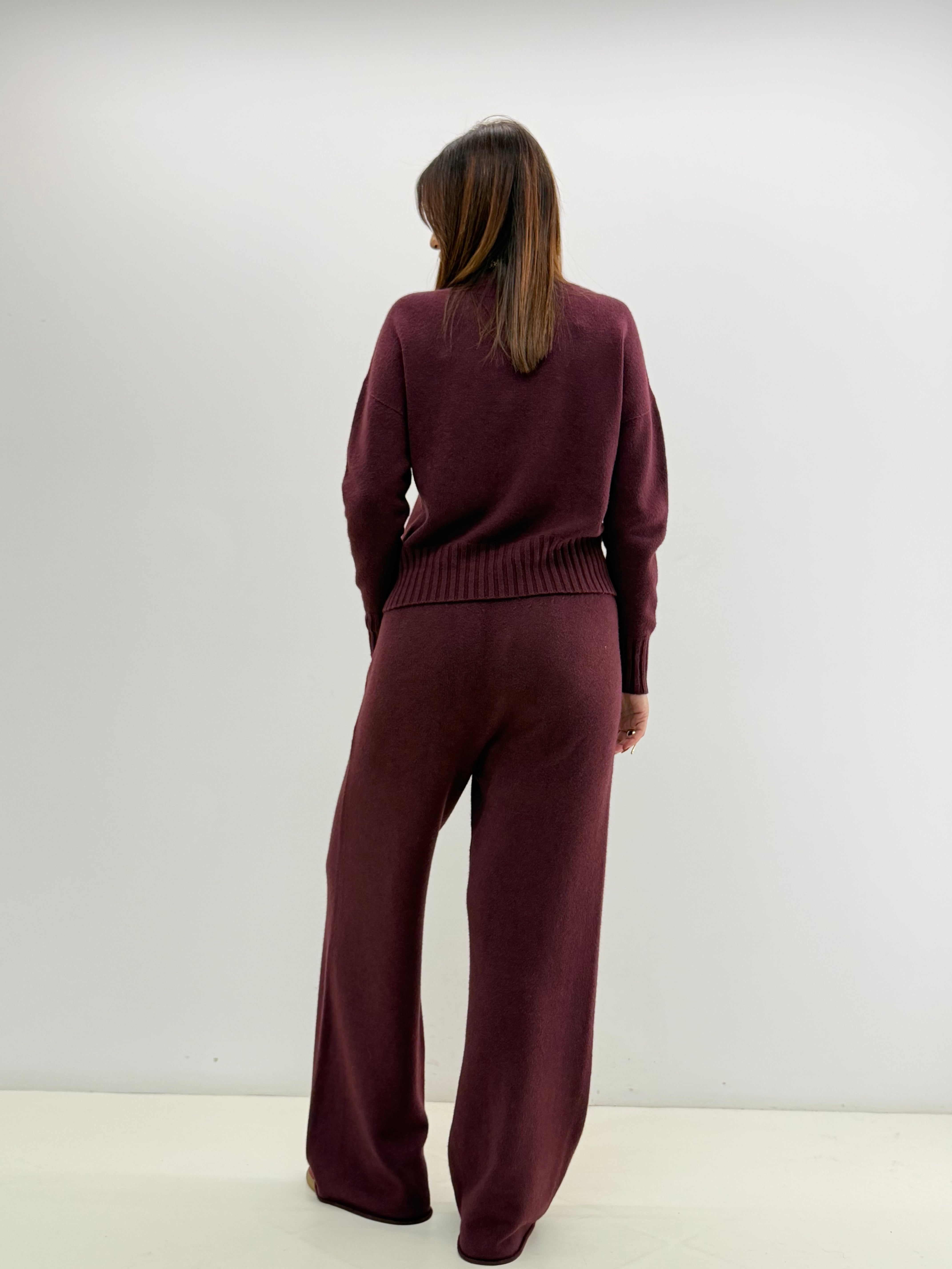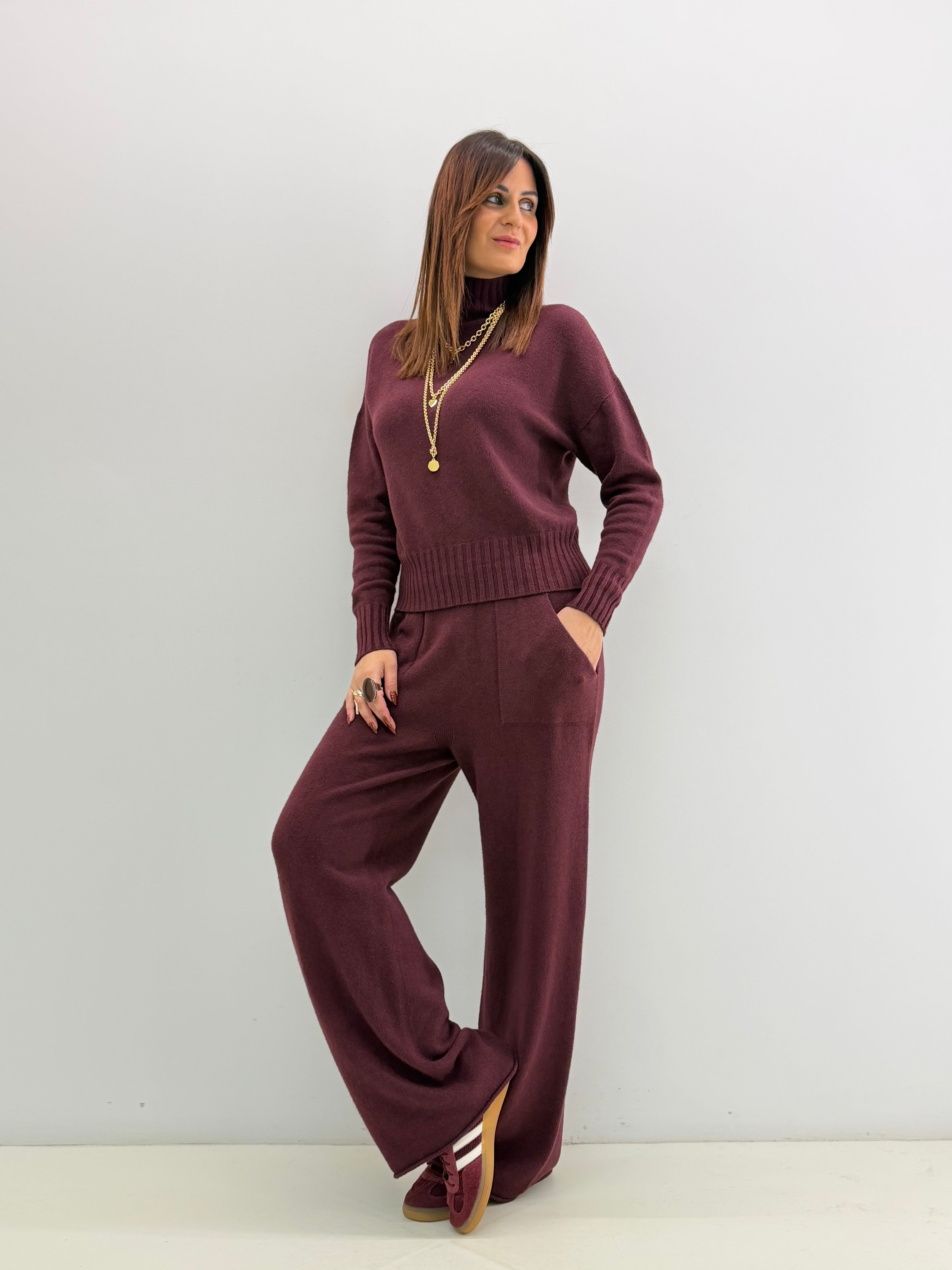 Tuta in maglia, pull con collo alto, pantalone modello a gamba larga con elastico in vita e tasche laterali a lunetta.